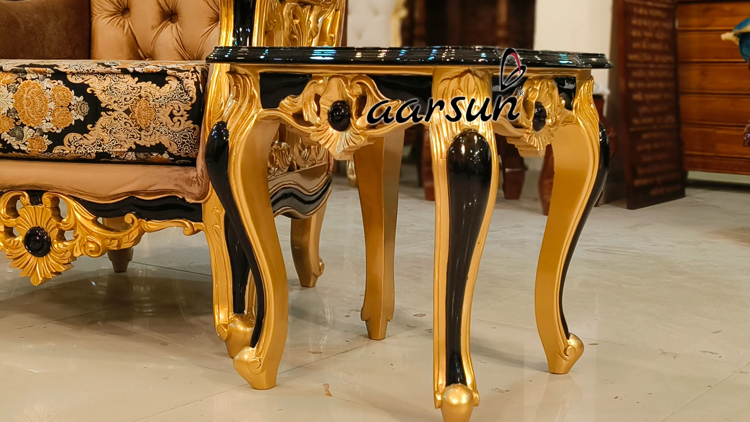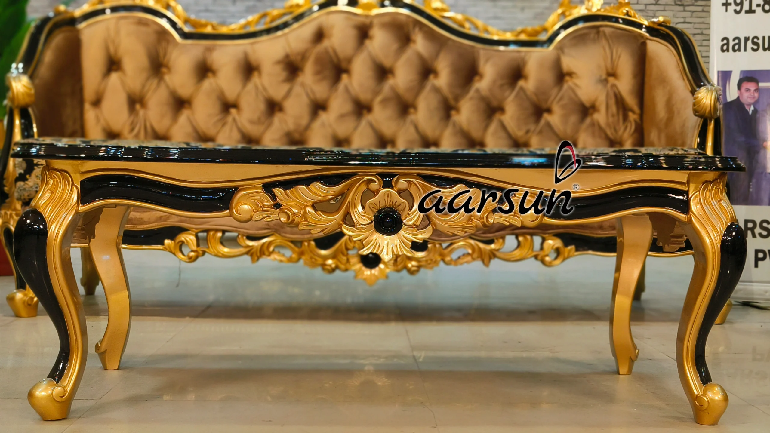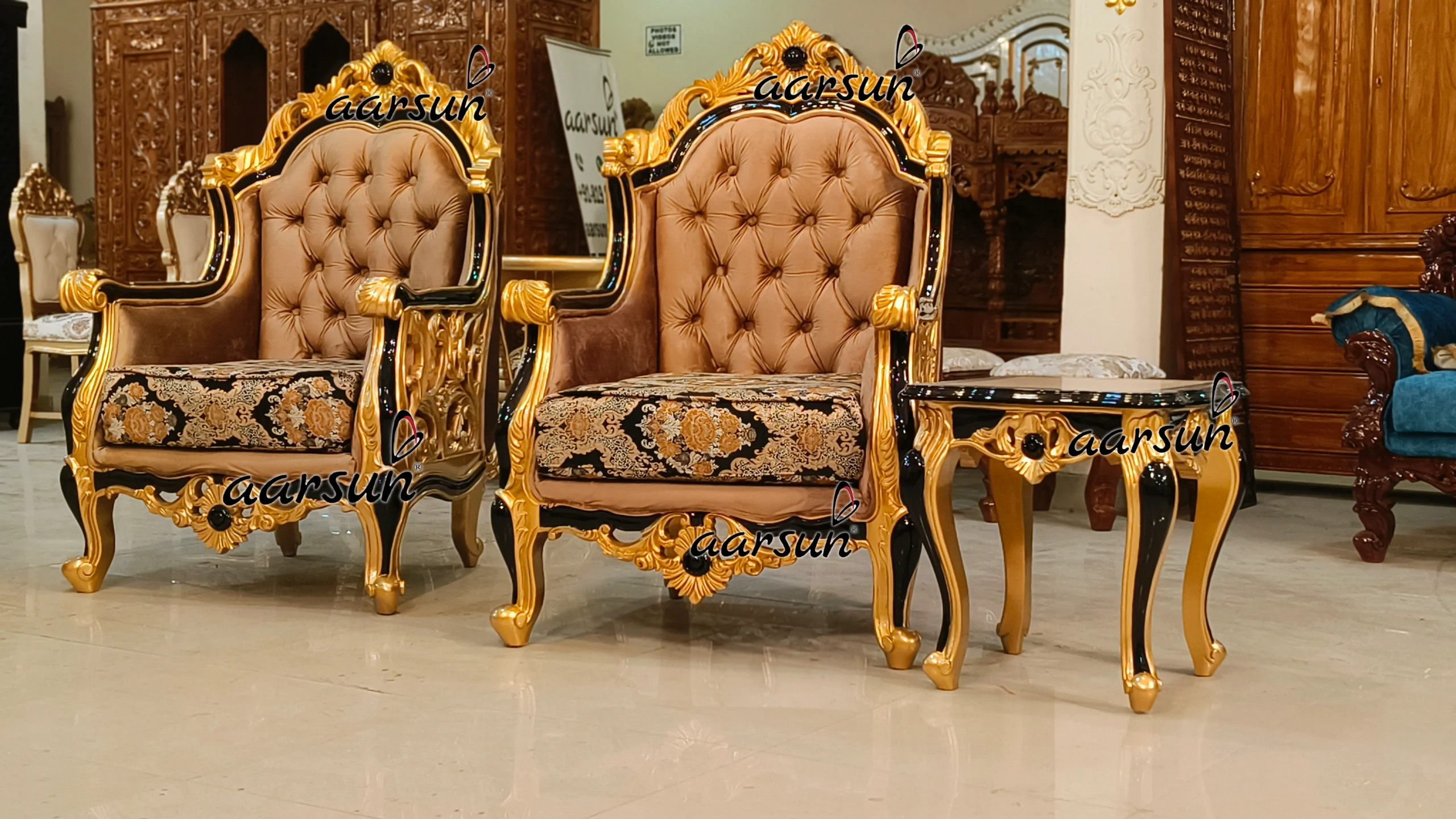 The side tables are also hand carved can be used as coffee tables too. The royal combination of black and gold paint is visible here which provides that luxurious look. The seat is adorned with the beautiful cloth material which uplifts the overall look of the sofa set.