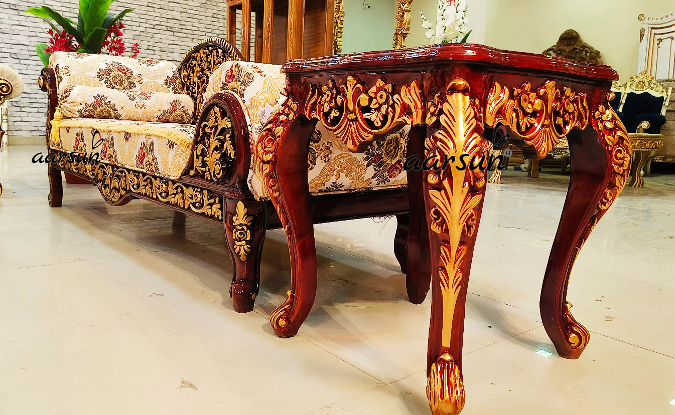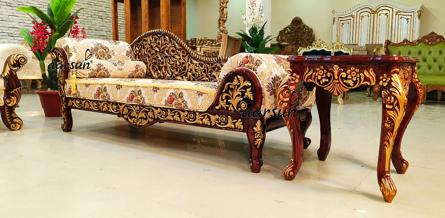 The chaise lounge, also known as a daybed, features wonderful carvings and a jaali carved pattern on the back. The set is complete with a center table and two side tables, serving both functional and visual purposes. The set is luxurious with its dark polish and golden highlights, and its demask floral pattern fabric with tufted quilting gives a touch of elegance. For more sofa set designs, please check our “Sofa Set” category.