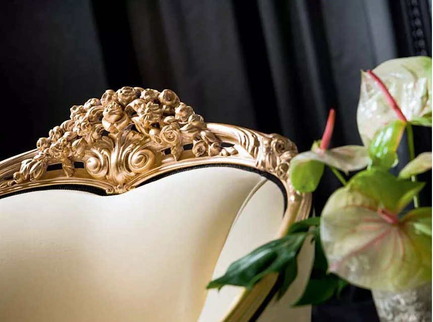 - Floral woodwork polished in Gold shade with comforting upholstery