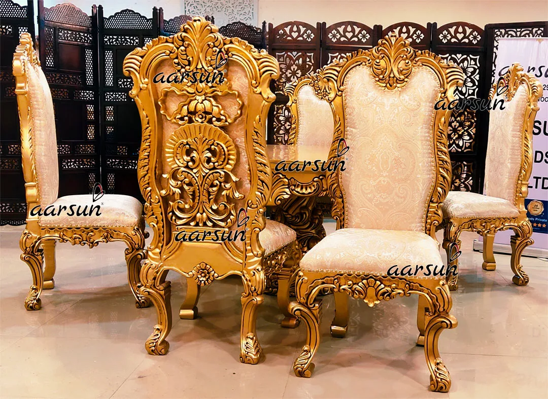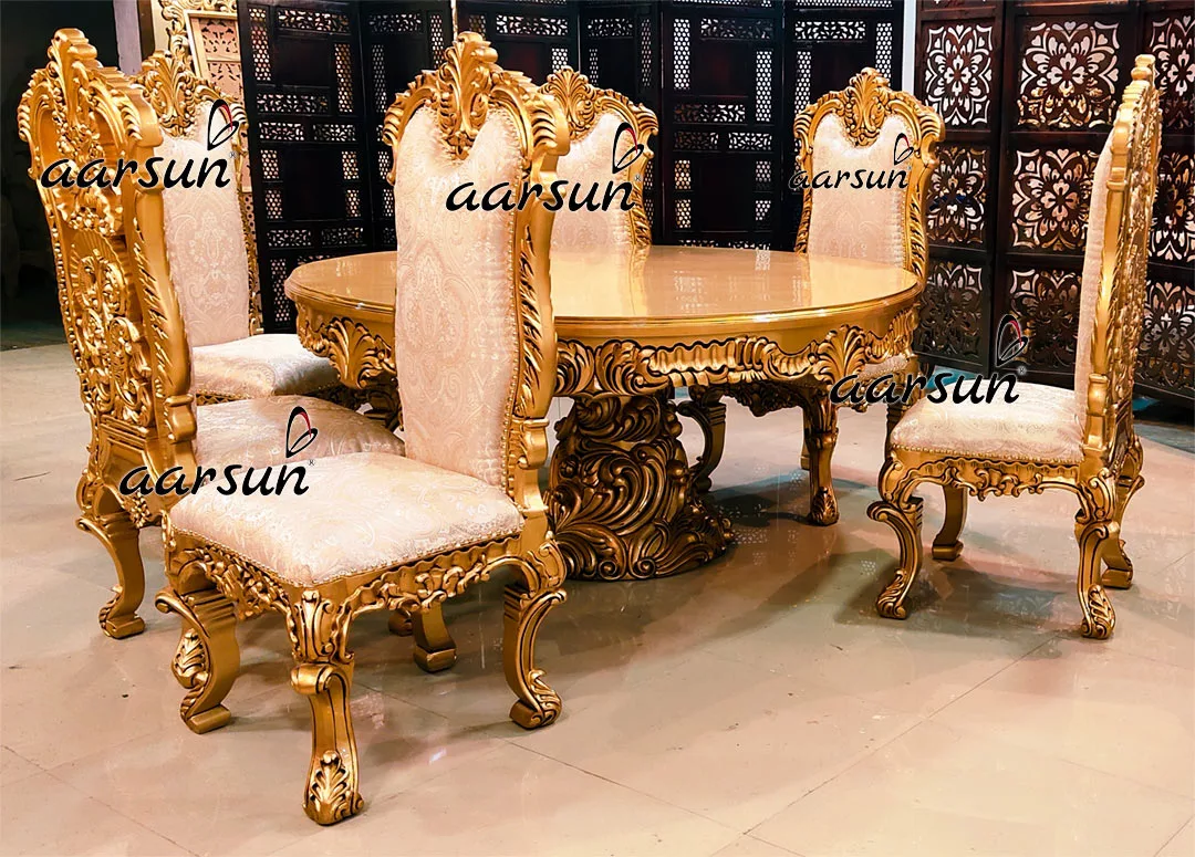 Aarsun brings 6 seater round luxury wooden dining set made in teak wood with antique gold paint. The detailed carving of the dining chairs looks beautiful and makes this dining set unique. It is also durable and has premium quality and superior craftsmanship.