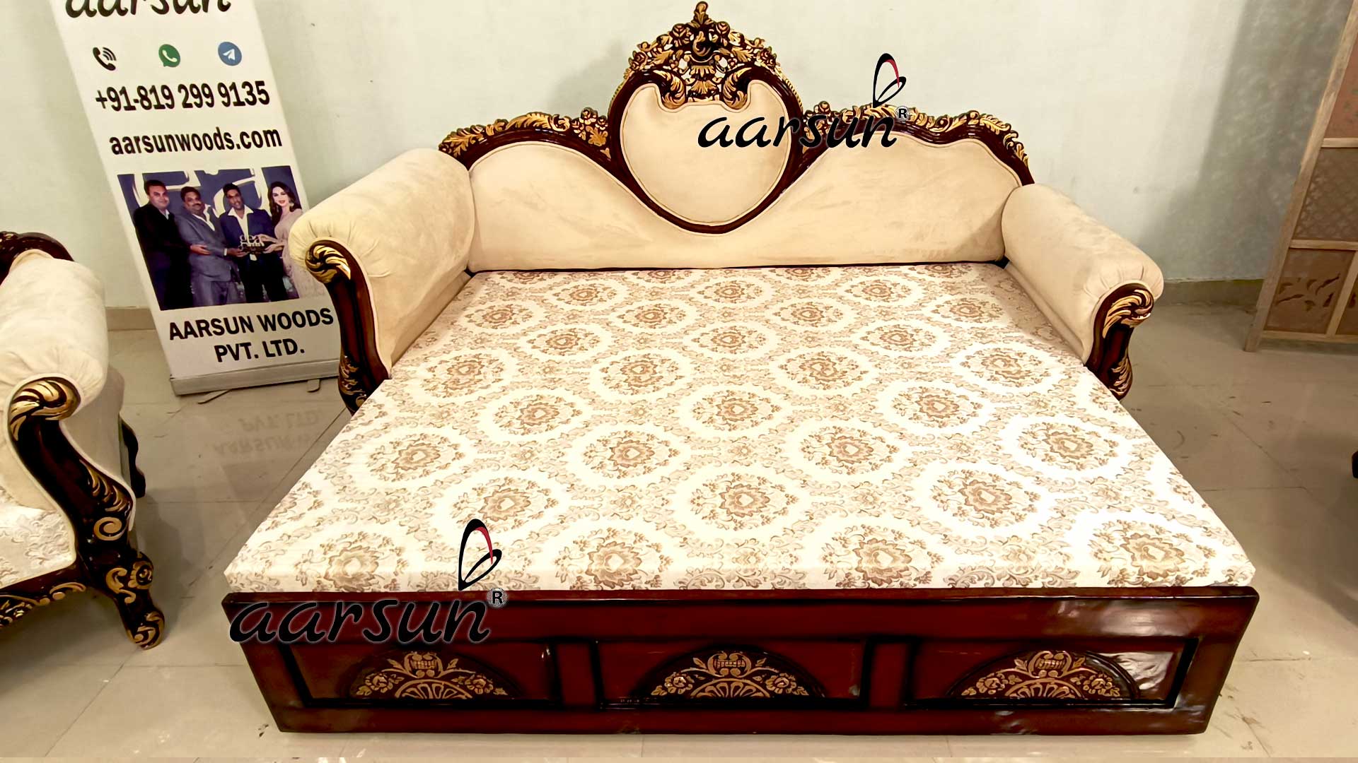 “description”: “Luxury Sofa cum Bed living room set by Aarsun for extra sleeping space as and when you require. We at Aarsun can customize each unit as per your specifications to achieve one-of-a-kind luxury experience for your family and friends.”,