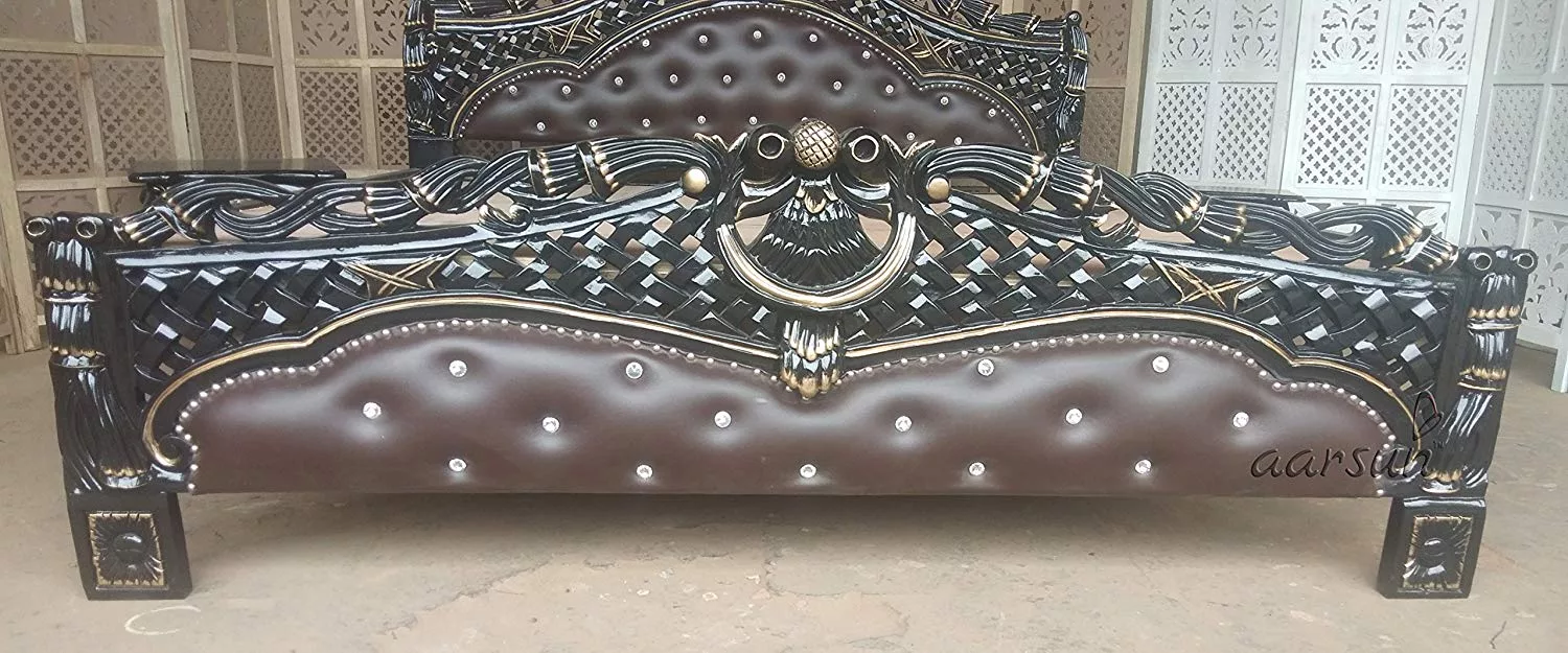 Aarsun brings to you a Carved Luxury Teak-wood bed for your bedroom. It has an elegant design that enhances the interior decor of your bedroom. The upholstery of this bed makes it very comfortable to sit while the floral carving back gives the traditional look to the set. The front base consists of floral carving similar to the upper back.