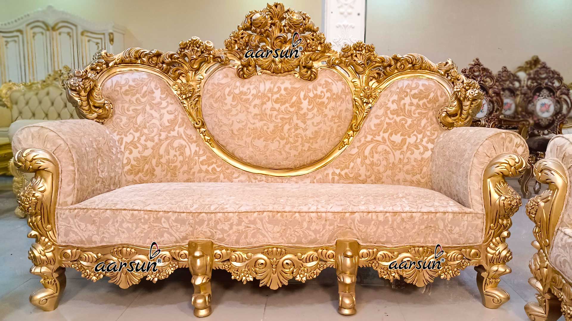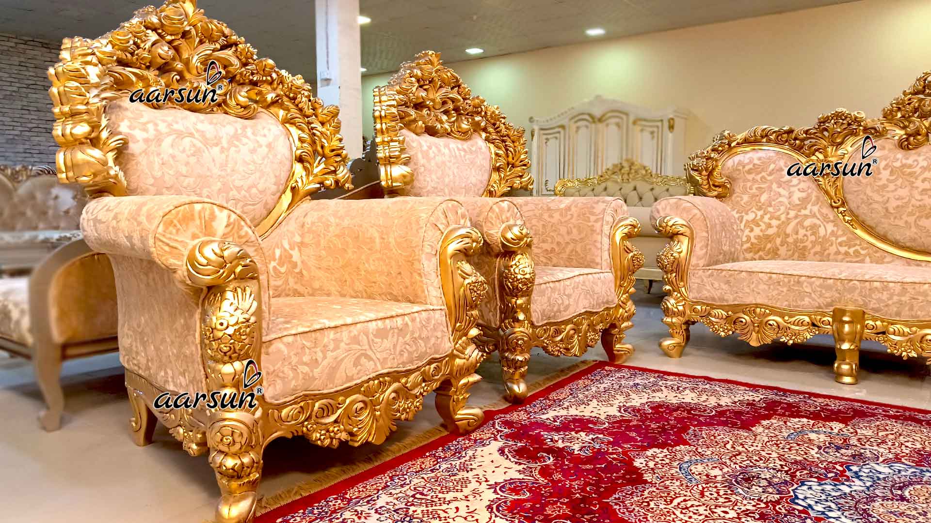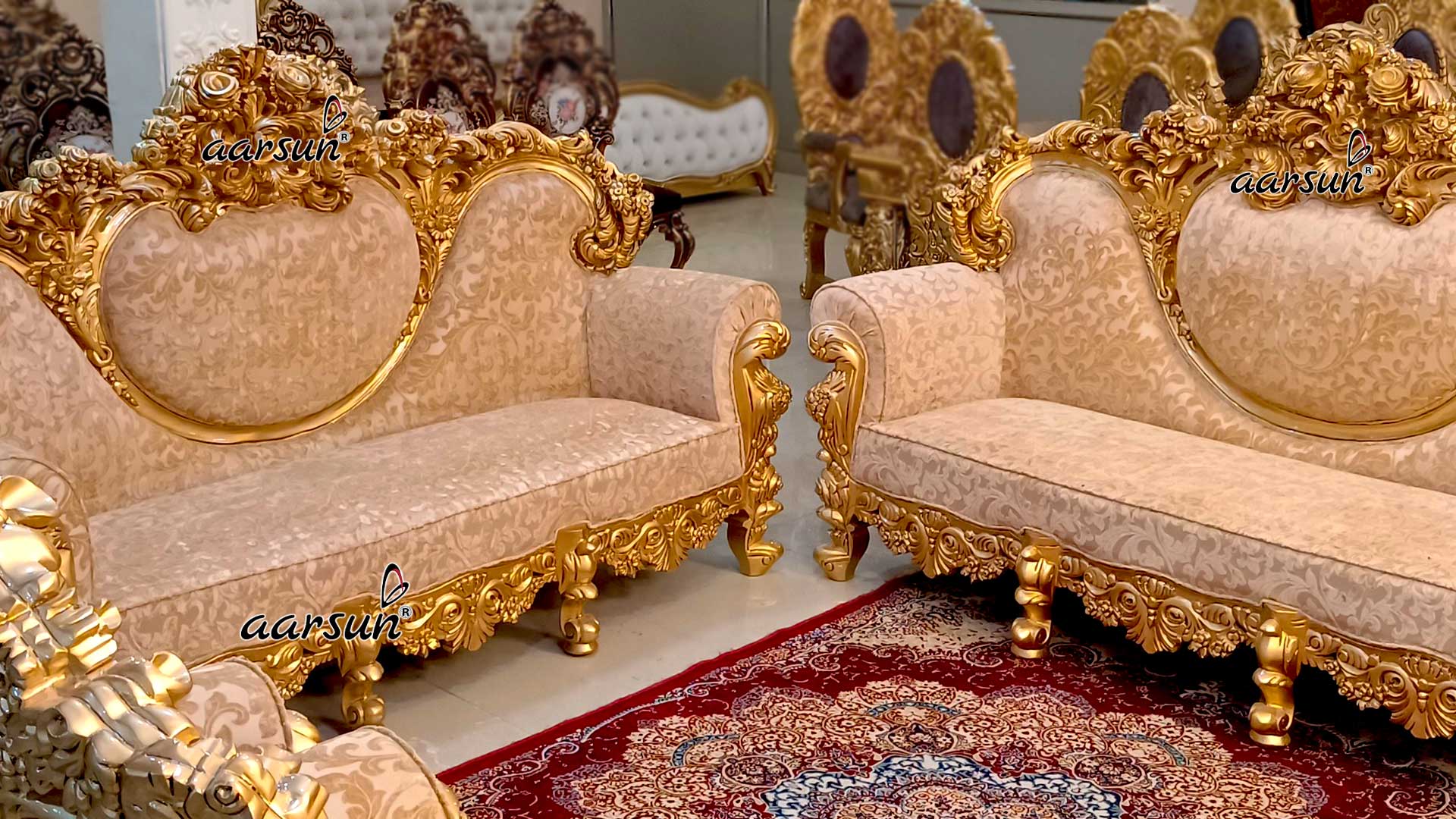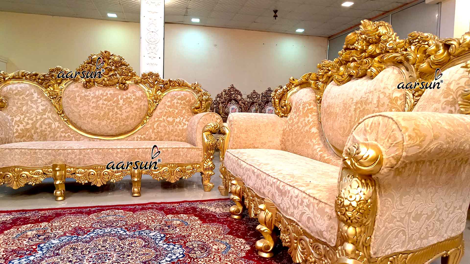 Overall, the Maharaja Sofa Set in Solid Teakwood with Antique Gold Paint is a stunning piece of furniture that exudes luxury and sophistication. Its unique and elegant design is sure to add a touch of grandeur and opulence to any living space.