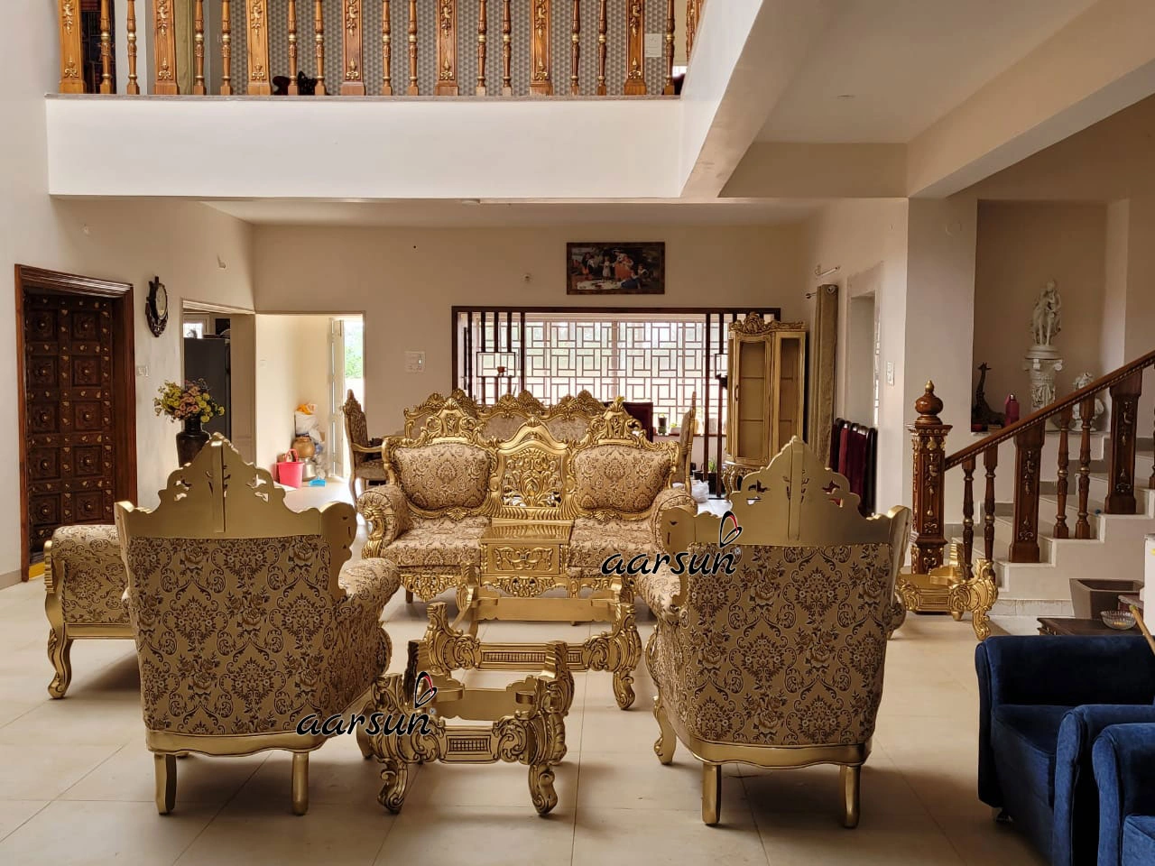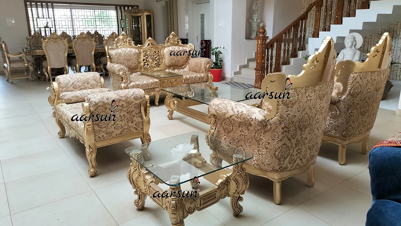 Home / Sofa Set Design Modern Latest & Trending designs / Majestic Wooden Sofa Set with Ornate Gold Finish Majestic Wooden Sofa Set with Ornate Gold Finish Call for Best Price WhatsApp Global DeliveryFree Shipping In IndiaAvail GST Credit on Business PurchaseLets have a look at Our Happy CustomersRated 4.8 out of 5 based on 451 customer ratings451 Google reviews SKU: SFST-407 Category: Sofa Set Design Modern Latest & Trending designs Tag: Buy Antique Style Sofa Set in Austria Brand: Aarsun Description Description Related products Sale! Fully Carved Couch Royal Sofa Set YT-146 ₹271,399 Original price was: ₹271,399.₹182,900Current price is: ₹182,900. Add to cart Designer Wooden Sofa Set 3+2+2 Seater YT-117 Read more Wooden Dazzling Sofa Set for Living Room SF-0071 Read more Fully Carved Classic Sofa Design YT-225 ₹123,900 Add to cart