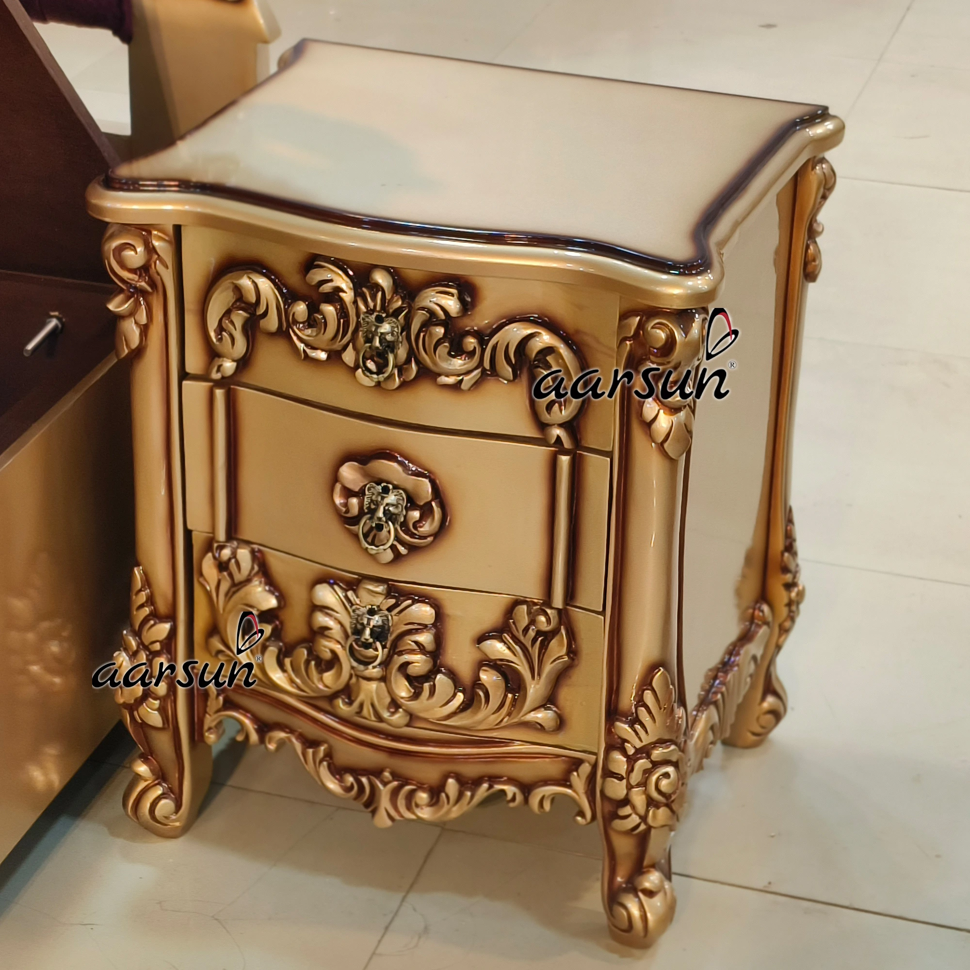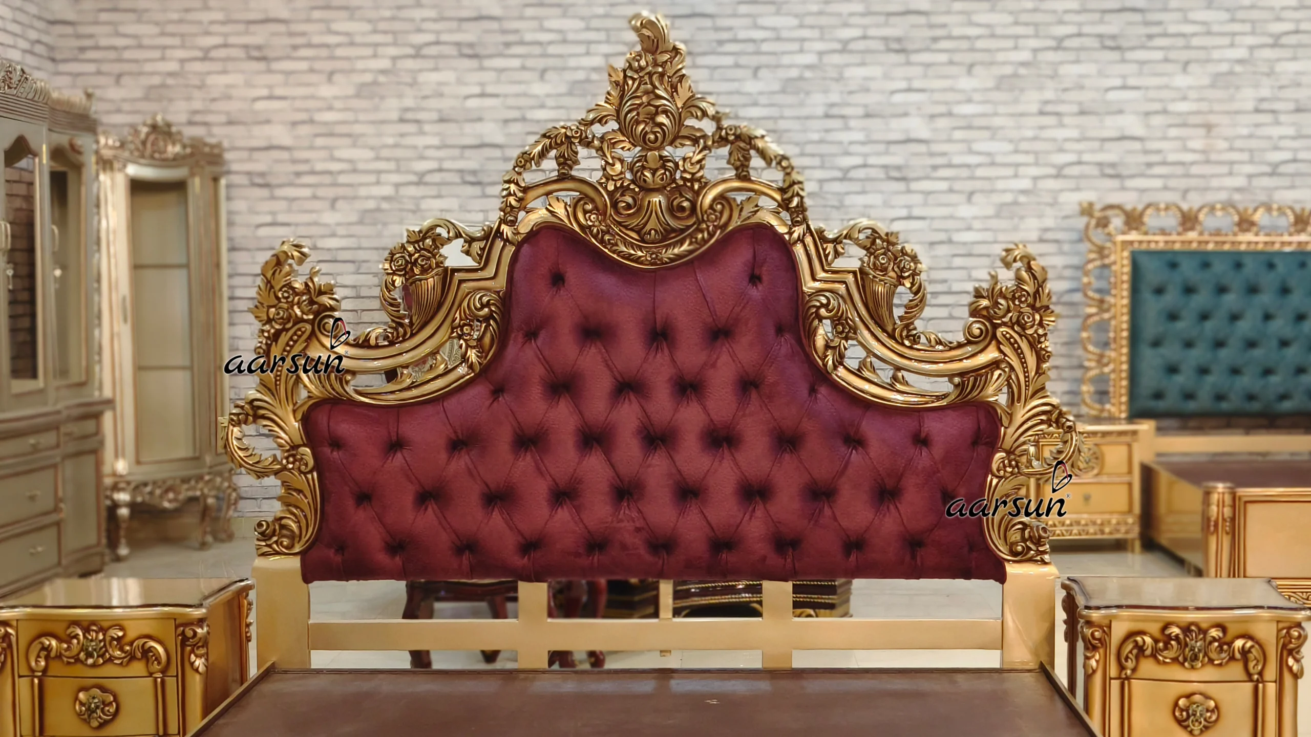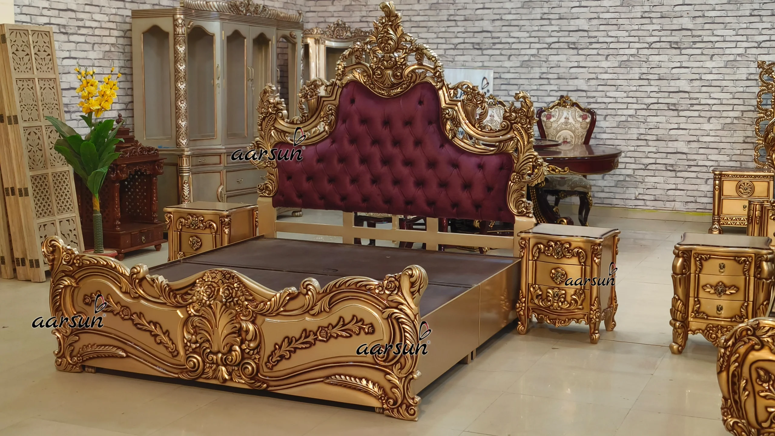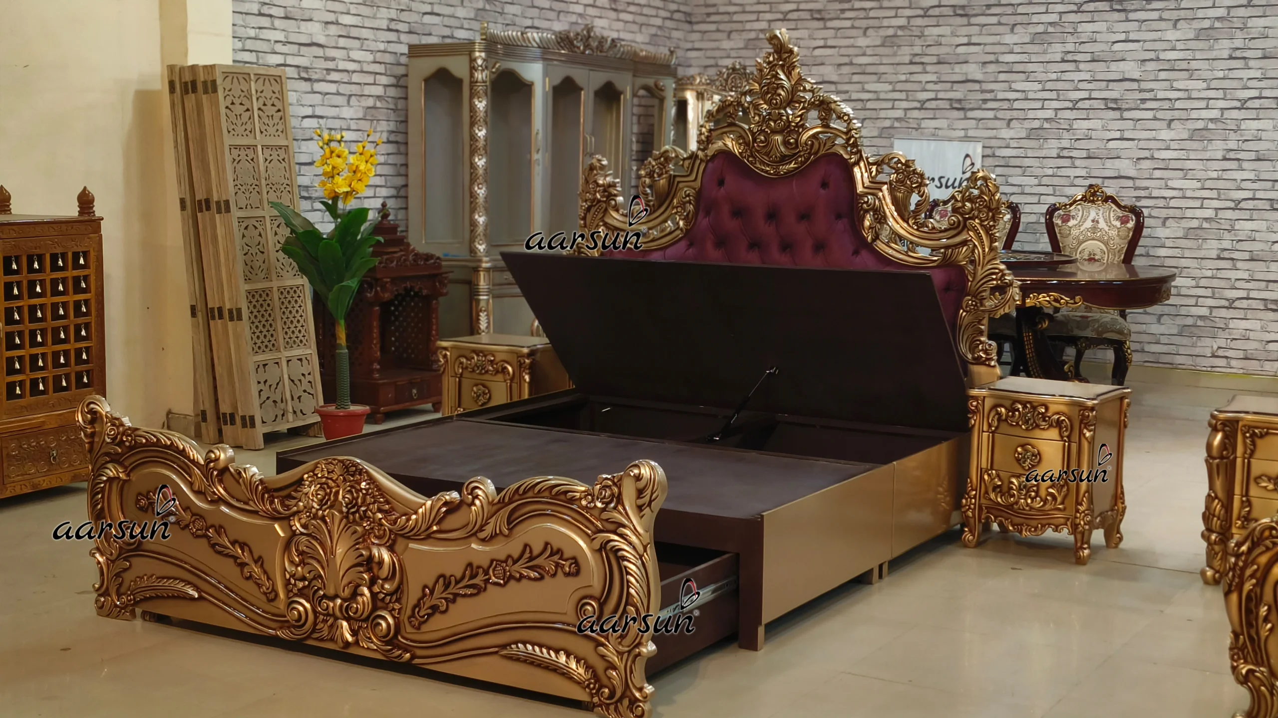 Aarsun presents a Modern style bed with two different storage. A bed that is grand in look, with a heavy headboard and footboard, shows the true craftsmanship work. The bed back is quilted and cushioned well for more comfort. This bed has a front storage, easy to pull out and push inside. This unit has wheels underneath for easy movement. This bed is made in premium quality teak wood. With a heavy headboard and footboard, this bed is grand in look. The bed is made of two different storage boxes in plywood. There are two side tables with three pull-out drawers for keeping daily essential items phone charger, car keys, home keys, notepad, etc. This bed is beautifully carved and has floral leafing designs on it. With Antique gold paint, every carved out design looks visually appealing. Every design comes out clear with an antique gold paint, which is the specialty of royal furniture.