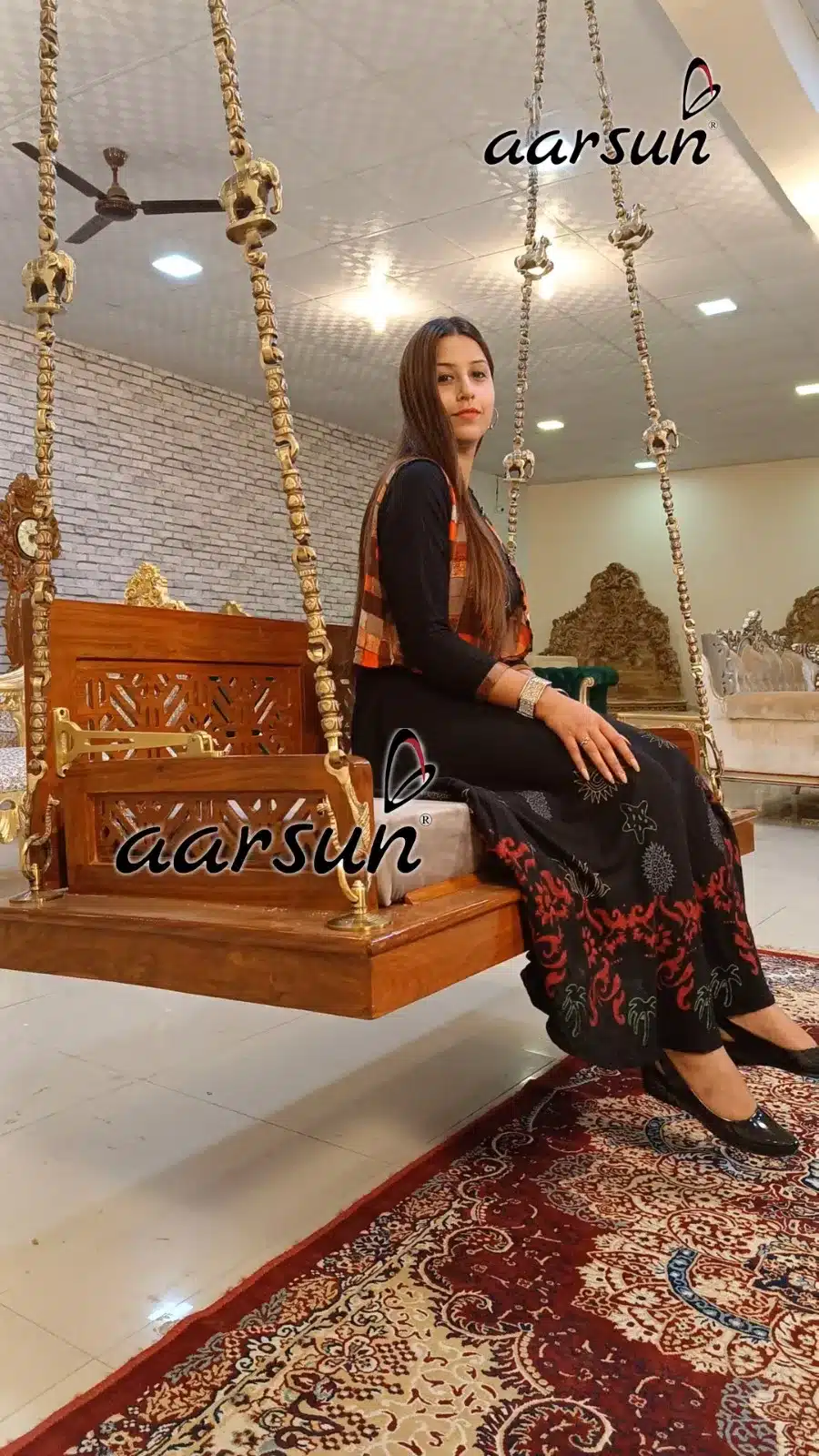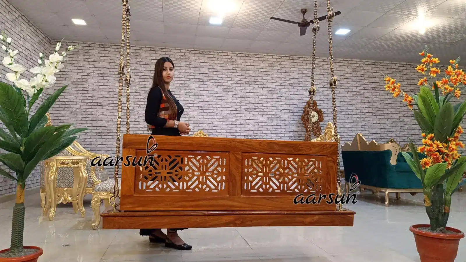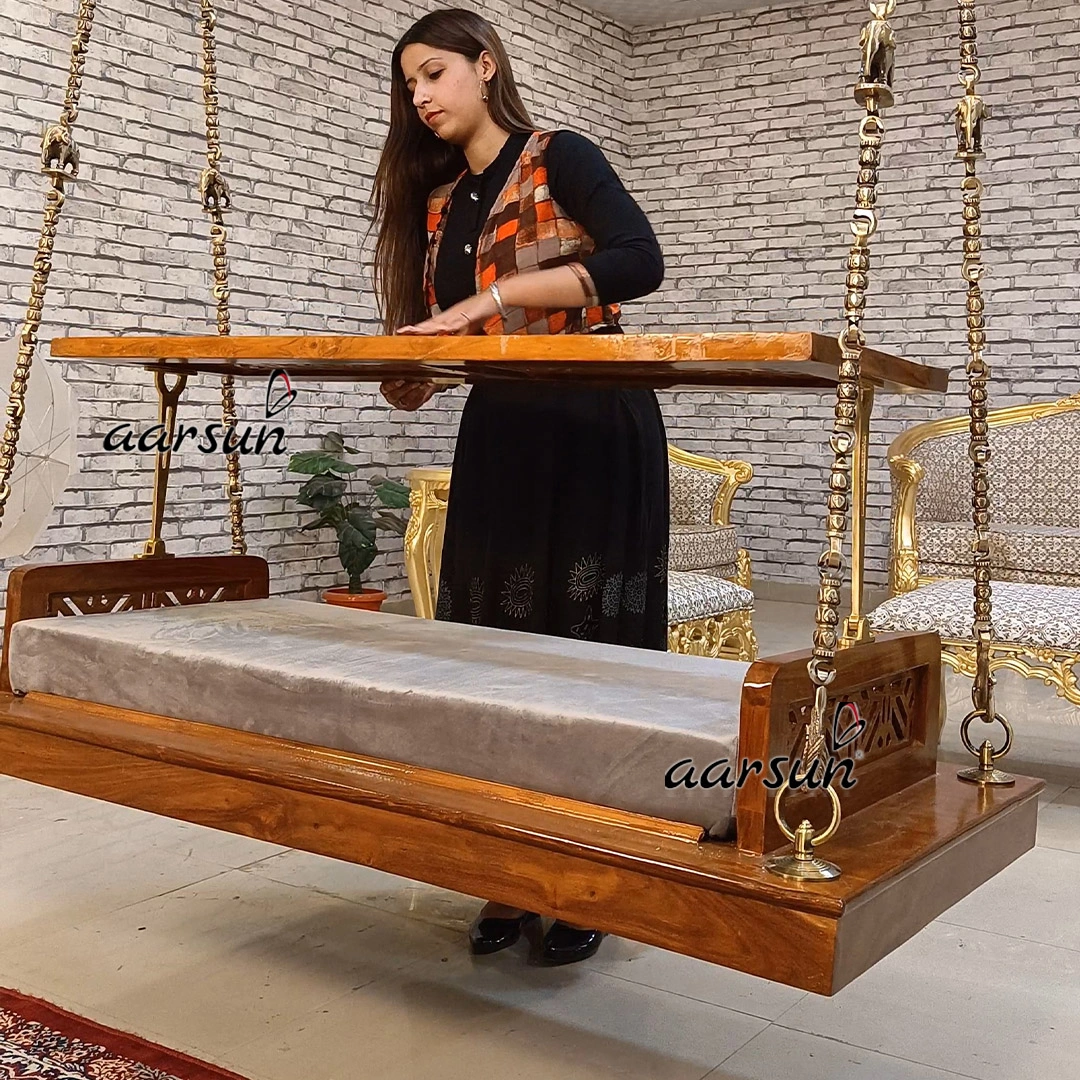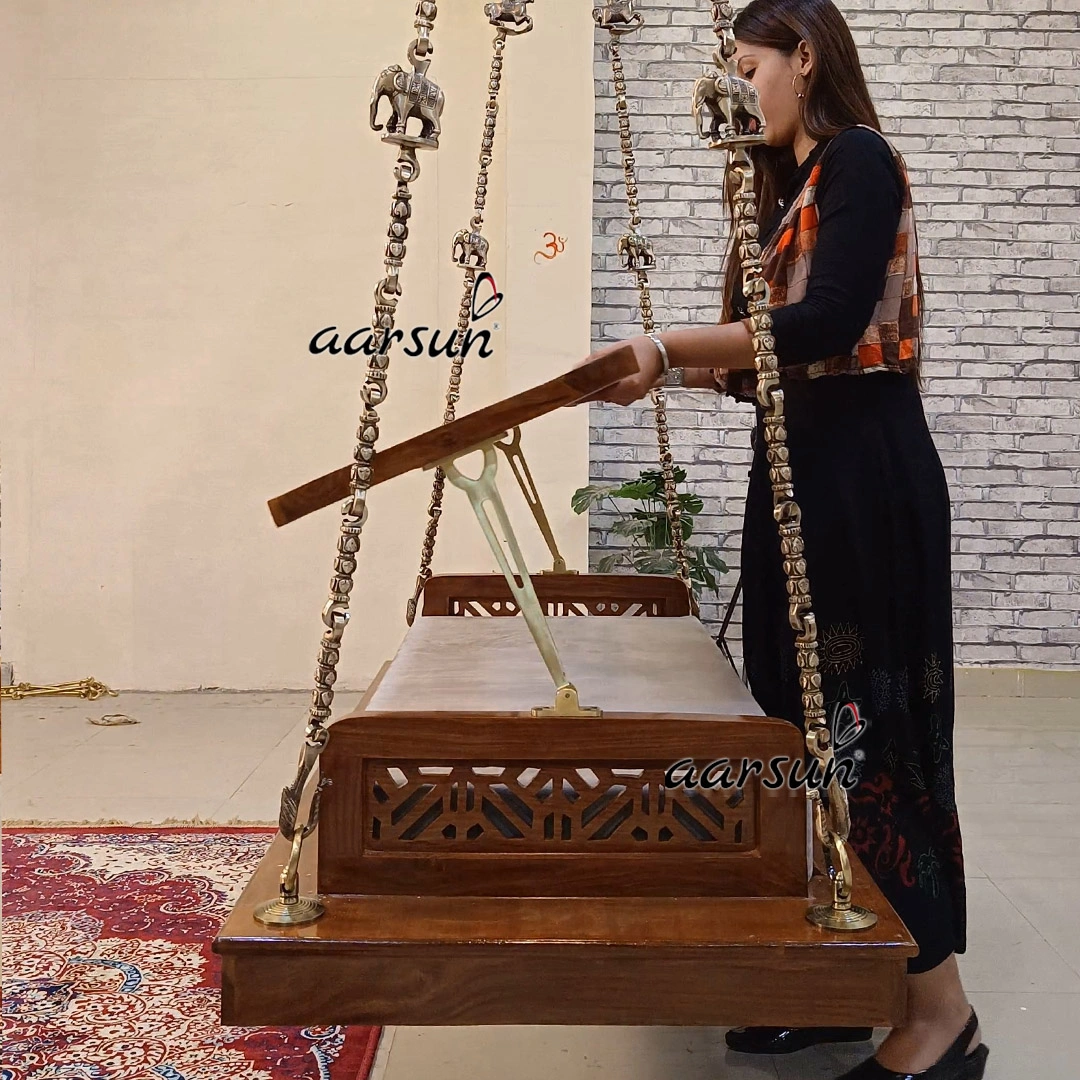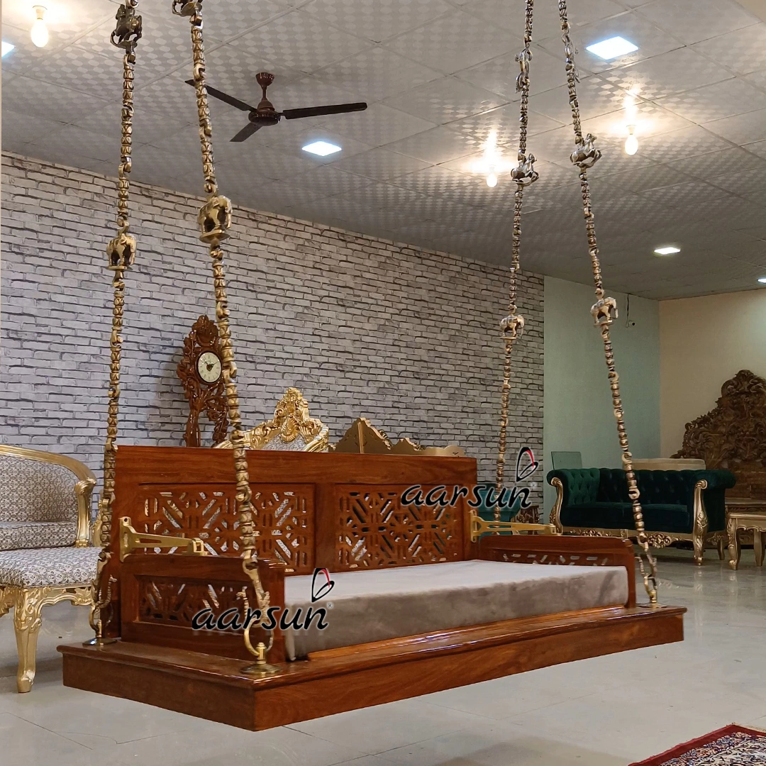 Wooden seat that is available in custom size as per requirement and with options  in fabric colors as per end user liking. Solid brass chain, one of the most decorative brass chain options available globally. Aarsun is an International trademark registered in 35 countries and we are delivering our products in more than 55 countries worldwide. Thousands of happy Customers across the globe have appreciated our work and decorated their homes with Made in India products from Aarsun