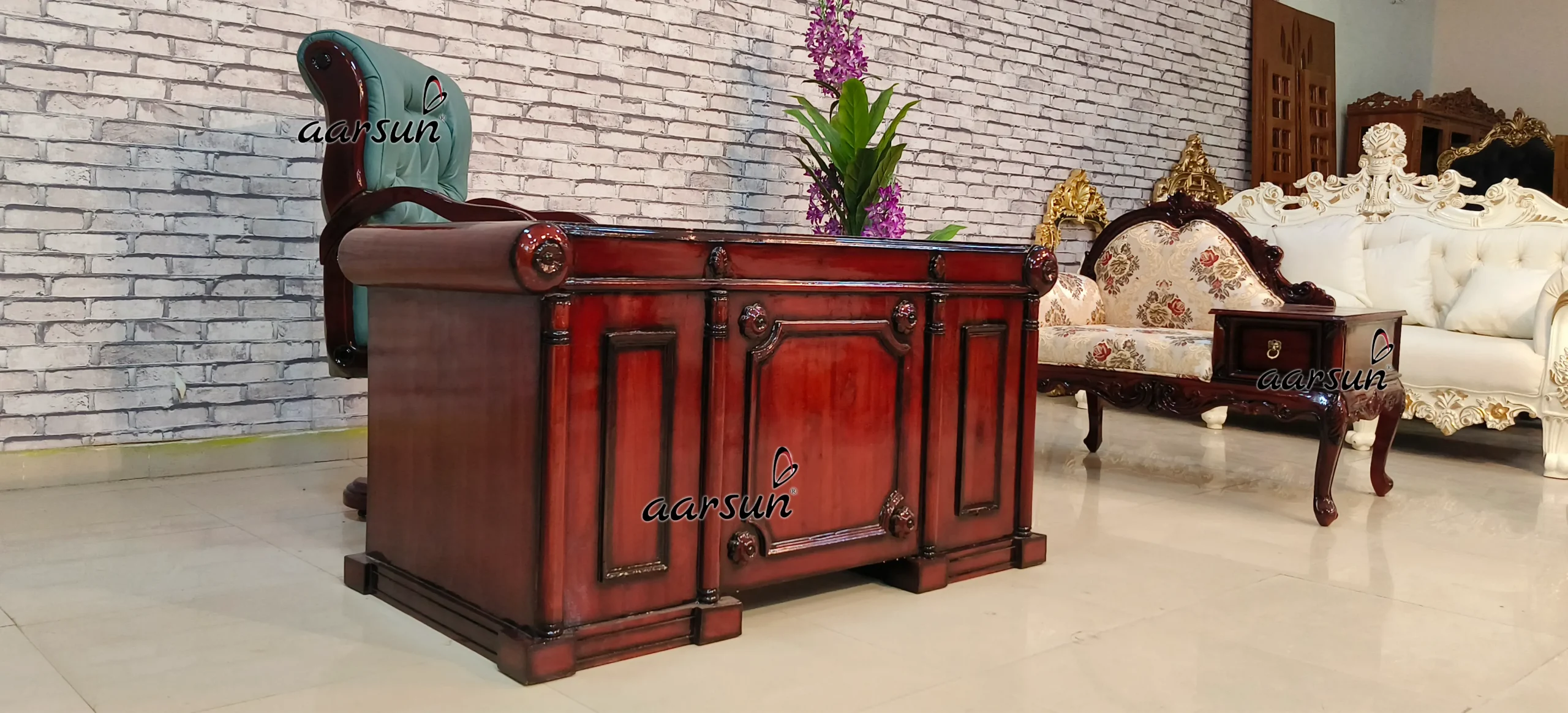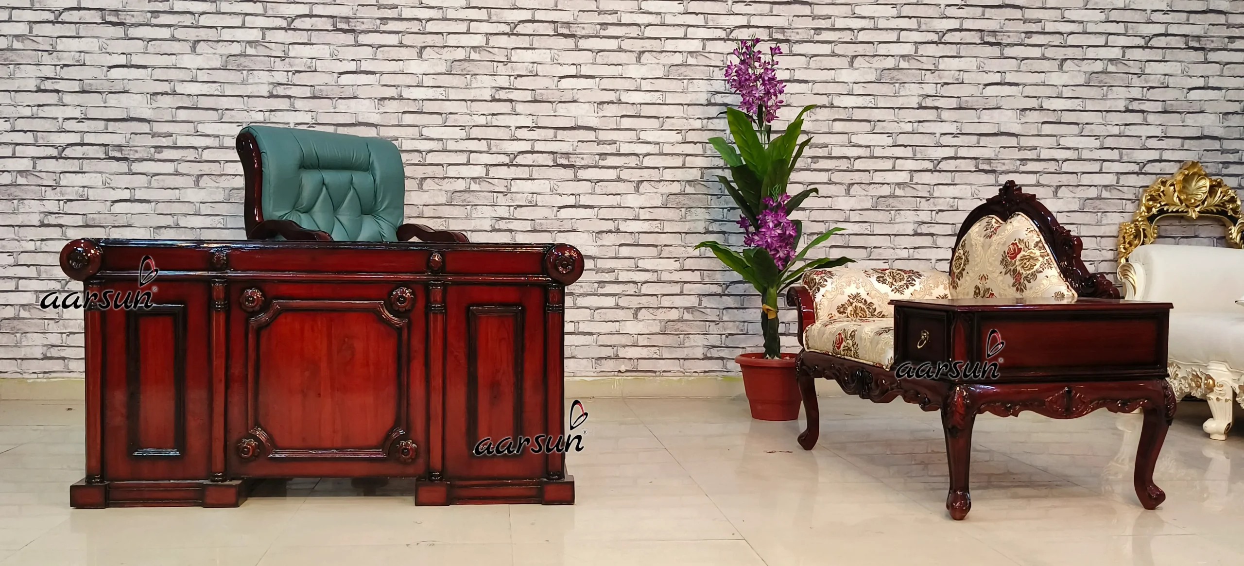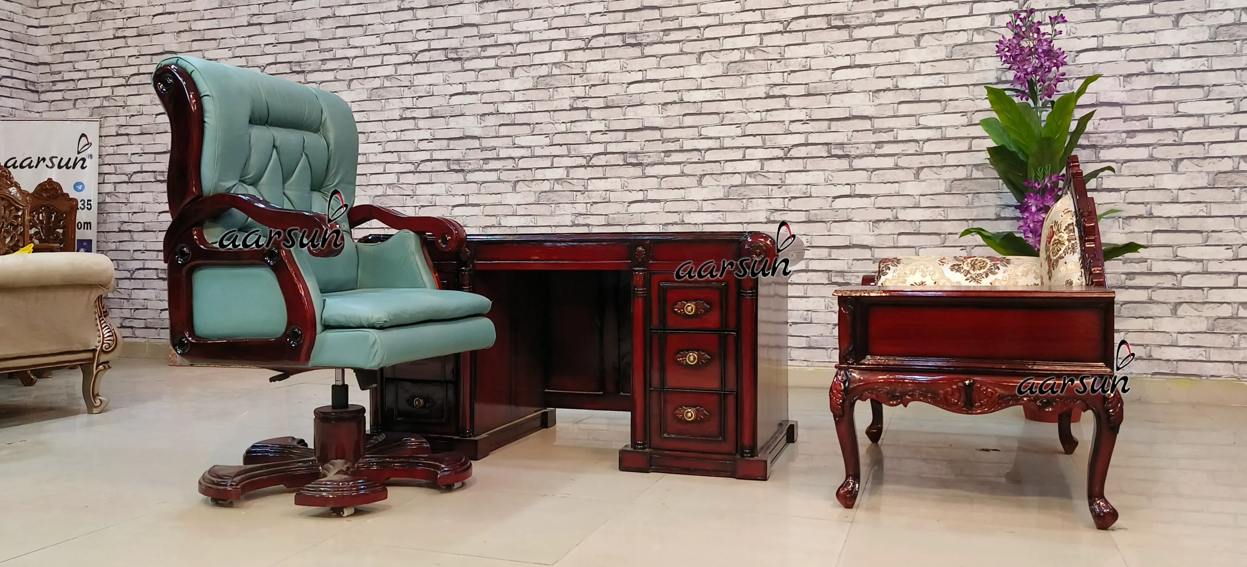 This office furniture is suitable for professional use and has a spacious cabinet and seating area. It consists of beautiful minimal hand carving on the middle and corners. Additionally, this table consists of a hole in the upper part from which you can easily connect your wires to your PC. The chair revolves 360 degrees with hydraulic and is very comfortable, the material used is real leather.