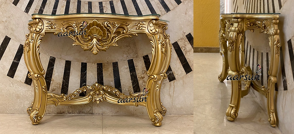 “Aarsun” presents the Premium Console Table for any living space of your home, where you feel like placing the console would add a charm. This piece of furniture is made of Premium Teak wood. This is perfect for decorative purposes. This console is luxurious in look. The console is adorned with beautiful hand carvings. The floral leafing designs add a unique charm to this unit. The Gold paint looks so royal and luxurious. From top to bottom, this console is adorned with amazing hand carvings done by our skilled master artisans. You can place it against the wall and use it to keep a flower vase or any decorative piece. This console breaks the monotony of the room or any living space by gazing at the attention of the people around because of its art and decoration.