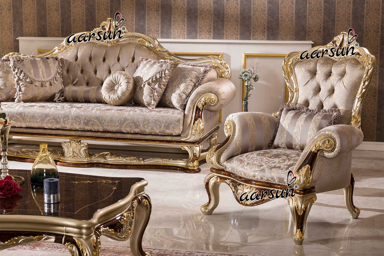 This Royal sofa design is as luxurious as it can get. Ultra Luxurious Sofa couch, super comfortable and royal chairs, and equally mesmerizing center/coffee table. What more can a person ask for. This is a truly amazing Master Piece.