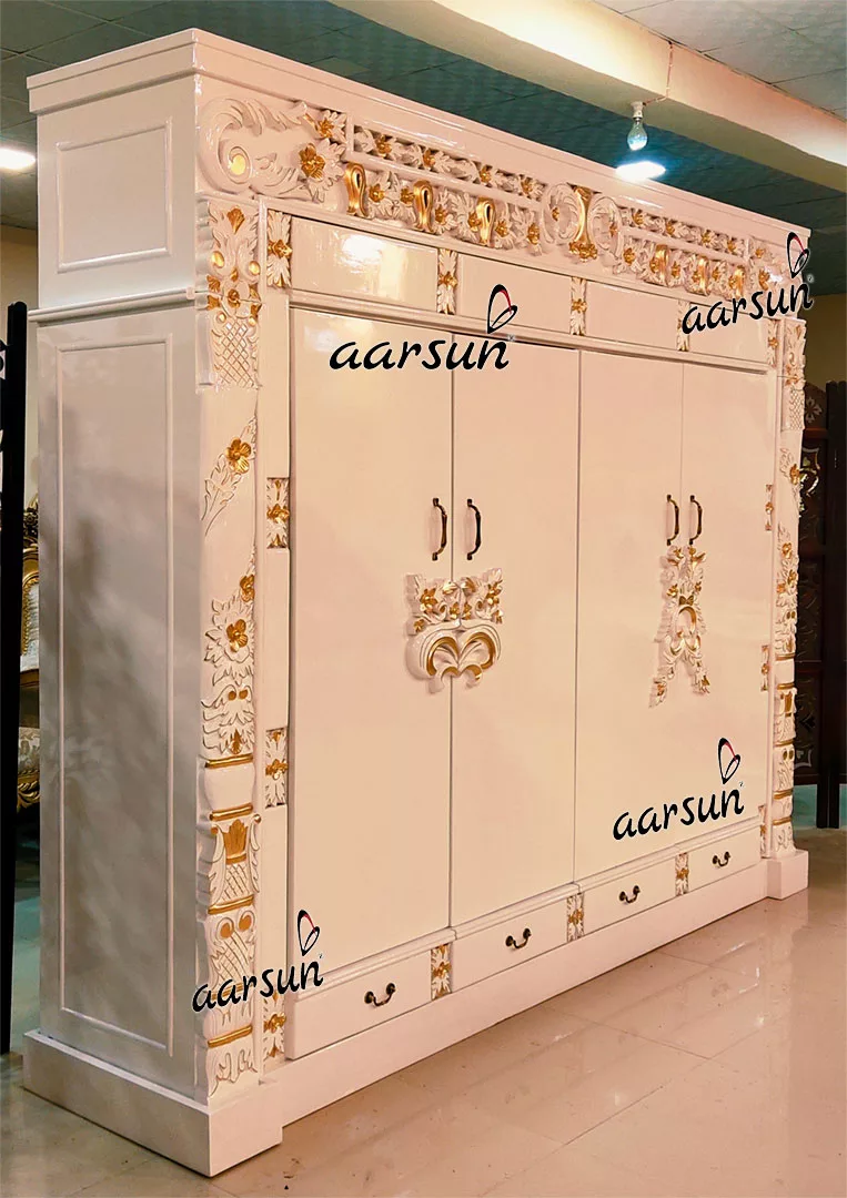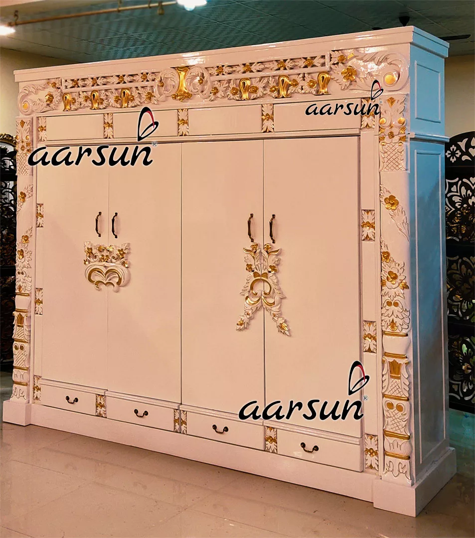 Bring extraordinary artistry into your home by Aarsun artisans. Our Floral Hand Carved wardrobe with White paint and golden highlighting. The beautifully handcrafted unit is designed in teak wood and comes with 4 drawers and 4 doors. The Storage unit can be used in any room of the house which you think it would fit.