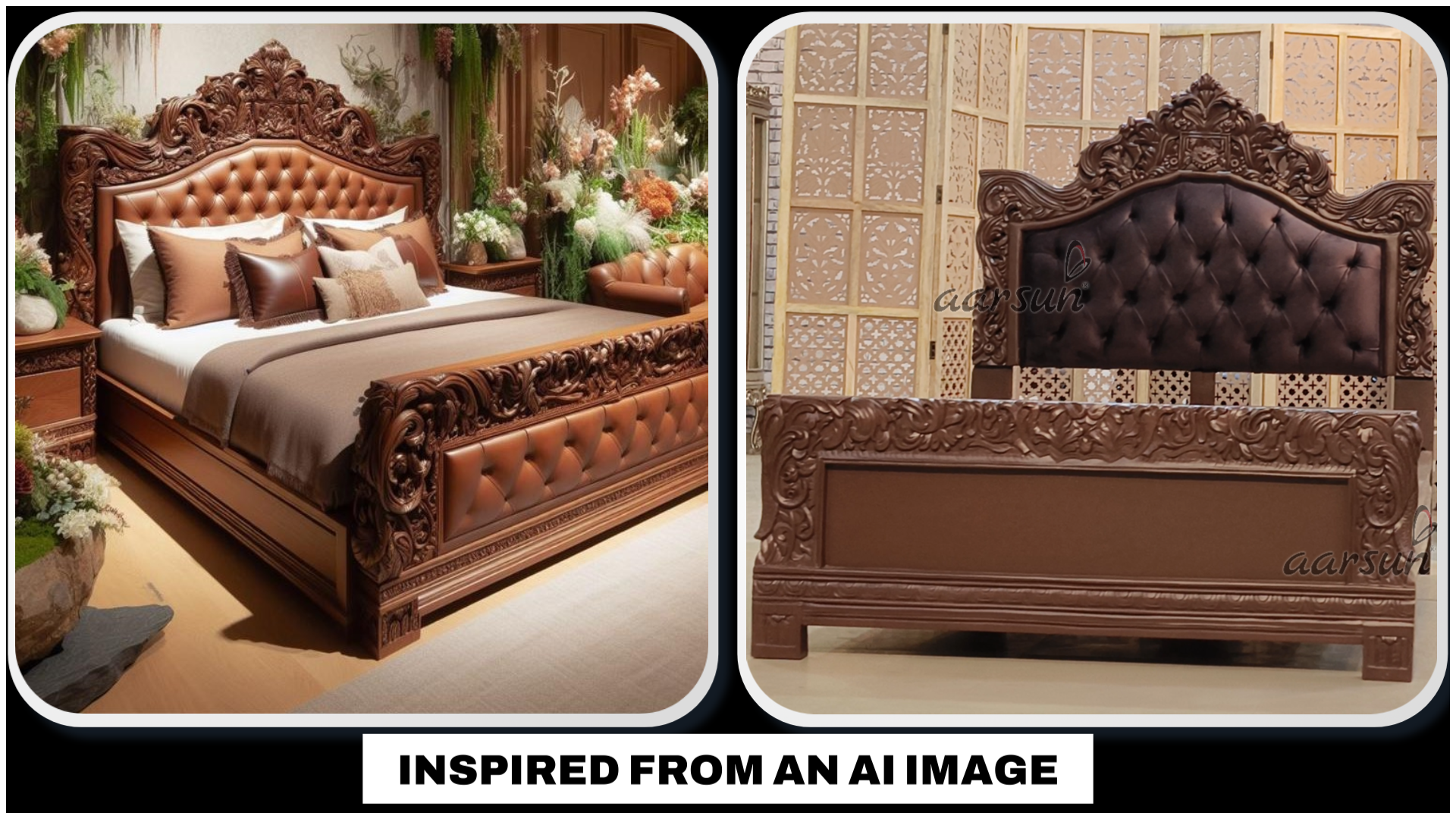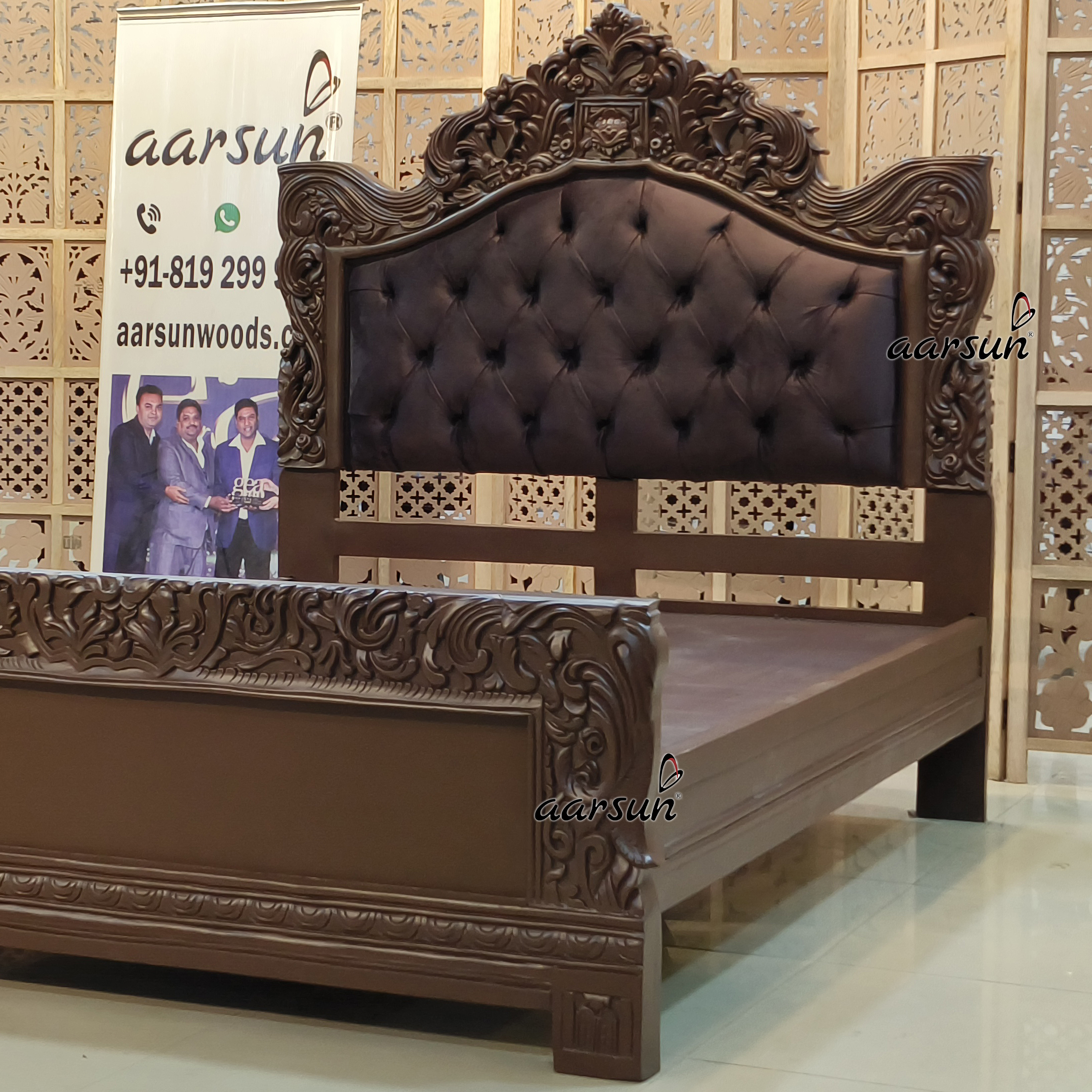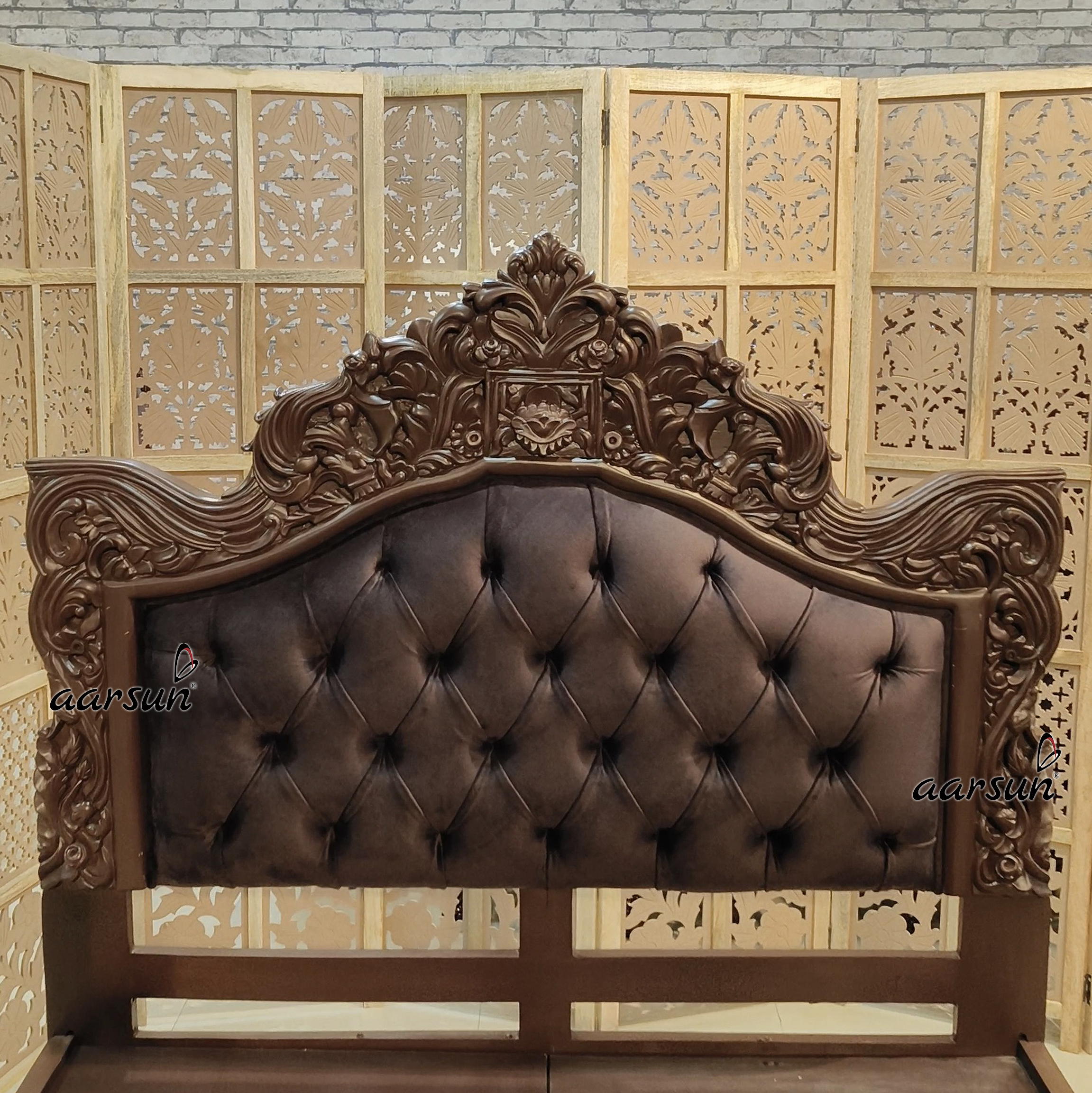 Aarsun presents the latest Queen Size Bed design, which is chocolate brown. This bed was made according to the client’s choice and delivered to their place. It is the epitome of true craftsmanship and will set your bedroom space to a whole new level of appearance. This bed is inspired by an AI image, and we are the experts in manufacturing it according to your requirements. The tufted back with a designer crown adds a royal charm. The wooden frame is adorned with beautiful hand carvings. For single people and couples, a queen-sized bed is an ideal choice.