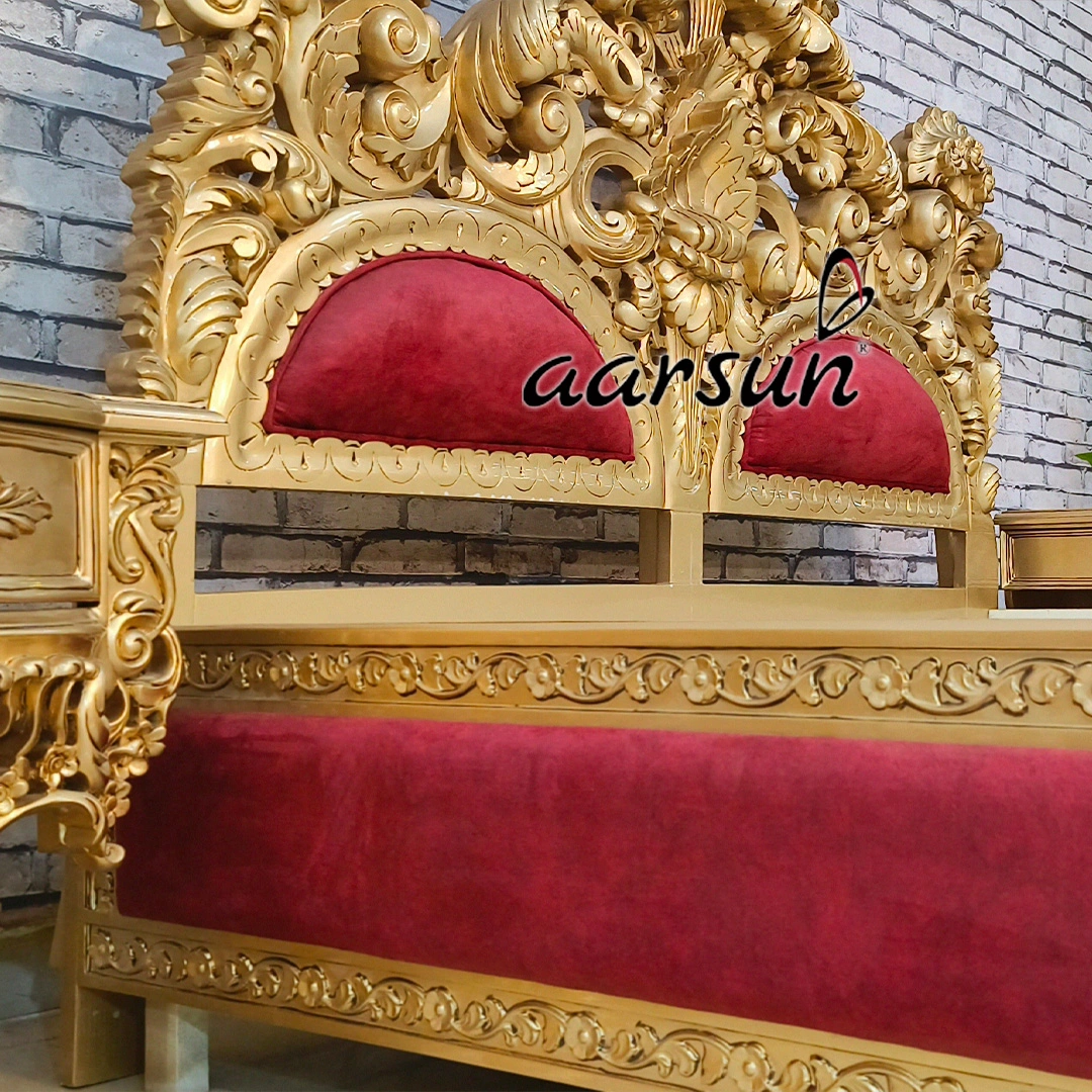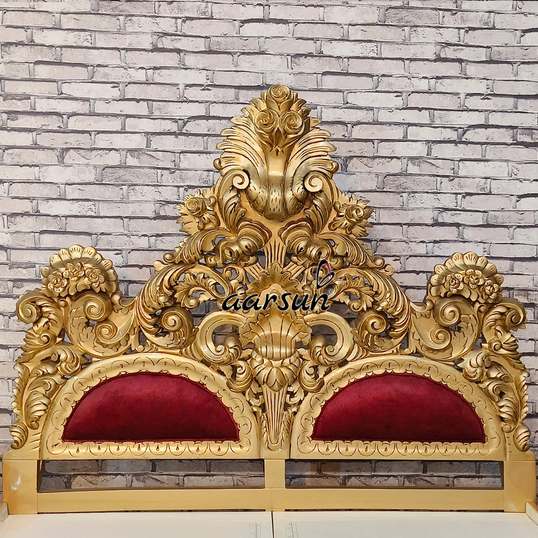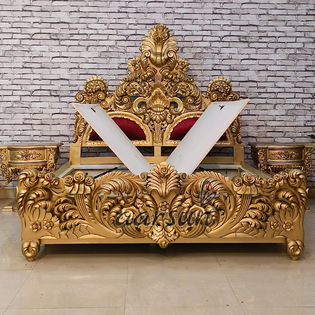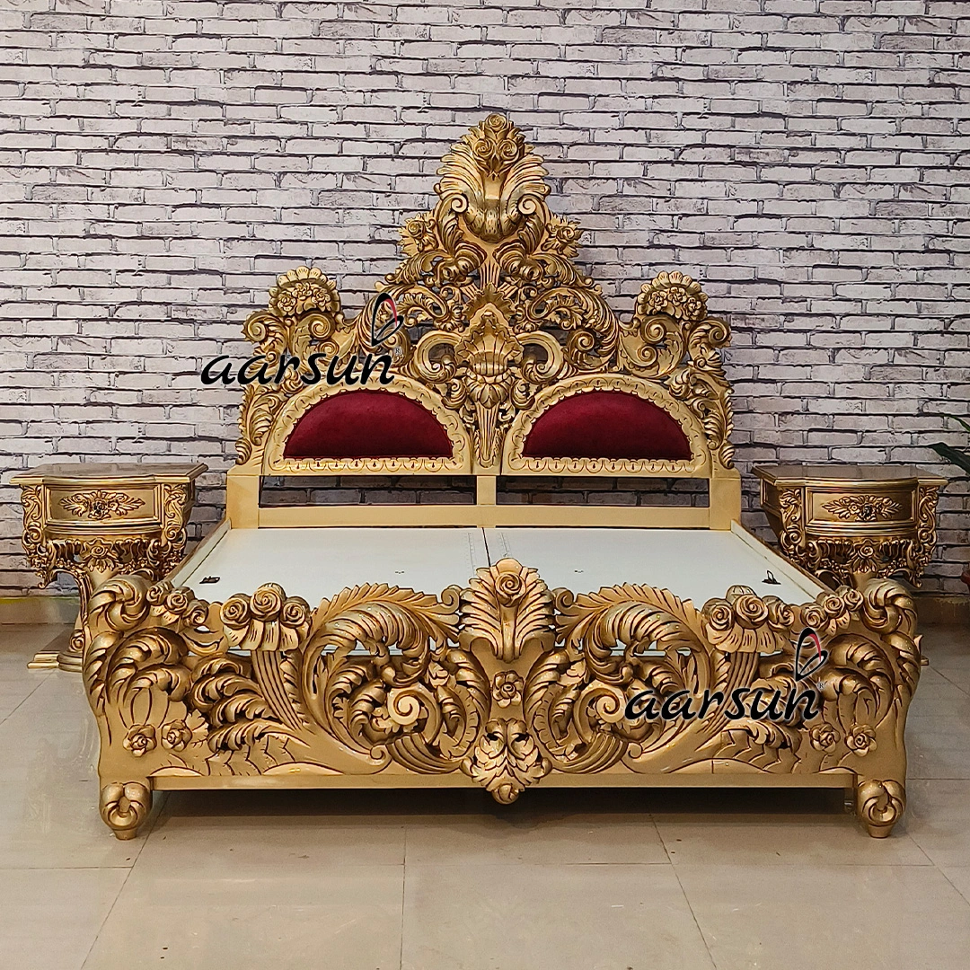 Aarsun presents a Royal Queen-size Bed. This luxury bed has a beautiful heavy carving  that sets it apart from all other styles. As the name suggests, it gives you a  royal feel. Lovely and amazing artistic work is done on this bed to give your bedroom a very rich and royal look. This bed is made from premium quality teak wood, beautified with antique gold paint.