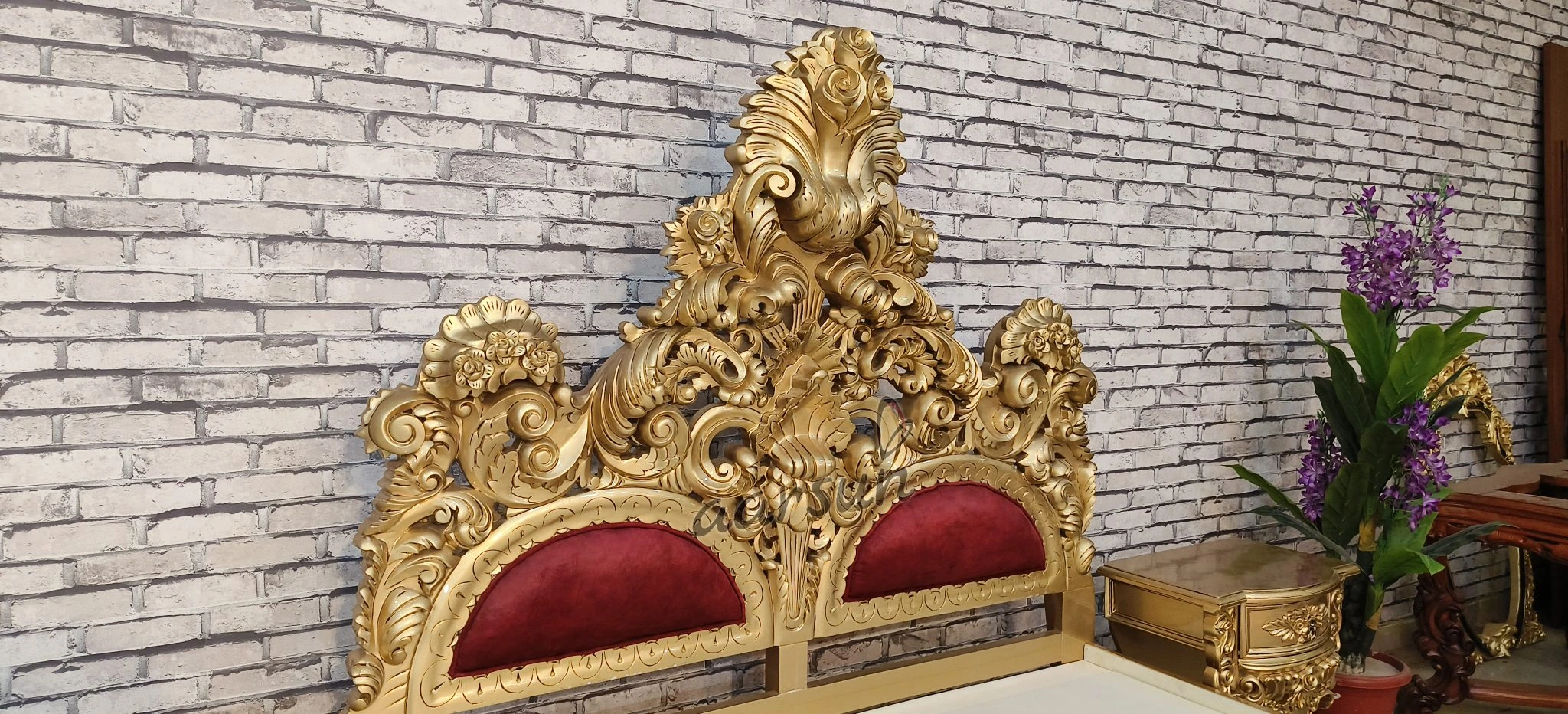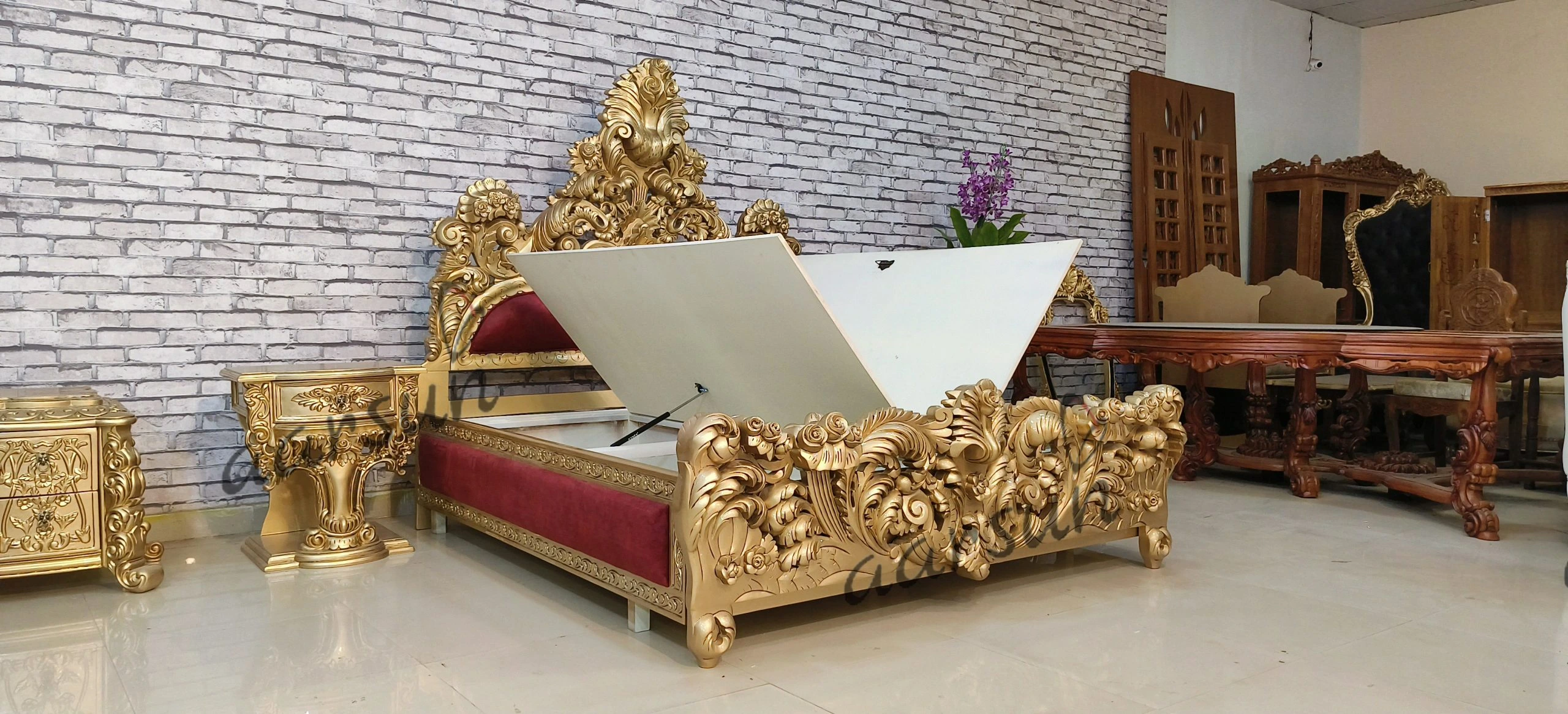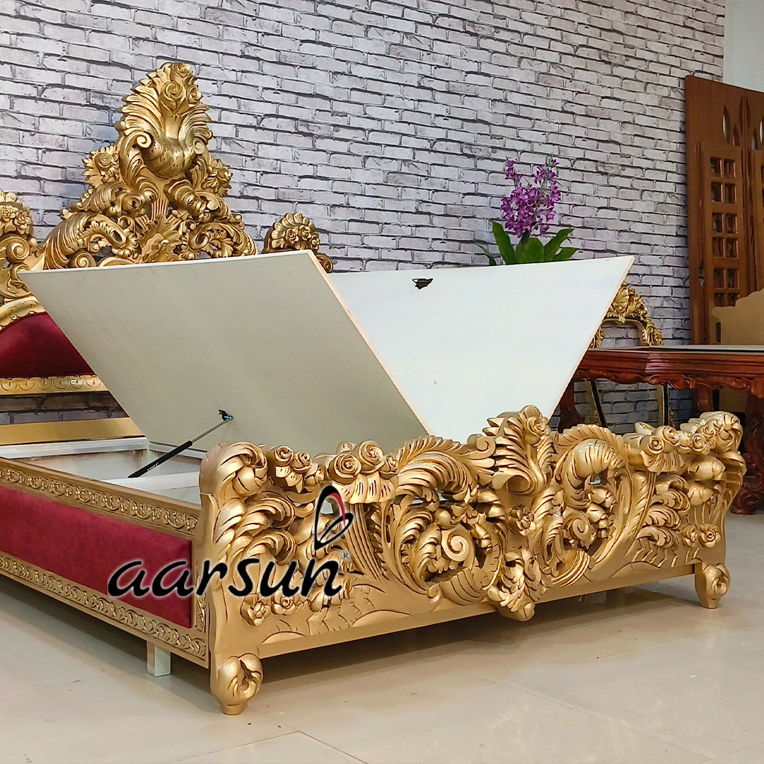 Aarsun presents a Royal Queen-size Bed. This luxury bed has a beautiful heavy carving  that sets it apart from all other styles. As the name suggests, it gives you a  royal feel. Lovely and amazing artistic work is done on this bed to give your bedroom a very rich and royal look. This bed is made from premium quality teak wood, beautified with antique gold paint.