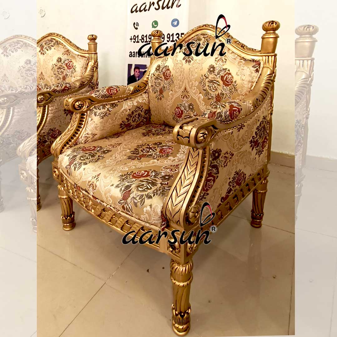 Beautifully handcrafted Wooden Royal Bedroom Chair. The Unit is in Antique Gold Paint, Teak Wood. The design and the finish are unique as always. It is very Comfortable and Spacious with Wooden handles are Covered With Cushions. Aarsun has a history of providing unique Room chairs to all of our clients. This unit is completely customized as per the client.