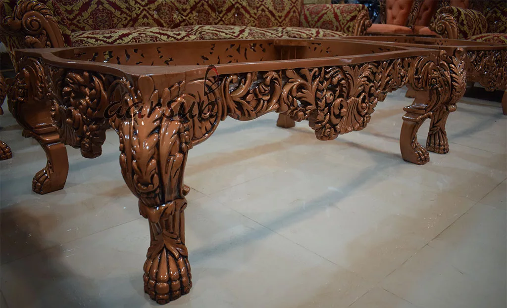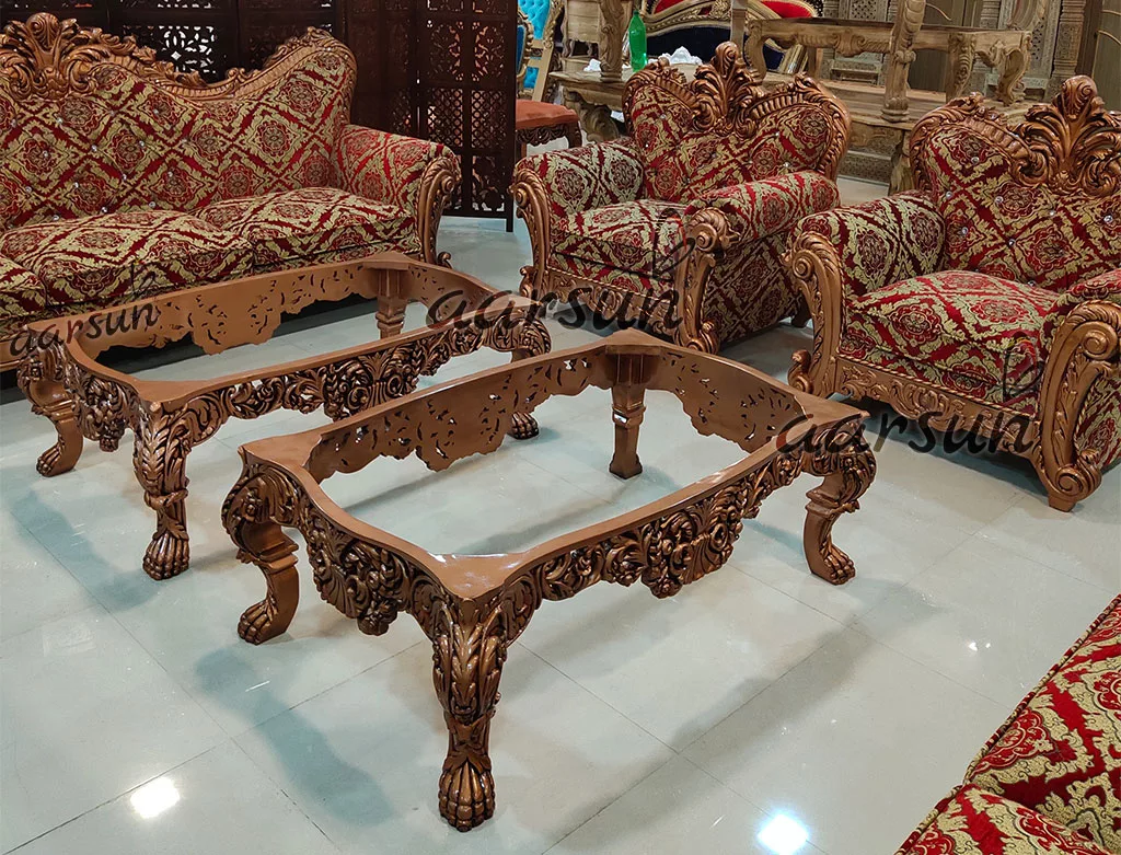 Aarsun brings to you a modern and comfortable Teak wood sofa set for your living room. This Copper Finish Sofa Set is made of premium quality Teak Wood with floral carving. It has an elegant design that enhances the interior decor of your living room. The fabric of this sofa makes it very comfortable to sit while the floral carving back gives the traditional look to the set. The unit is supported by four beautifully carved legs.