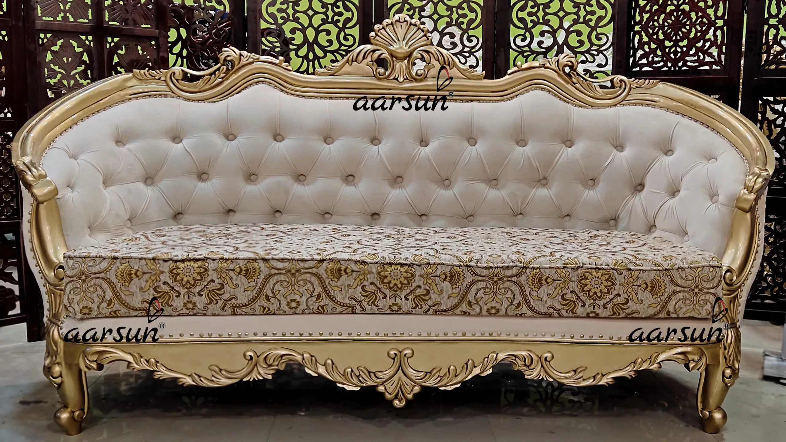 Aarsun brings to you the 5-seaters curved sofa set. The unit was designed and manufactured in teak wood with gold paint. The fabric is chosen by the buyer. The 3-seater sofa has a curved handle on both sides for better support which is the highlight of the unit. The center part has elevated tufted quilting. . The taj floral carving gives the complement to the entire set as well as the fabric.
