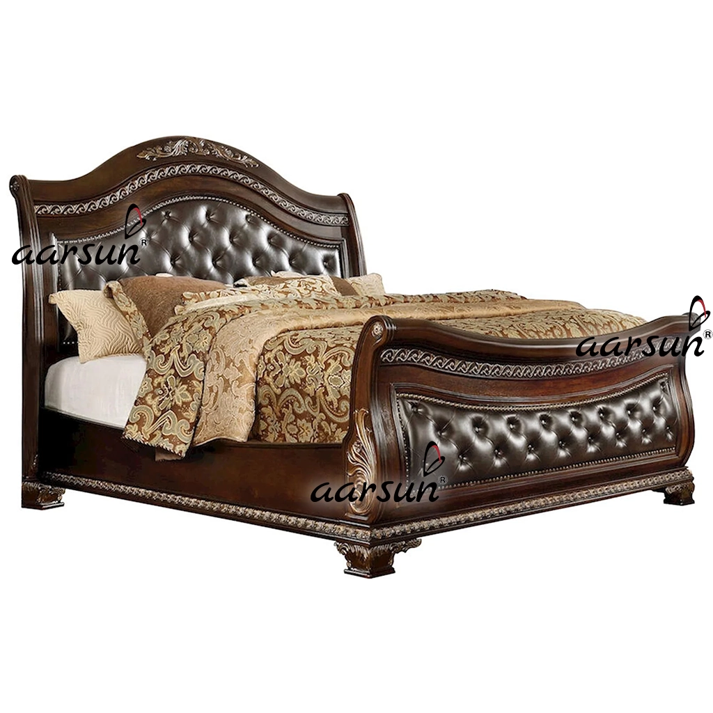 Aarsun features this luxurious bedroom set which is perfectly suited for a royal ambiance. Made in premium quality Teak wood , and handcrafted by our skilled artisans in India. It’s a timeless addition to any bedroom, combining beauty, comfort, and durability.The matching tall chest of drawers and nightstands carry the same ornate craftsmanship.The rich brown finish adds warmth to any bedroom. The head board and foot board is padded with leatherette and buttoned .With a custom-made design option, you can create a comfortable and elegant haven in your bedroom. Each unit is unique and one-of-a-kind due to handmade craftsmanship. What are you waiting for , explore our wide range of luxurious bed designs, we will be happy to transform your home.