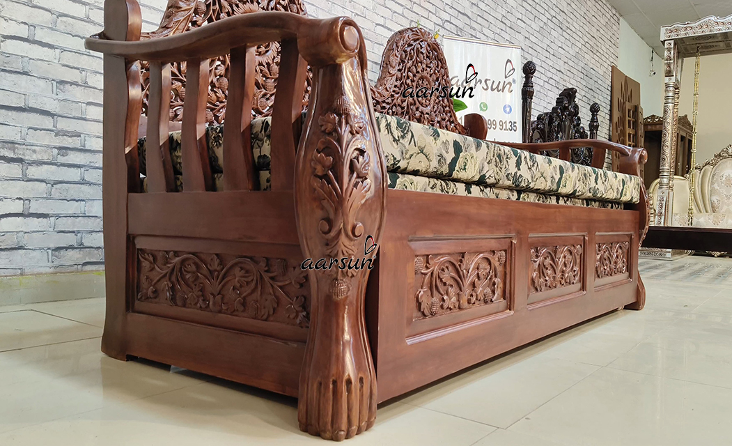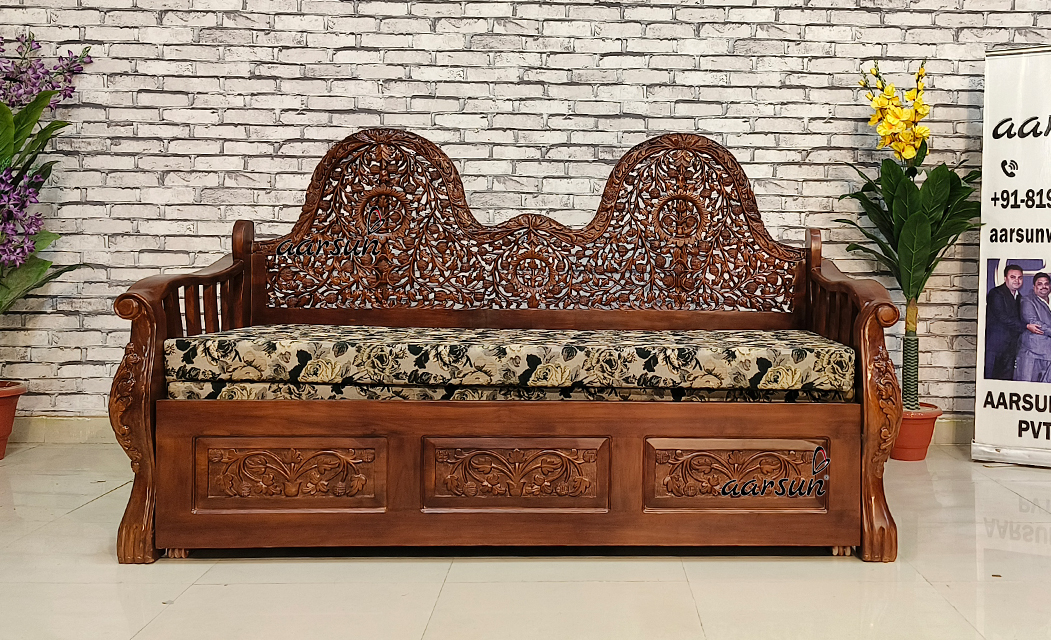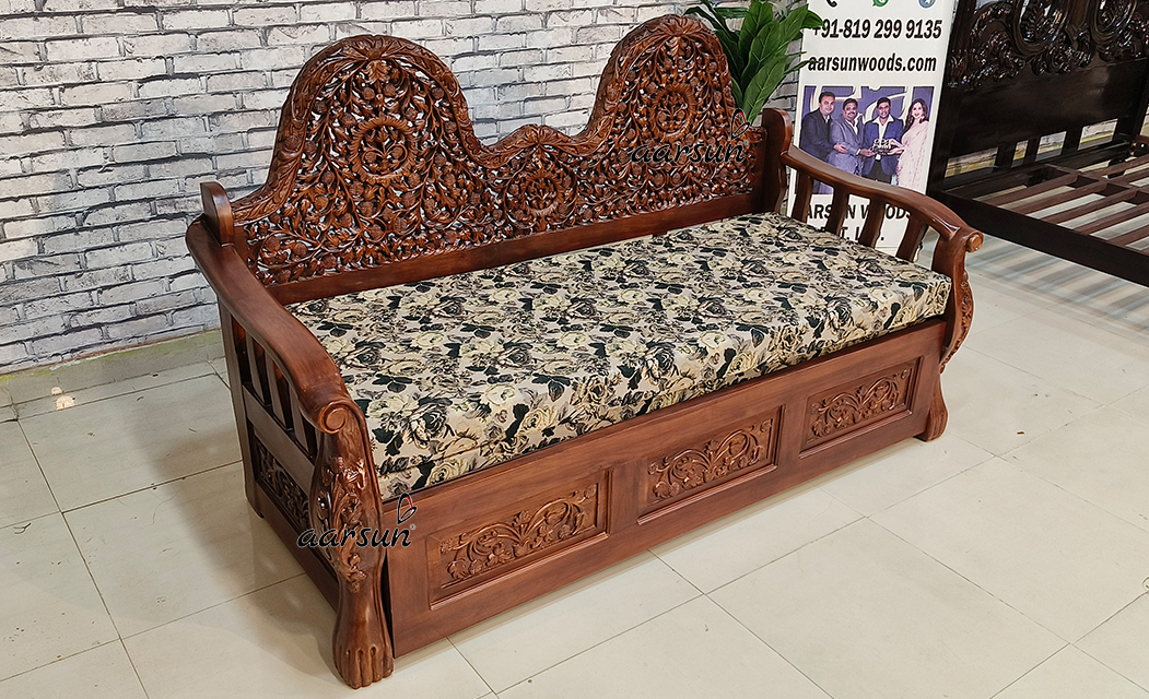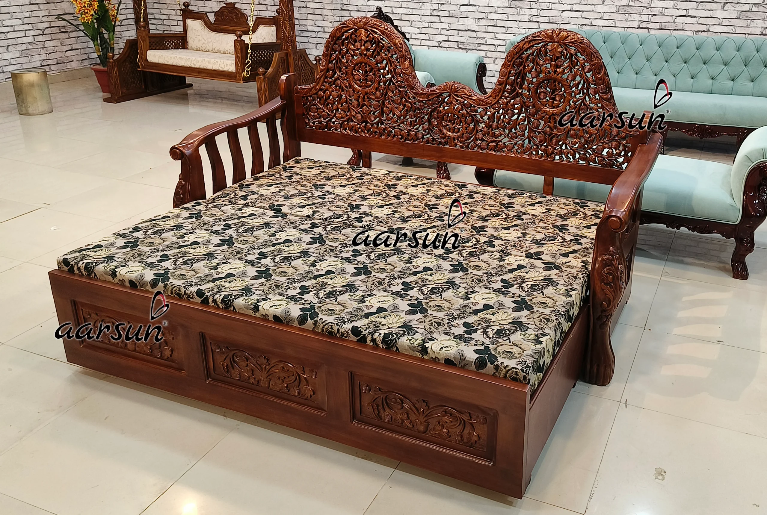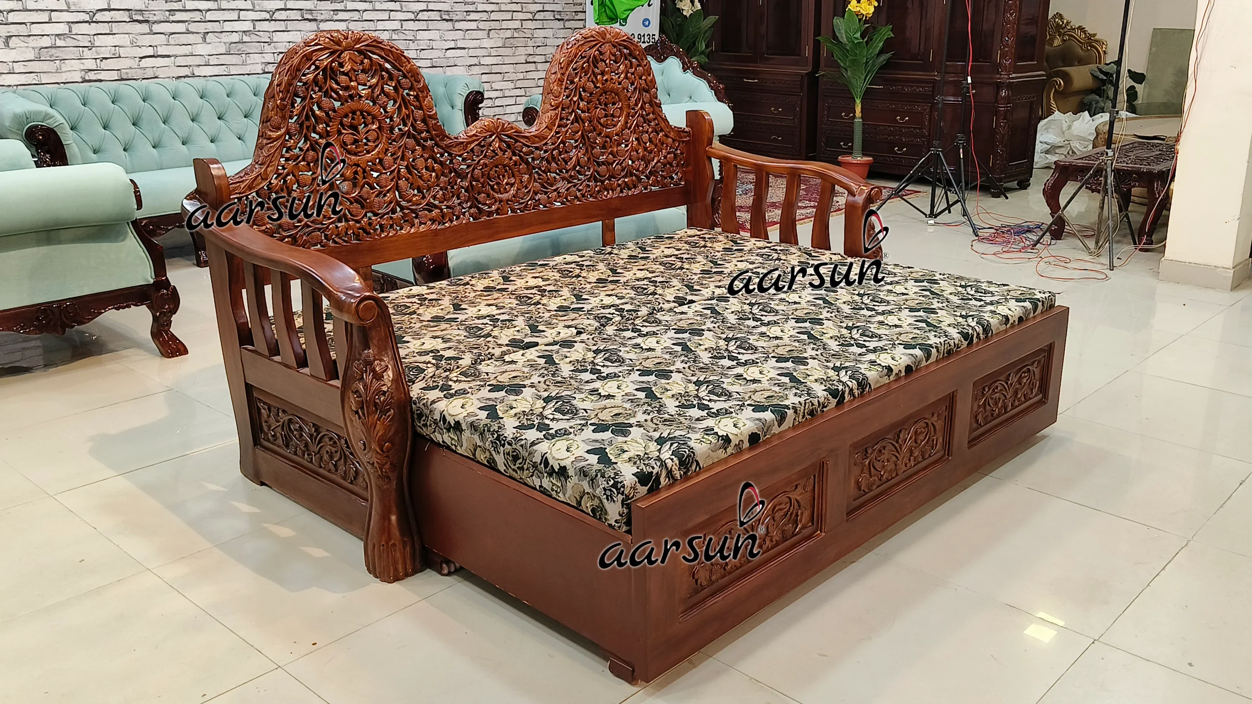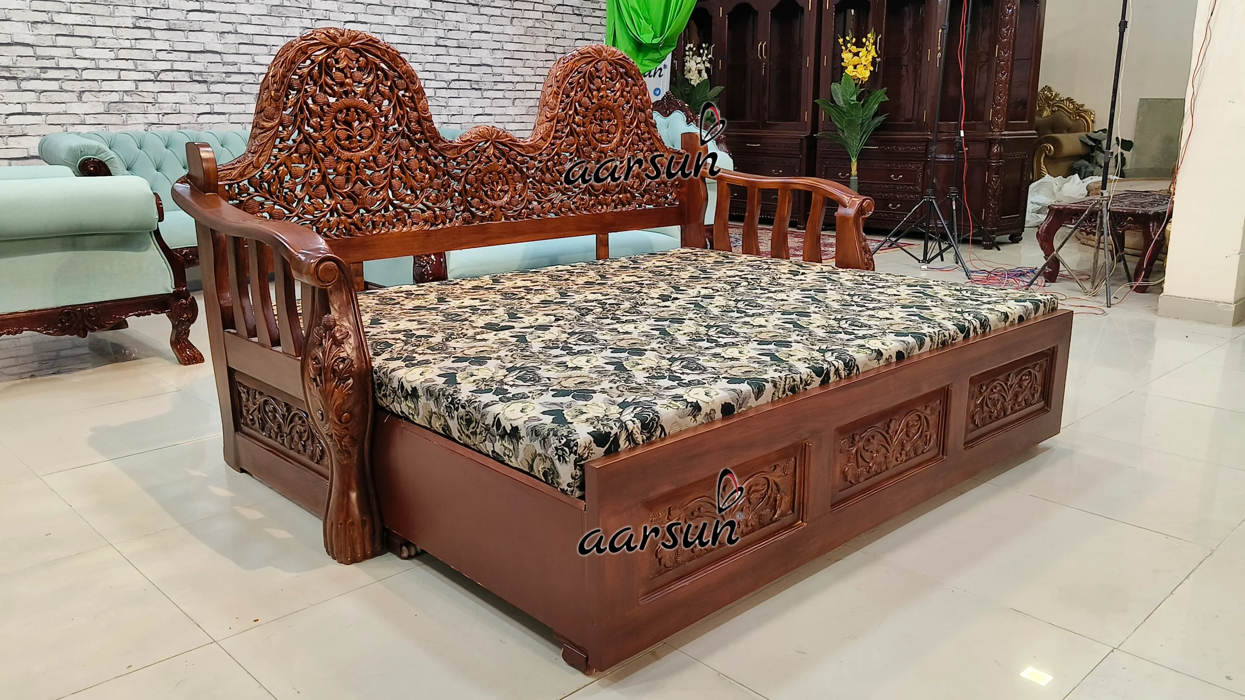 This sofa cum bed is beautifully hand carved and made on solid teak wood ,so that quality and fine carving is not compromised. The fine detailing on the back rest make it even more royal and beautiful.