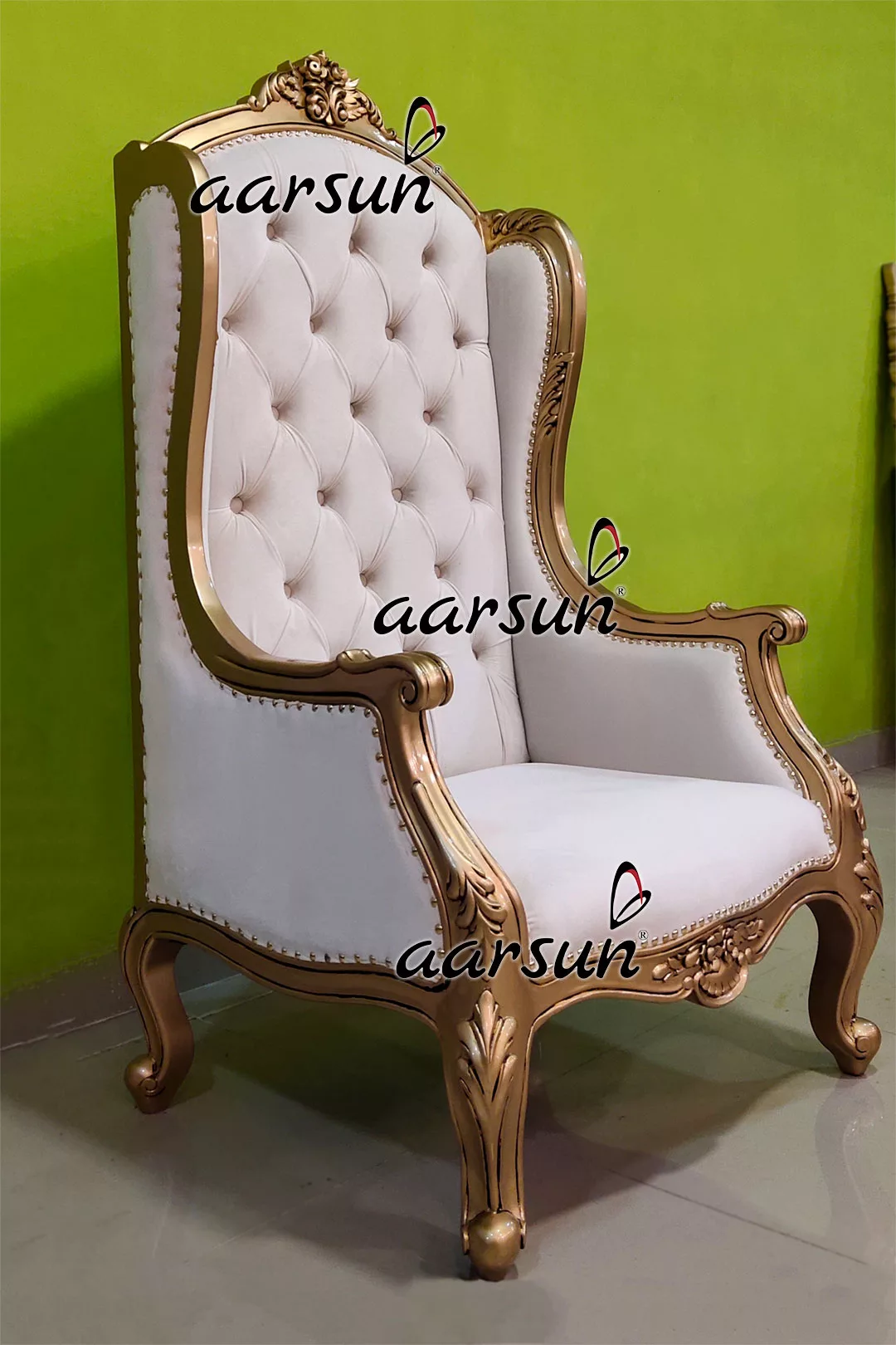 The unit is handcrafted in premium quality Teak Wood and painted in luxurious antique gold Duco paint. The Tufted back and side wings provide great support and comfort to the back and sides.