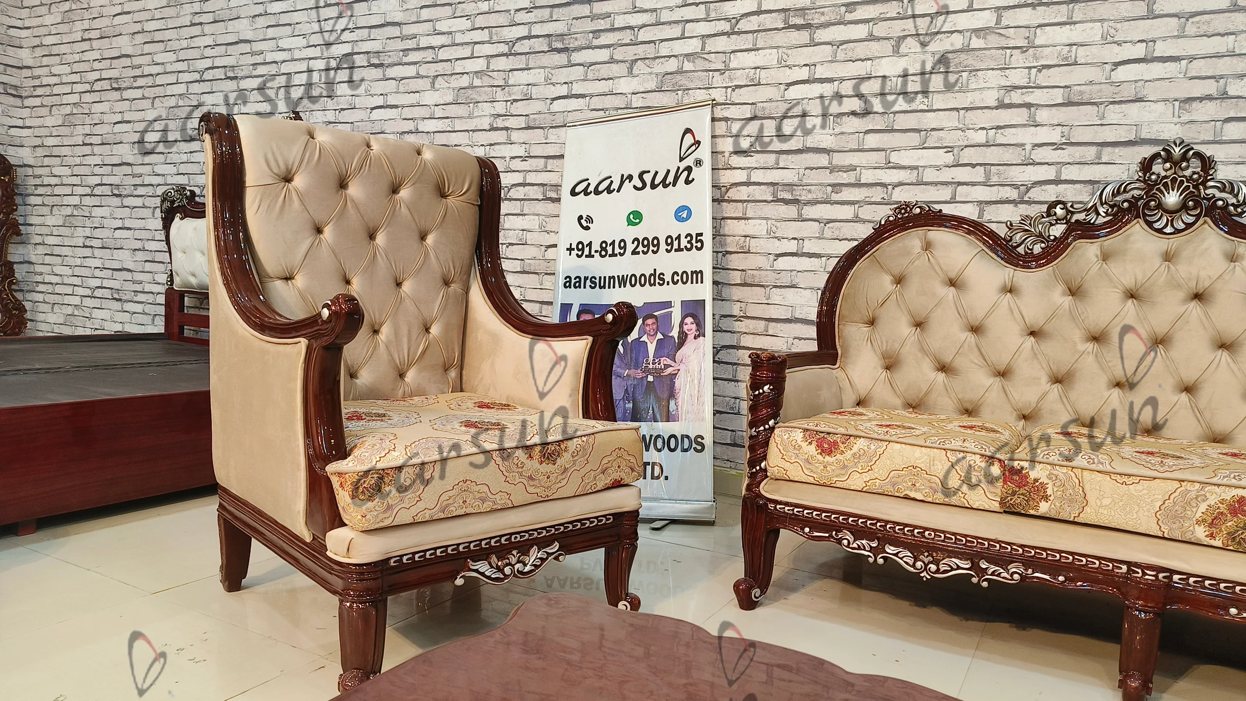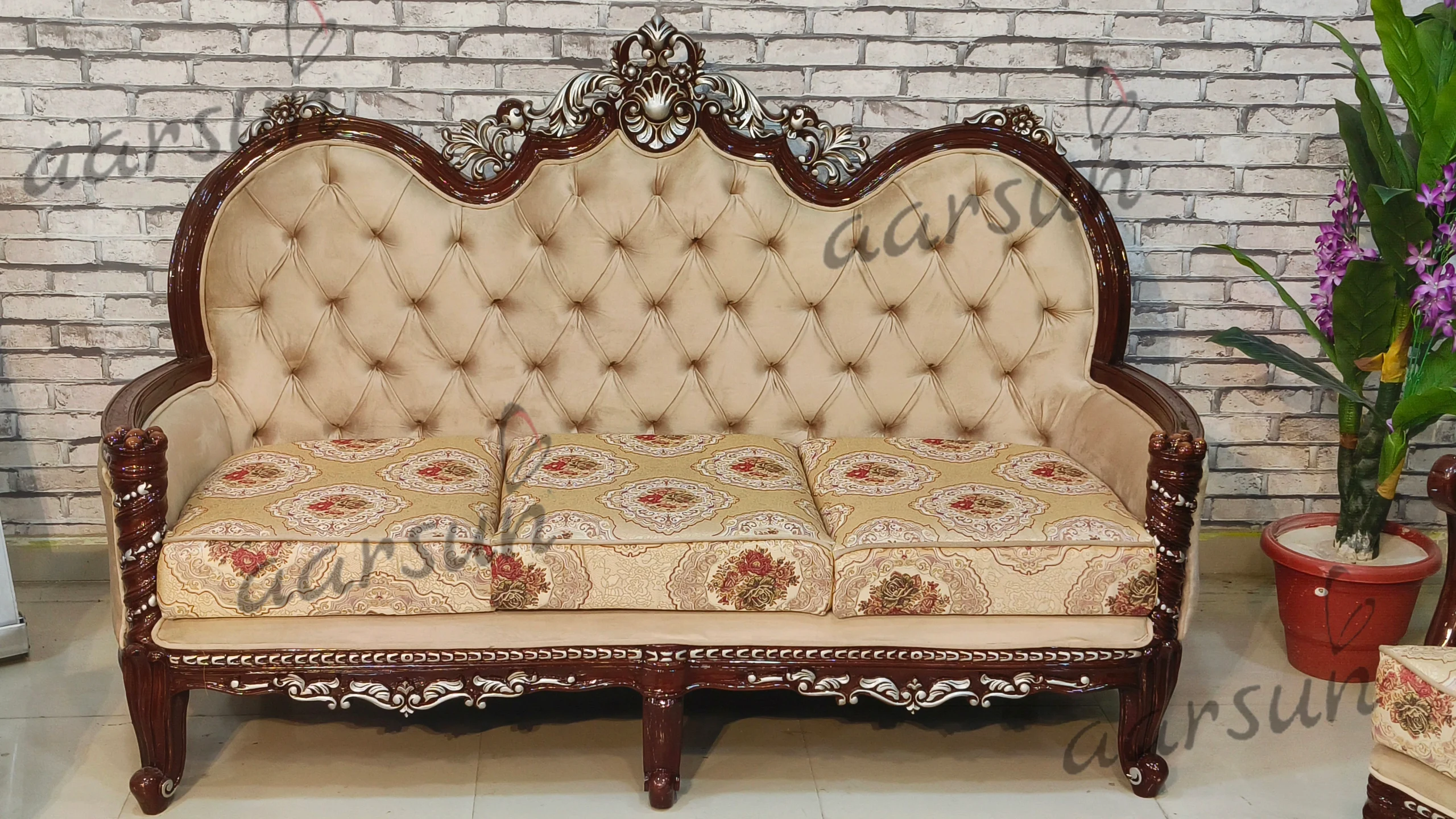 This sofa set is different in design as it has a curved design on the handle, cushions can be added , and therefore wood is visible. The color concept of this sofa set is different, it is in classical brown with silver highlighting.