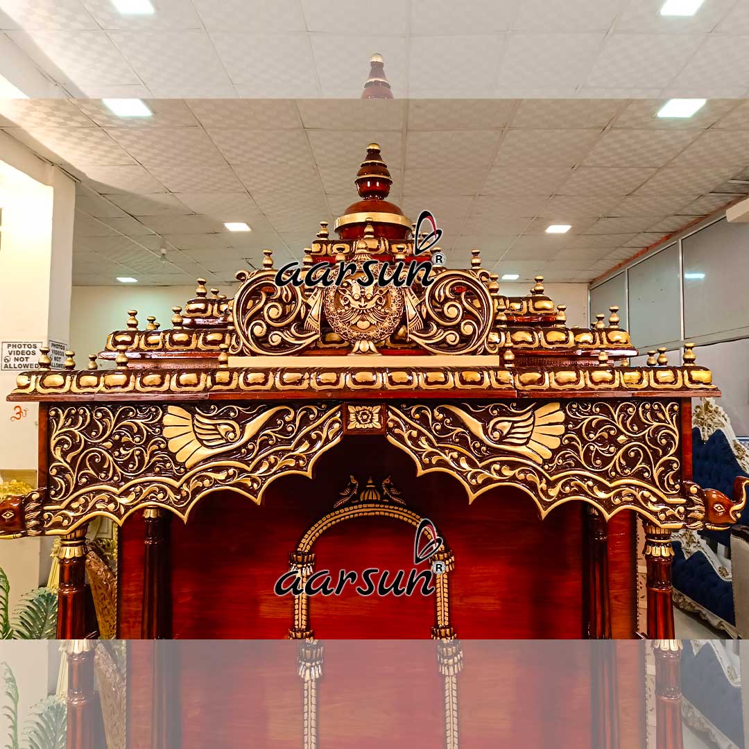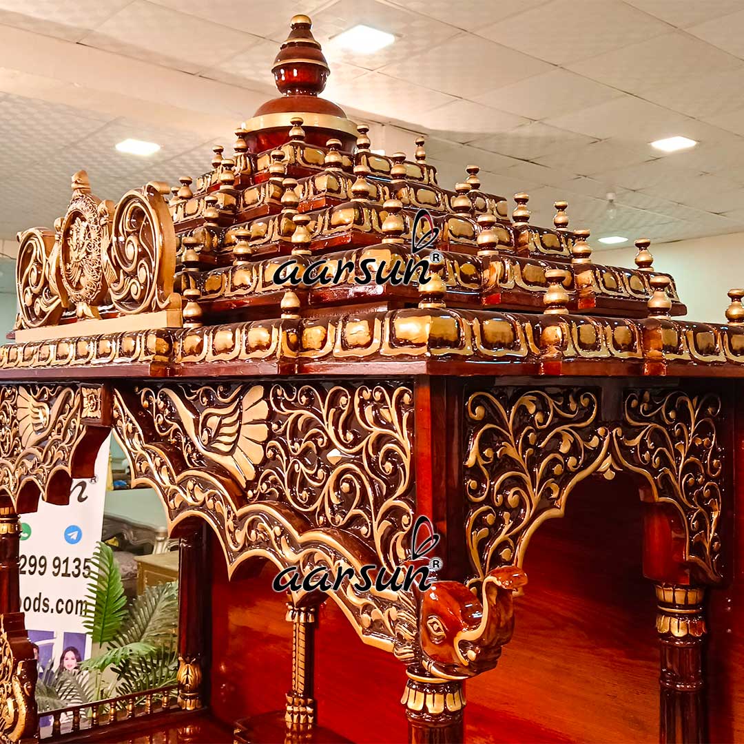 Aarsun features the Temple design in teak wood is a beautiful and timeless way to bring a touch of tradition and spirituality to any home. It has a Diya Tray with 3 Drawers with 2 Cabinets for Storage. The temple features beautiful, fine carvings with gold highlights. The temple has step in dome, a dome typically symbolizes the heavens or the celestial realm, representing a connection between the earthly and the divine. Carved with a beautiful peacock in a welcoming pose and elephant beneath the piller . Elephants which symbolize Lord Ganesha, are revered for wisdom and prosperity, while peacocks represent beauty, grace, and immortality. Made in premium quality of teak wood , which is best for carving.