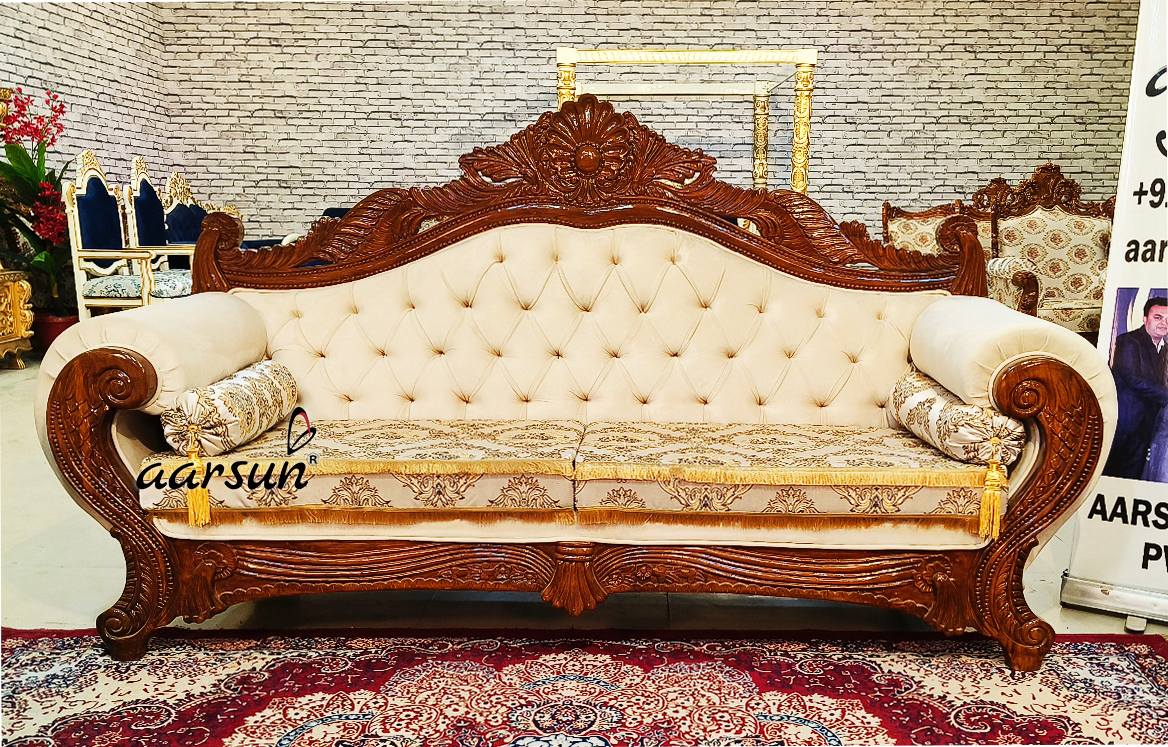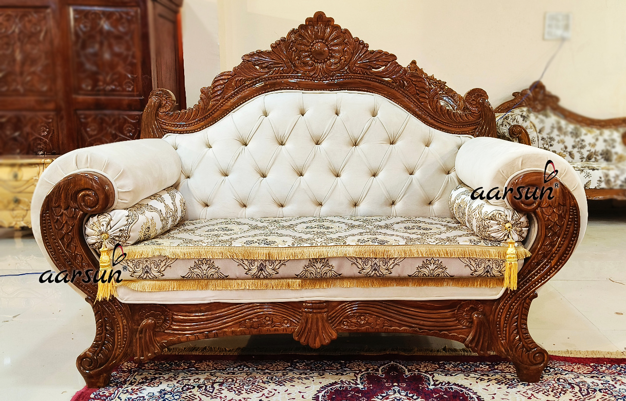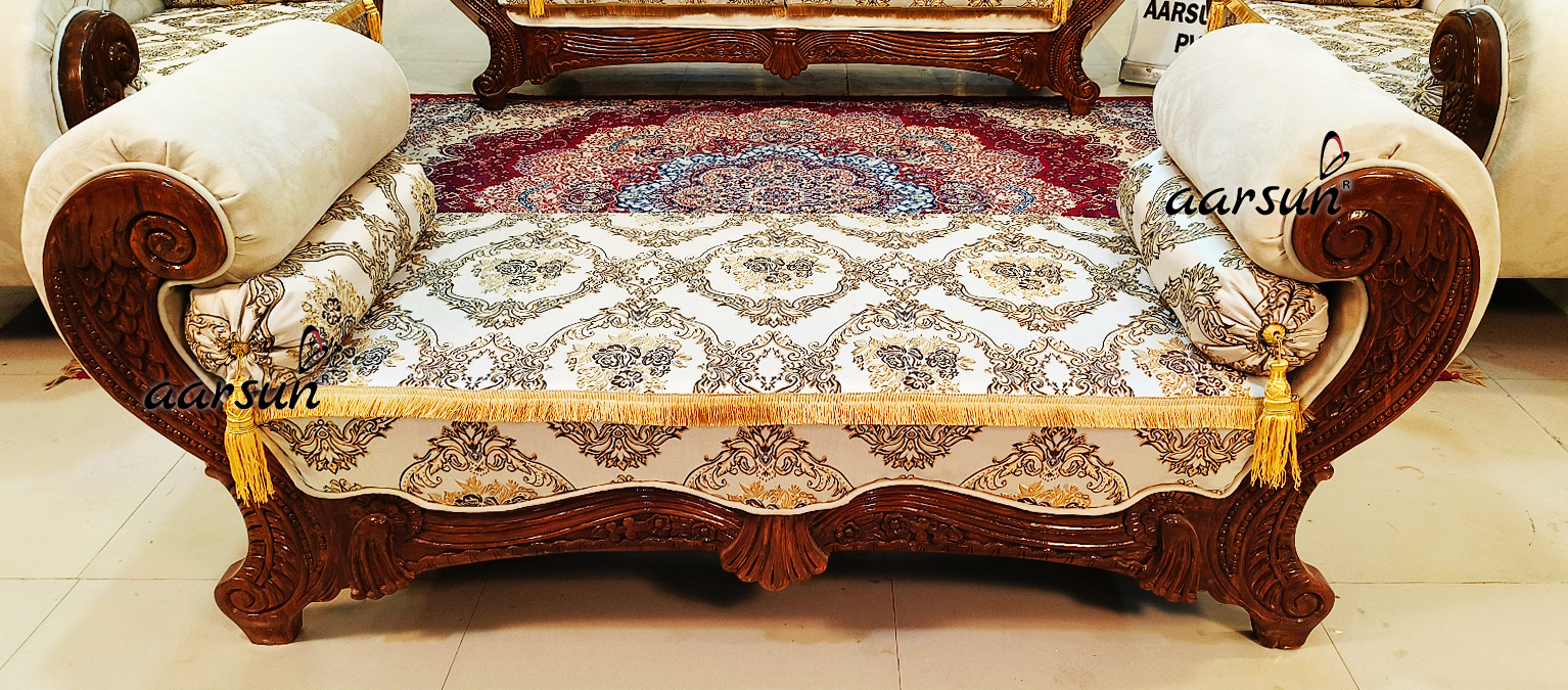The Royal Sofa set in a wooden finish, also known as a “Shahi” sofa set, is defined by its unique curvature and bolster setup, giving it a royal appearance. When we think of a royal sofa set, we often imagine gold, silver, gold leafing, and flashy colors. However, a wooden finish can also suit the Shahi sofa set depending on the home’s theme. This unit consists of one 3-seater, two 2-seaters, and an open-back settee. The open back settee is a special part that makes the set look royal, and you often see it in royal furniture.