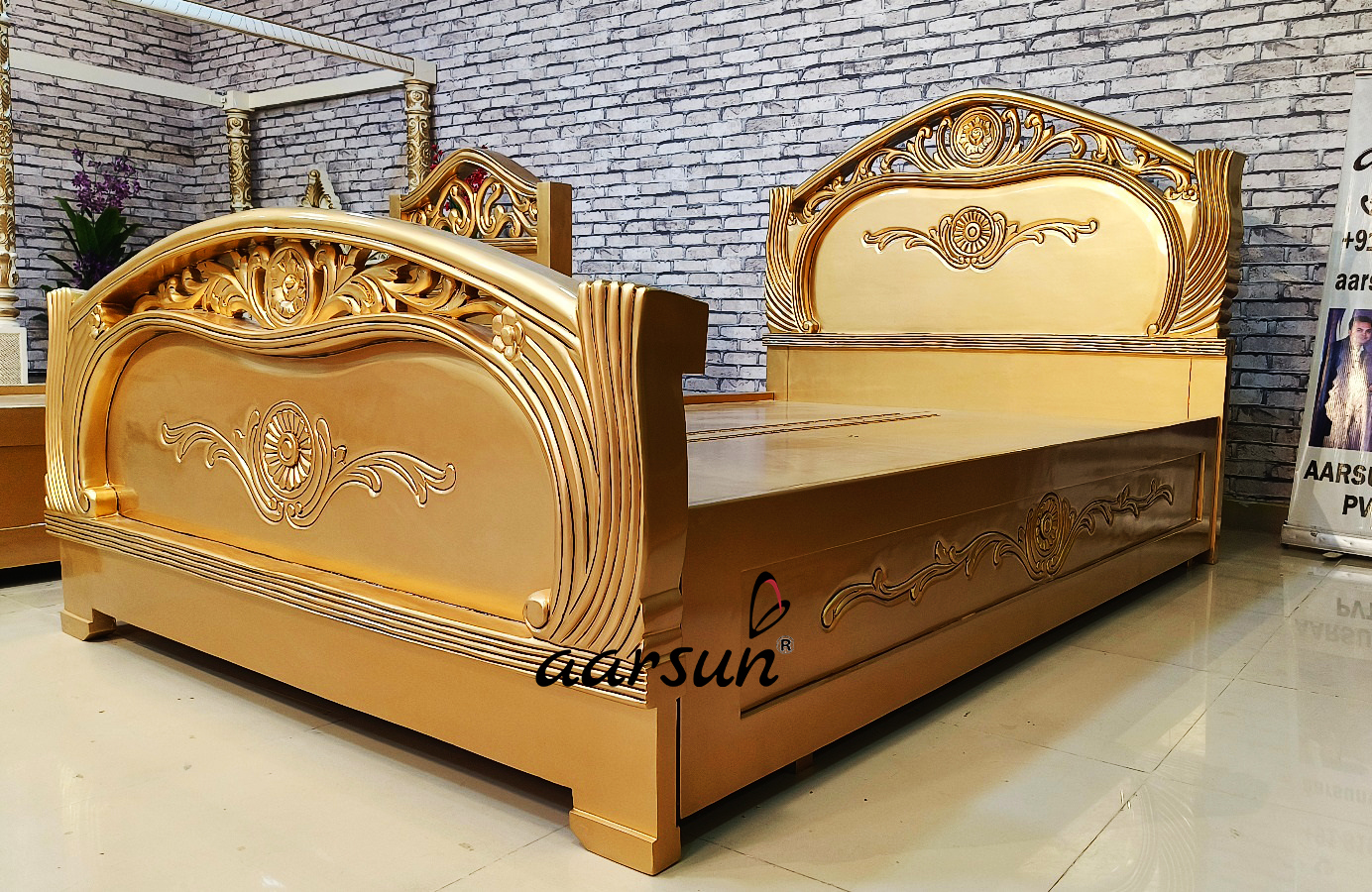 Aarsun presents our “Choice Wala Furniture” – a three wooden bed set designed according to the client’s choice. The three wooden bed set are crafted from premium quality teak wood. The set features intricate floral carvings with an antique gold polish. The headboard displays a floral carved design, mirrored at the back and on the footboard as well. The bedside also showcases similar floral carving. The sides of the bed are also made of teak wood. The unit includes storage options with a hydraulic easy-opening and closing mechanism. We excel in customization. We have a variety of bedroom set designs available, please take a look at the bed designs category. We provide delivery within India and worldwide.