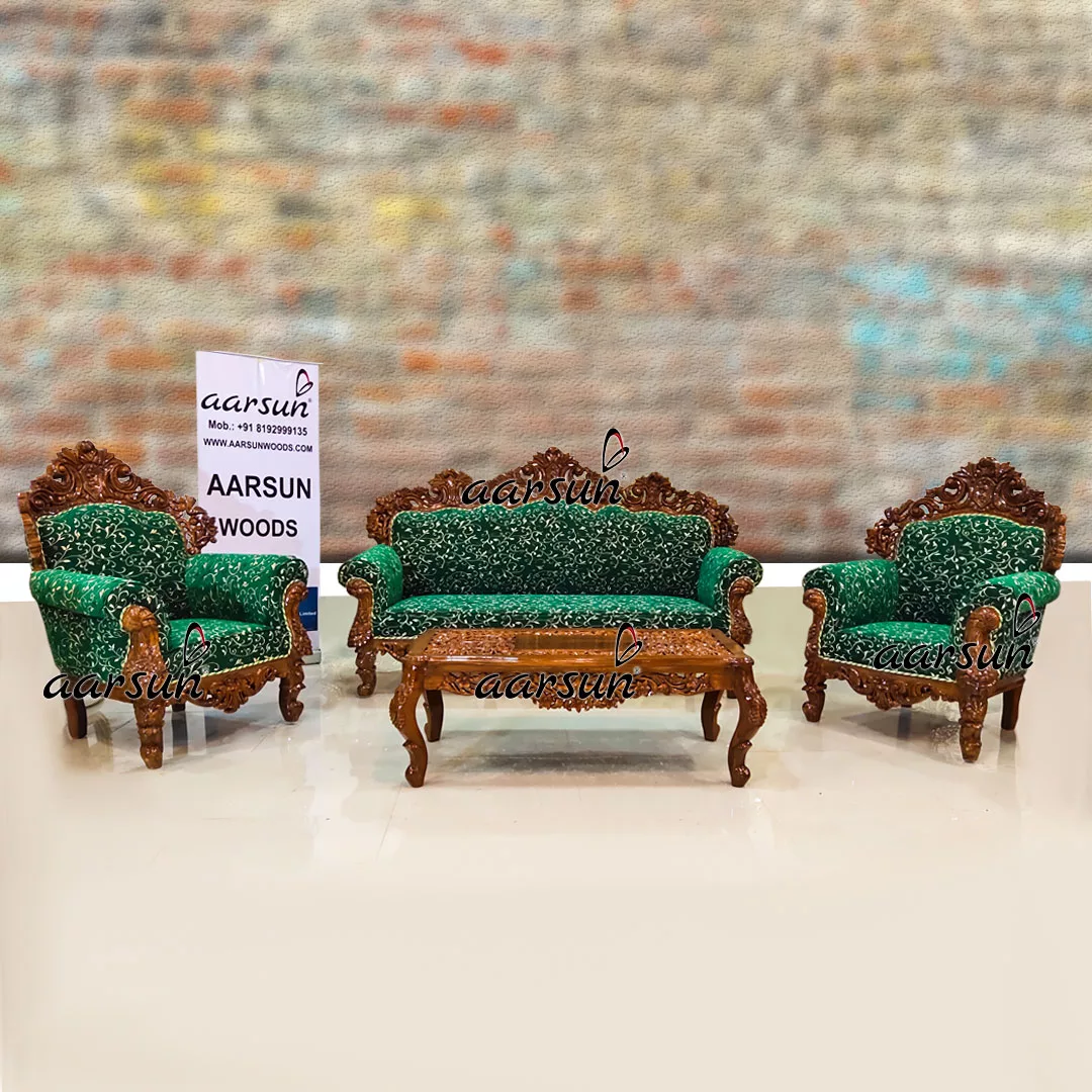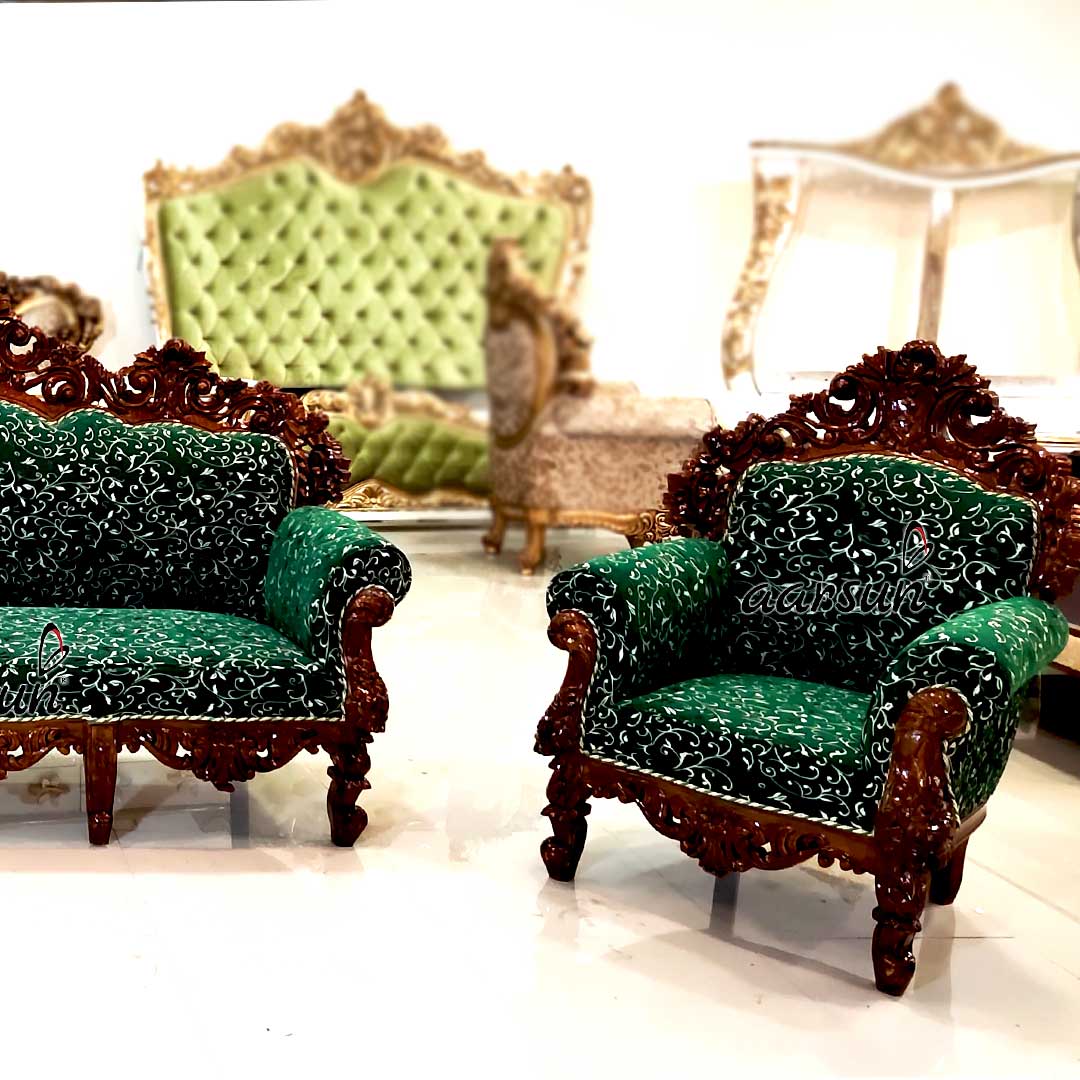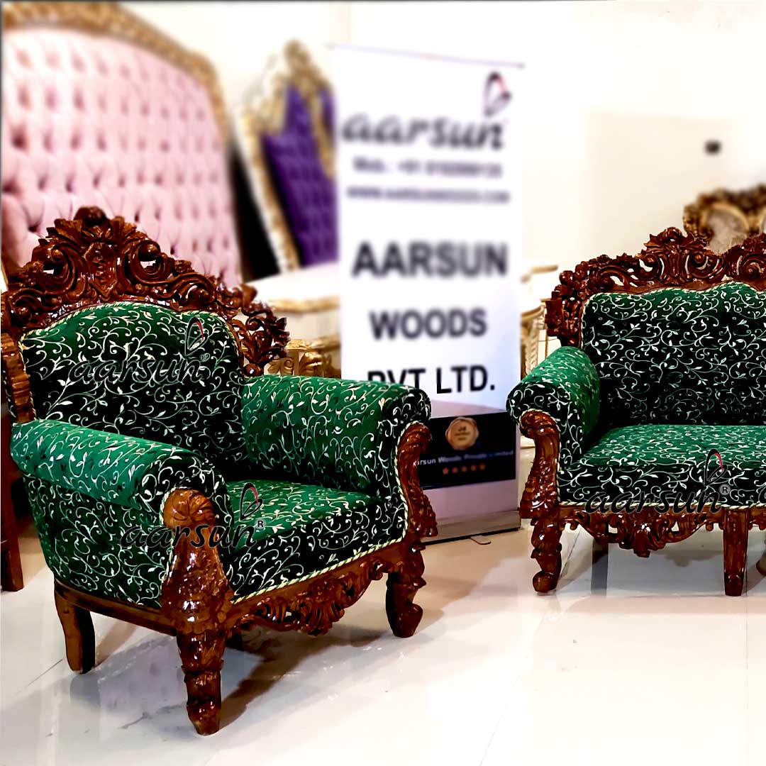 Aarsun brings you an elegant sofa set design that can easily be placed in any of the seating areas – modern or classic. The Timeless designs can be customized in terms of size, color shade, fabric, and wood. The sofa set can be made to any of the seat numbers you require.