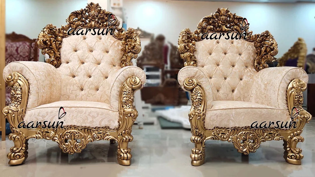 The Luxurious Chair is huge just like the 3 Seater and the 2 Seater with a Fully Carved Crown at the back and upholstered handles that give it a Throne-like feeling. That is the main reason the chairs are also called Maharaja Chairs / Victorian Chairs.