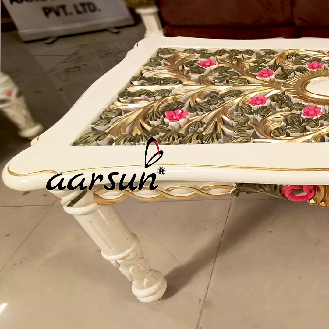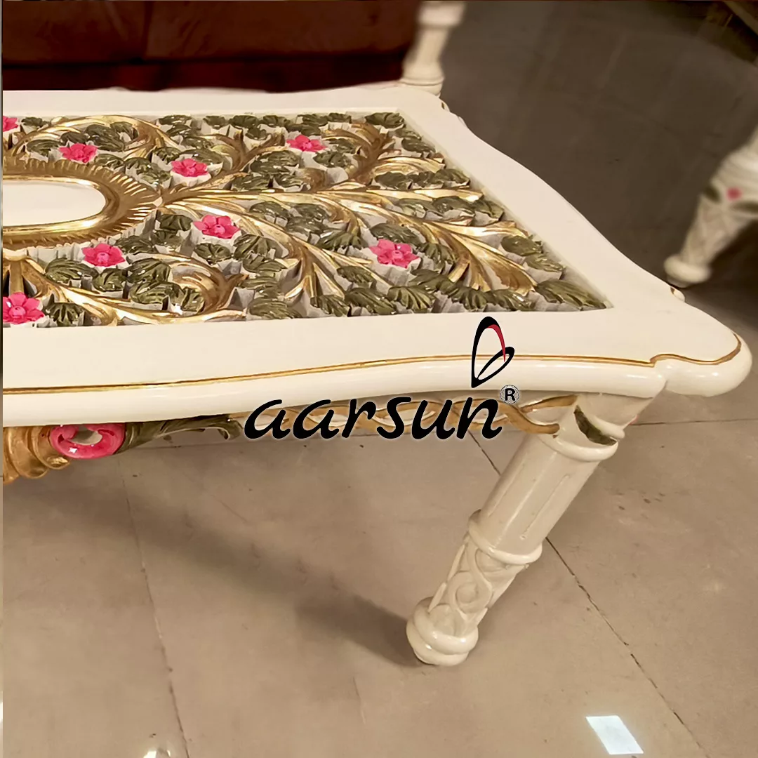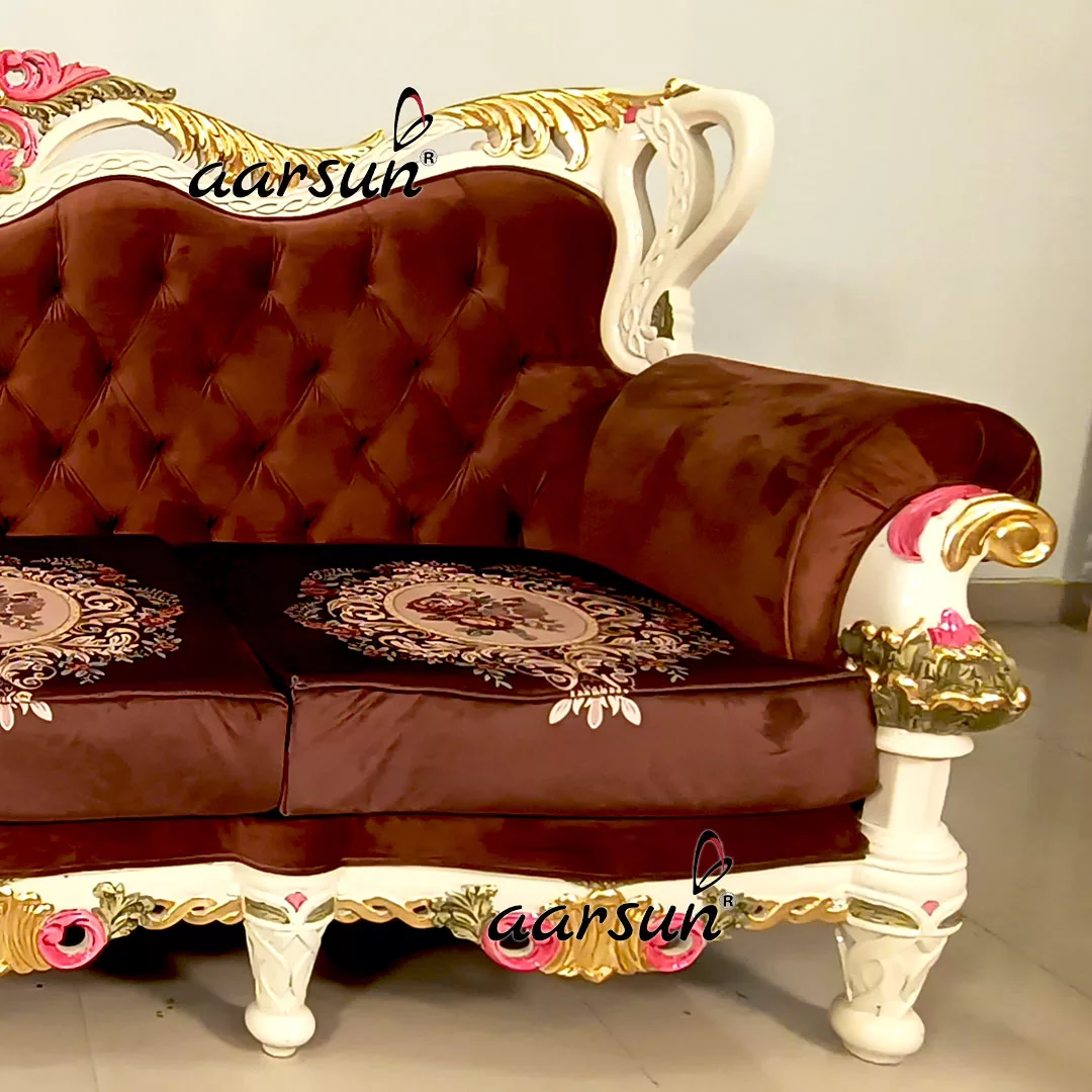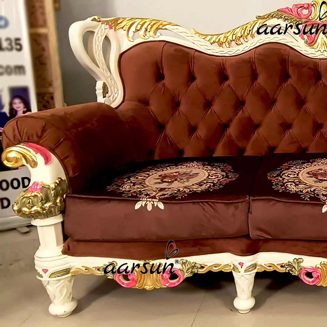 Aarsun brings you an Italian-style Ultra Luxury Sofa Set in Gold Leafing & Multicolor Shading with a beautiful off-white finish as its base color.