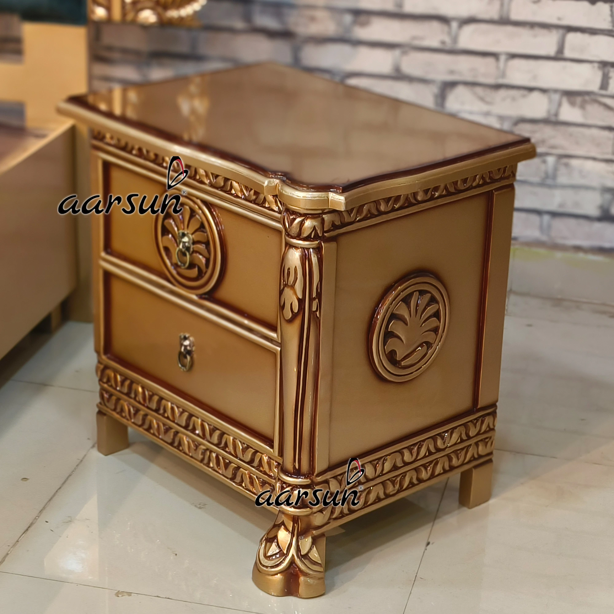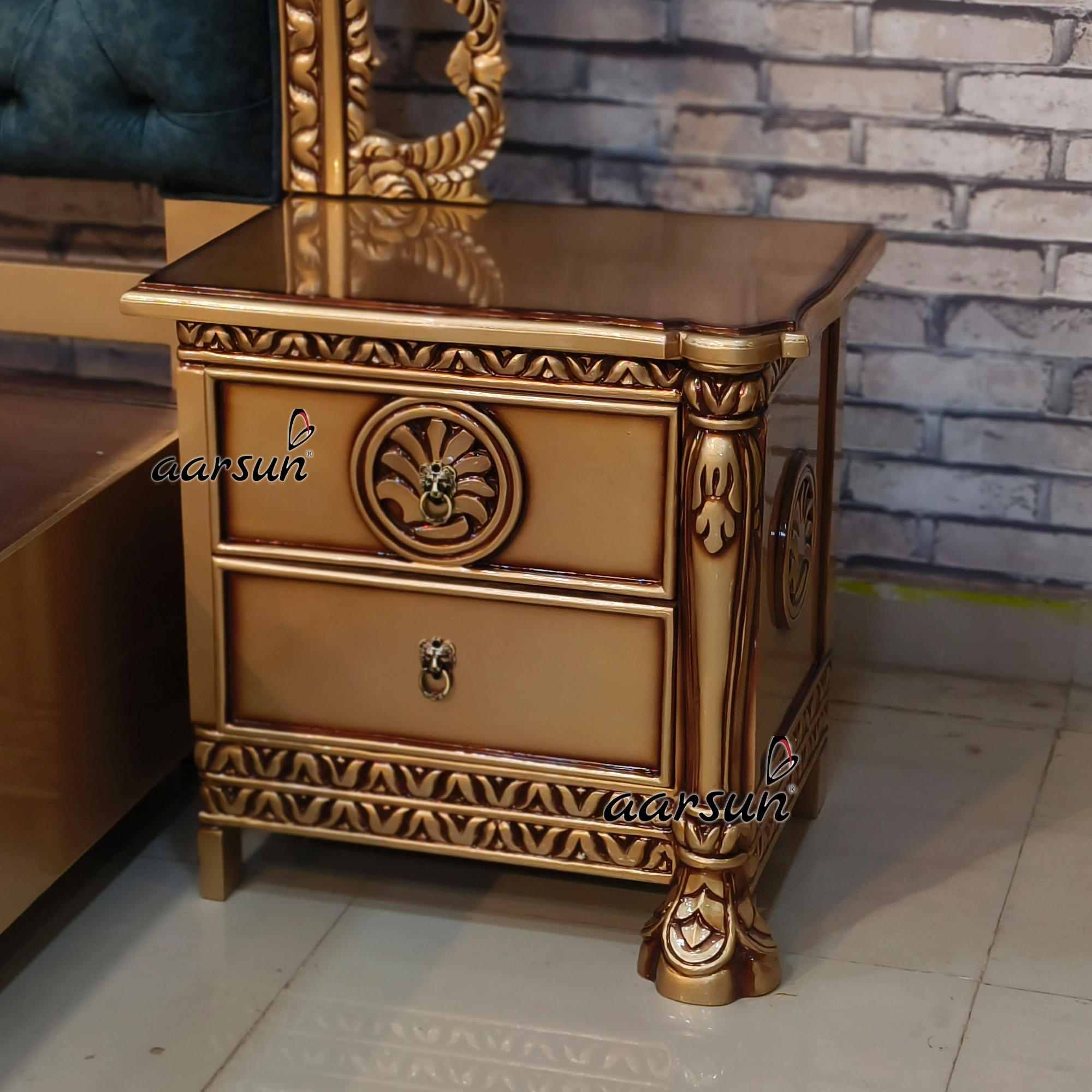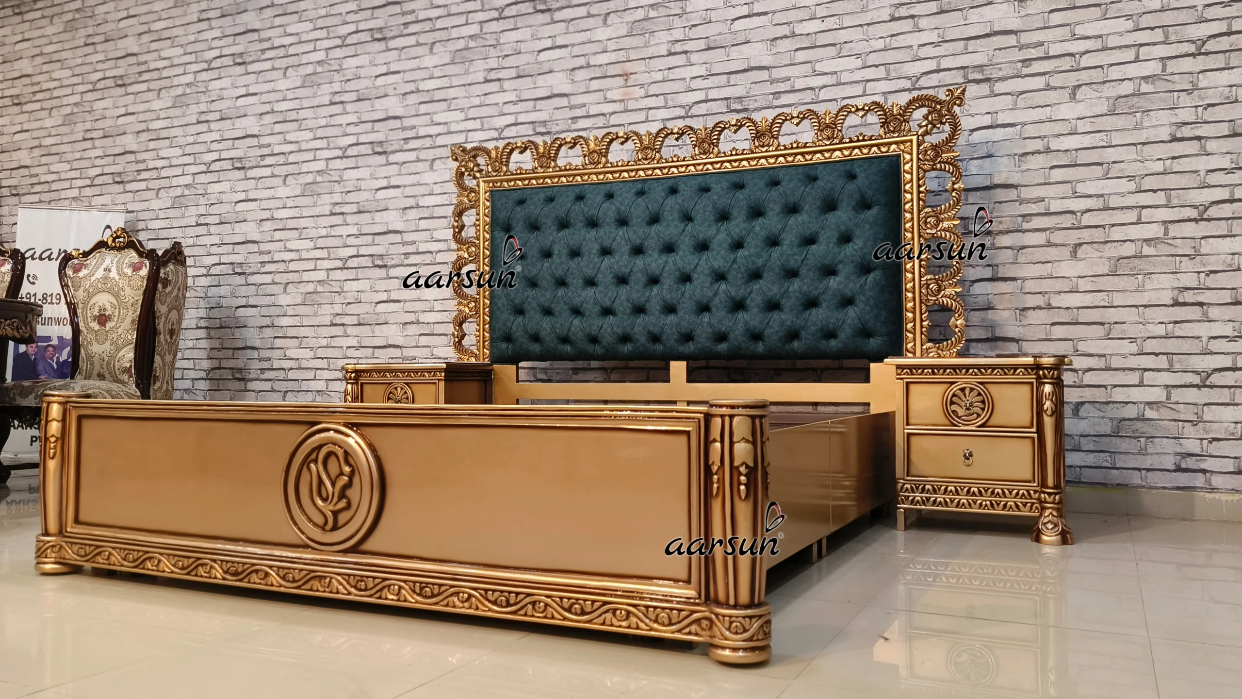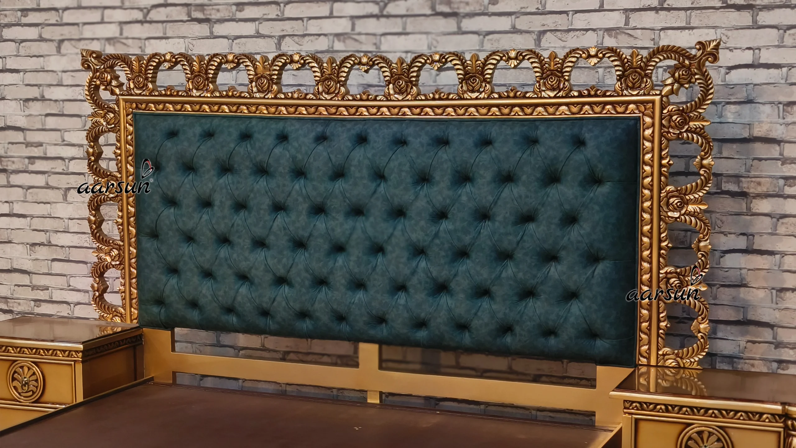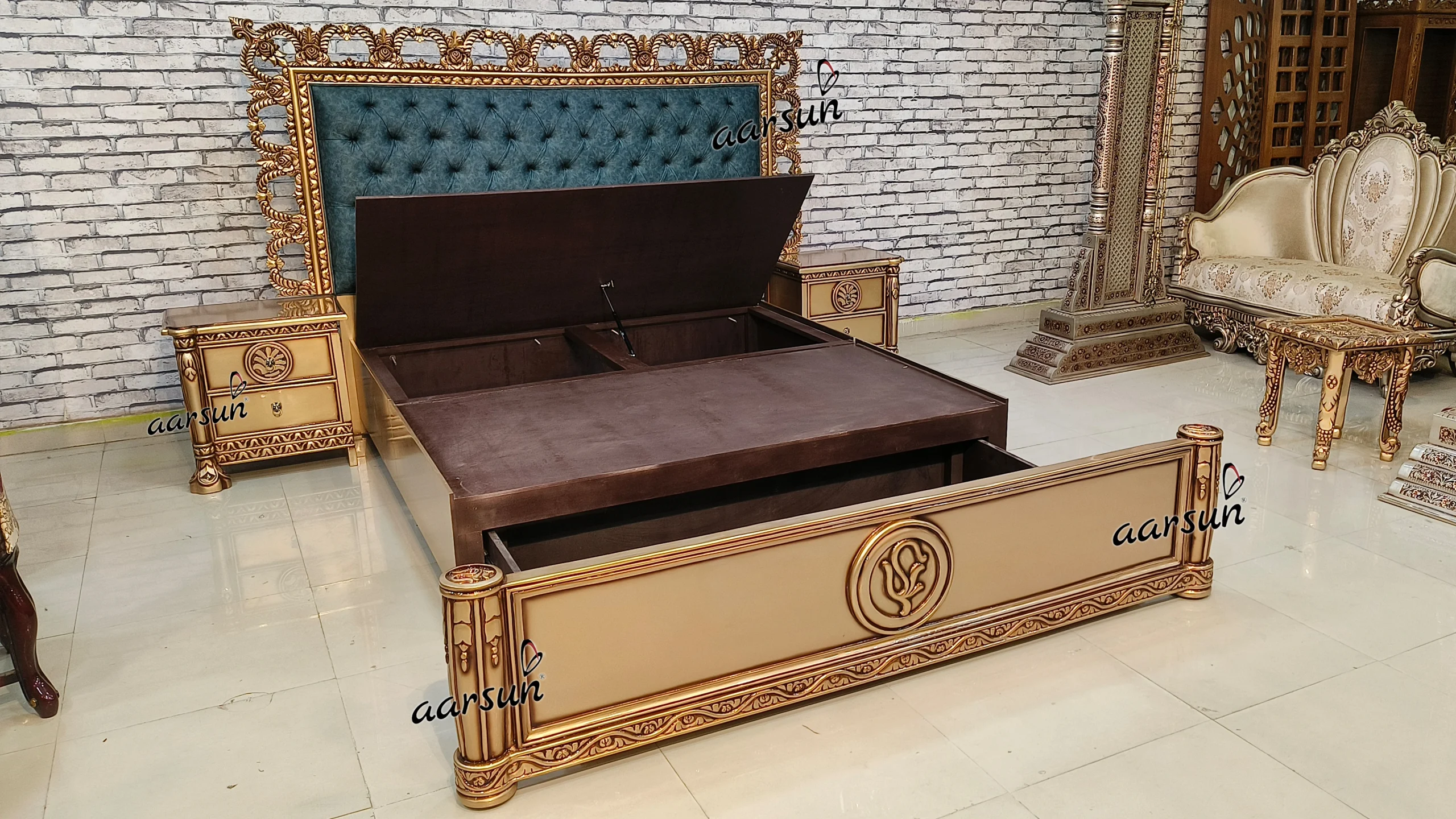 Aarsun Woods presents a unique bed design with 2 different storage. The bed is made of solid teakwood and has a rectangular frame. With a carved headboard and footboard, this bed is handcarved beautifully by our skilled master artisans. The cushioned headboard provides extra comfort. The quilting design adds a unique charm to the bed’s overall look. This bed is modern in look and with a smart front storage, which is easy to pull out and push inside, because this unit has wheels underneath for easy movement, and accompanied by a second storage box for keeping essentials like blankets, pillows, bed sheets, cushions, and other items.  The middle part is made in plywood. This bed was customized as per the client and was delivered to Maharashtra. This bed comes with two side tables for keeping essentials.