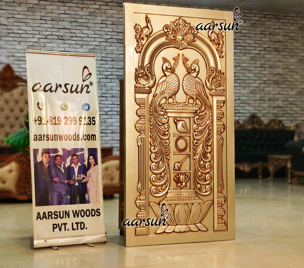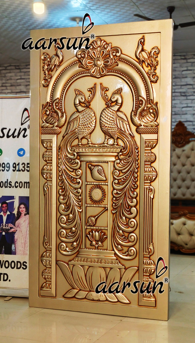 When choosing doors for your home, the theme of your interior design should be matched by the door. We offer a unique door design in a champagne gold finish, one of our finest door from our door design collection. This door is designed from solid teak wood using a combination of machine and artisanal skill. The design work and computer graphics are done by Aarsun Designer.