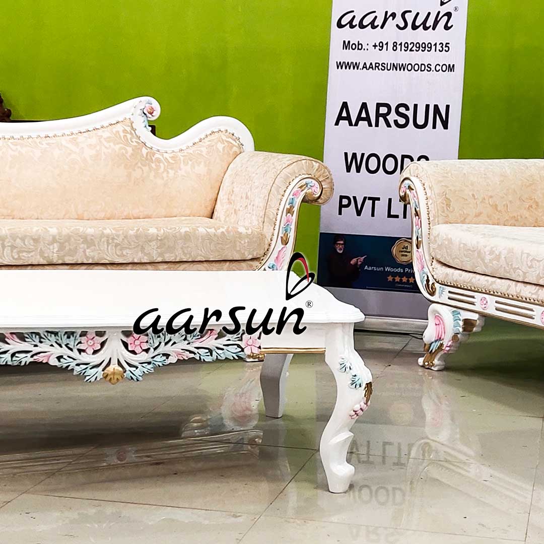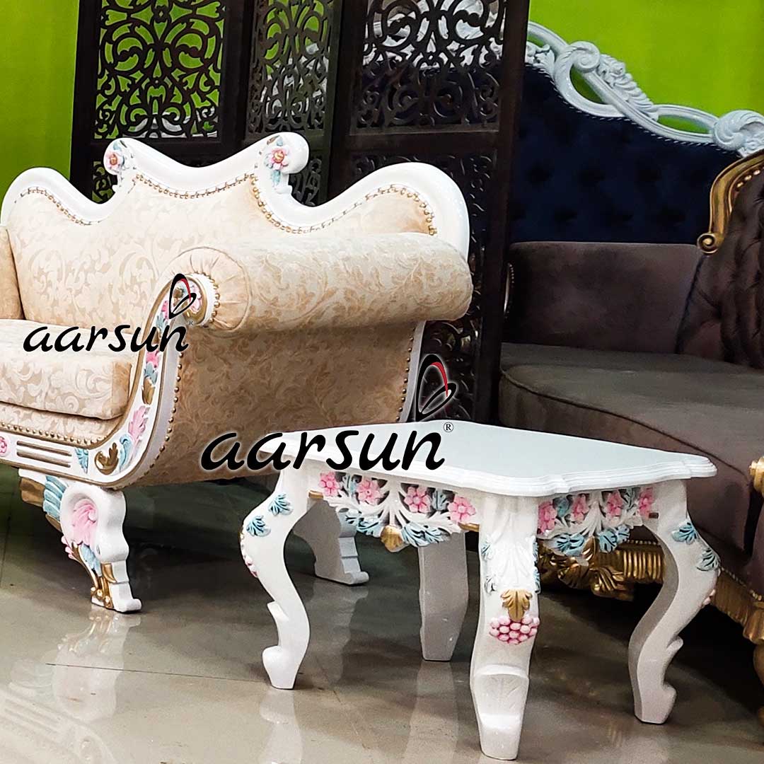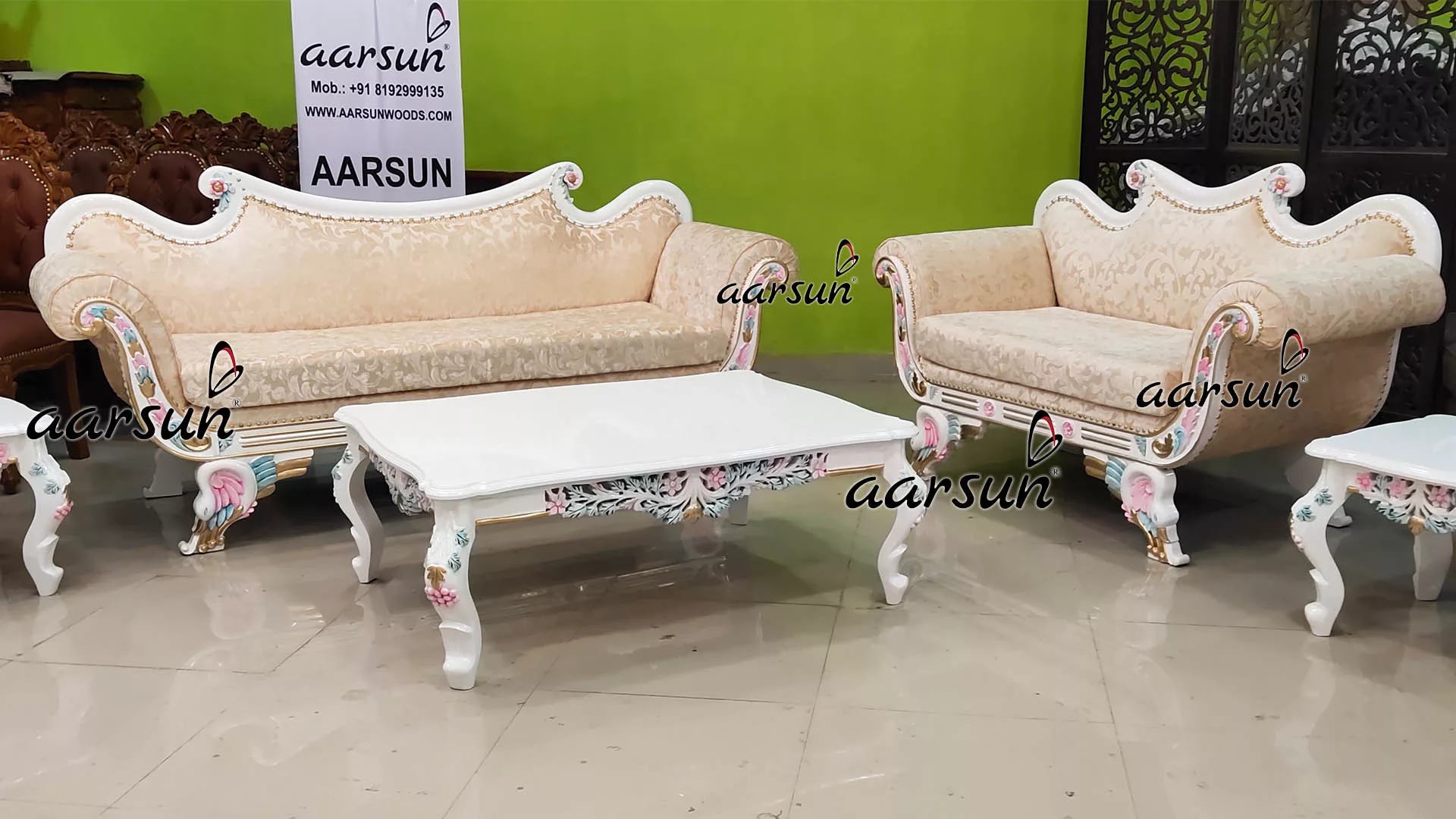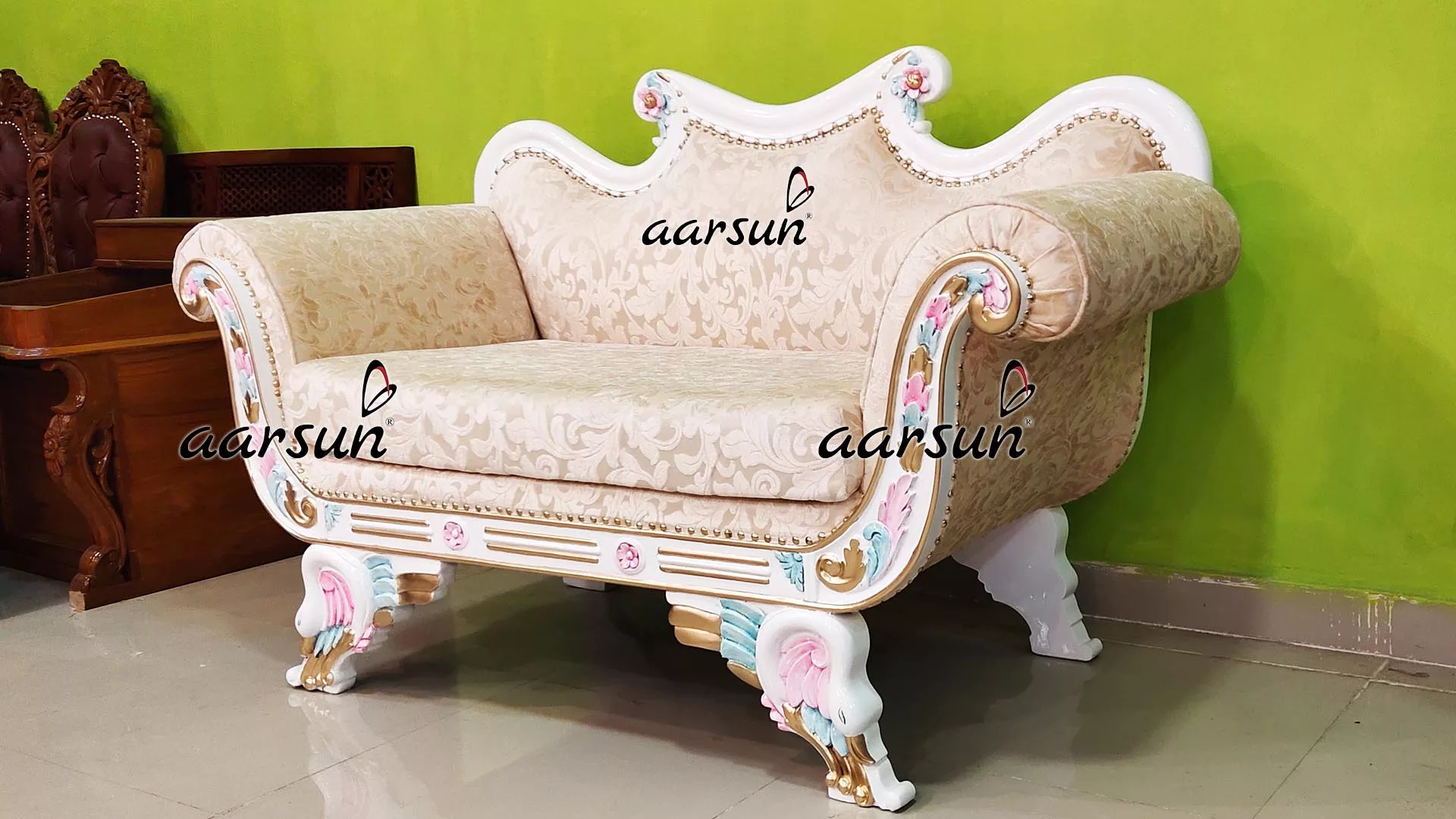 “description”: “Aarsun brings you a Royal Couch Set in teak wood with white base and multicolor highligts on the carvings. The unit is made from teak wood and we can customize it as per your home. We deliver globally. “,