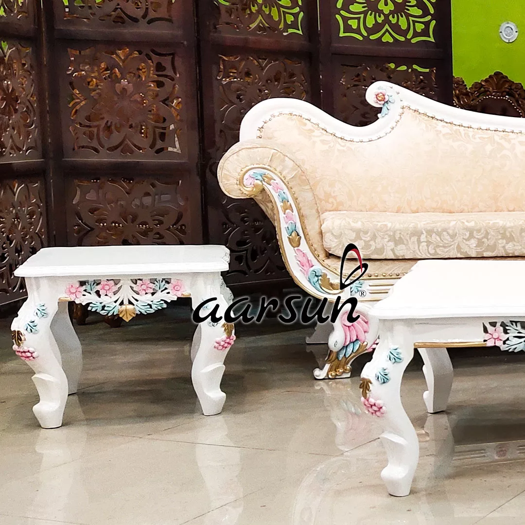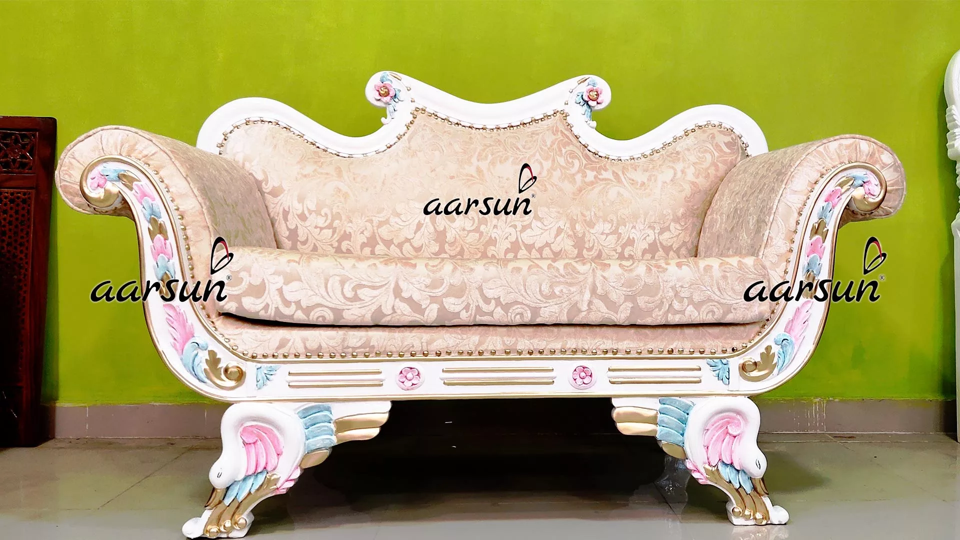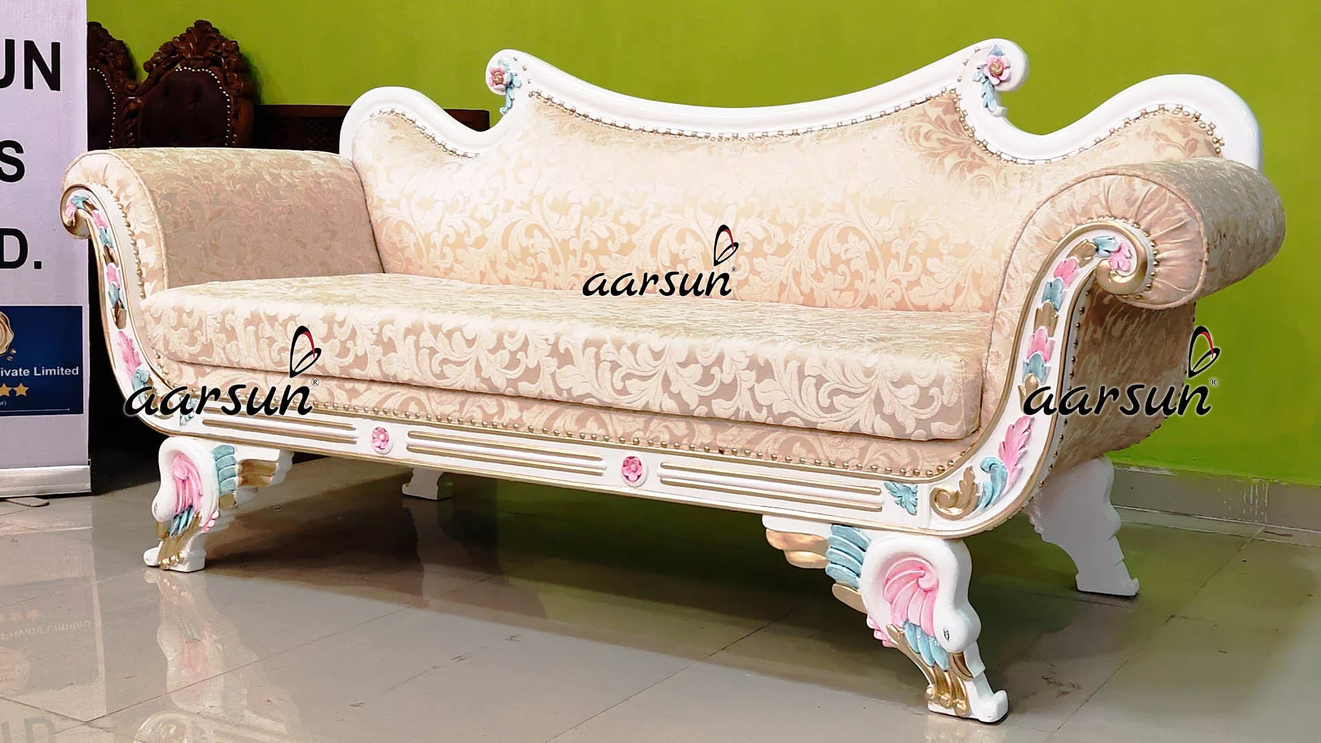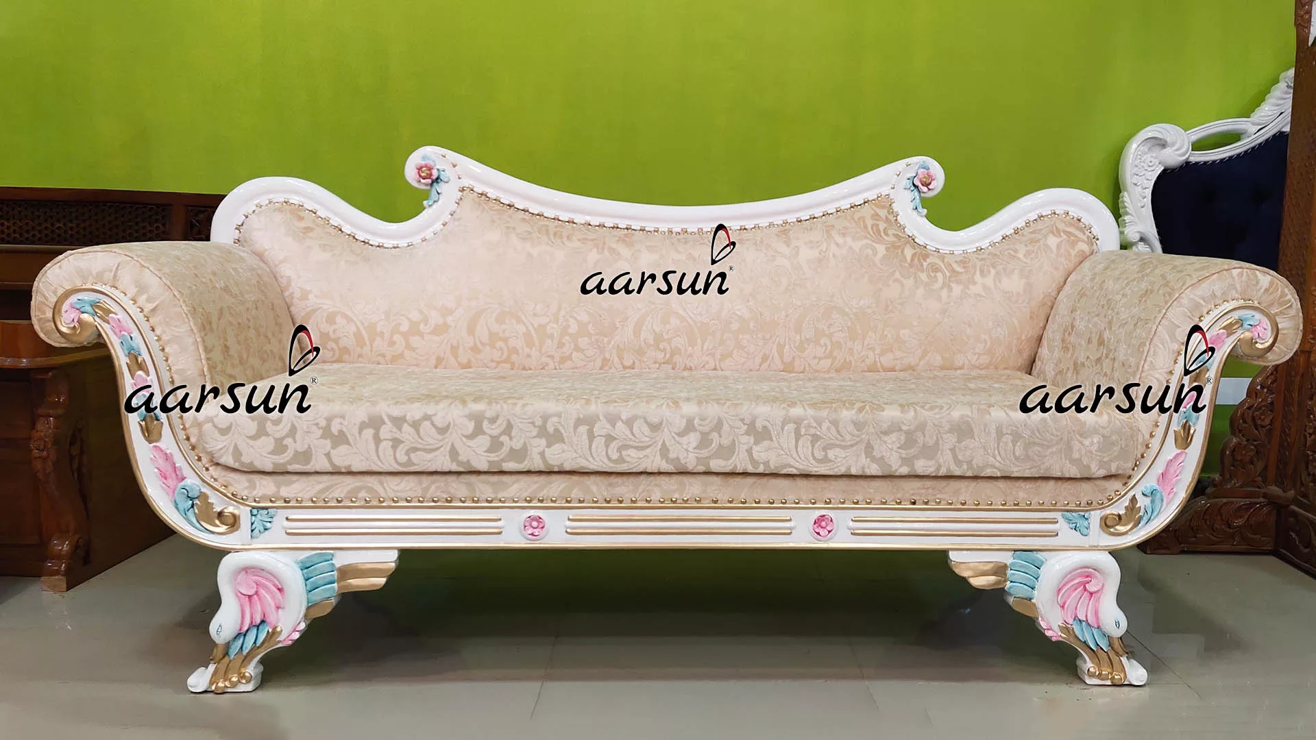 “description”: “Aarsun brings you a Royal Couch Set in teak wood with white base and multicolor highligts on the carvings. The unit is made from teak wood and we can customize it as per your home. We deliver globally. “,