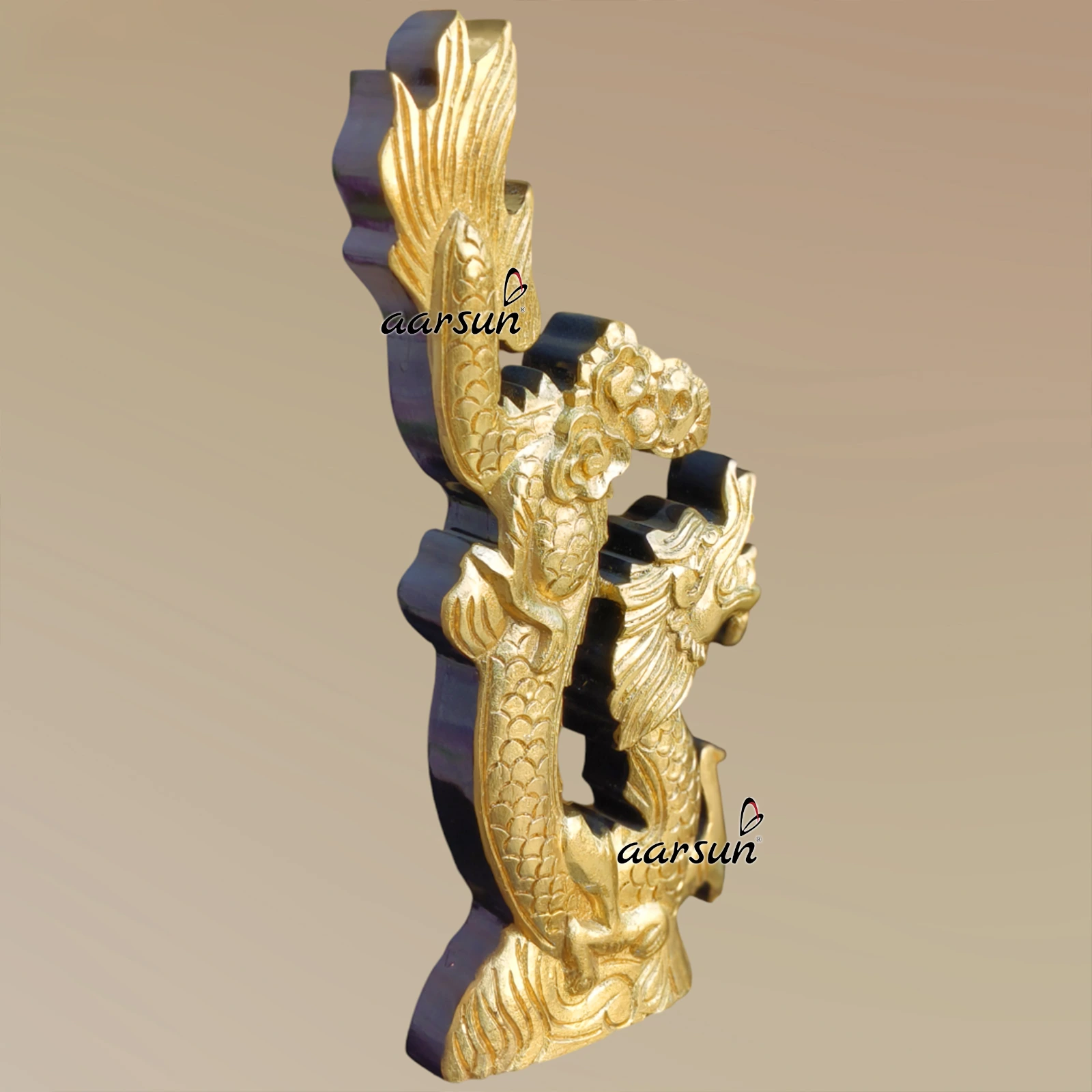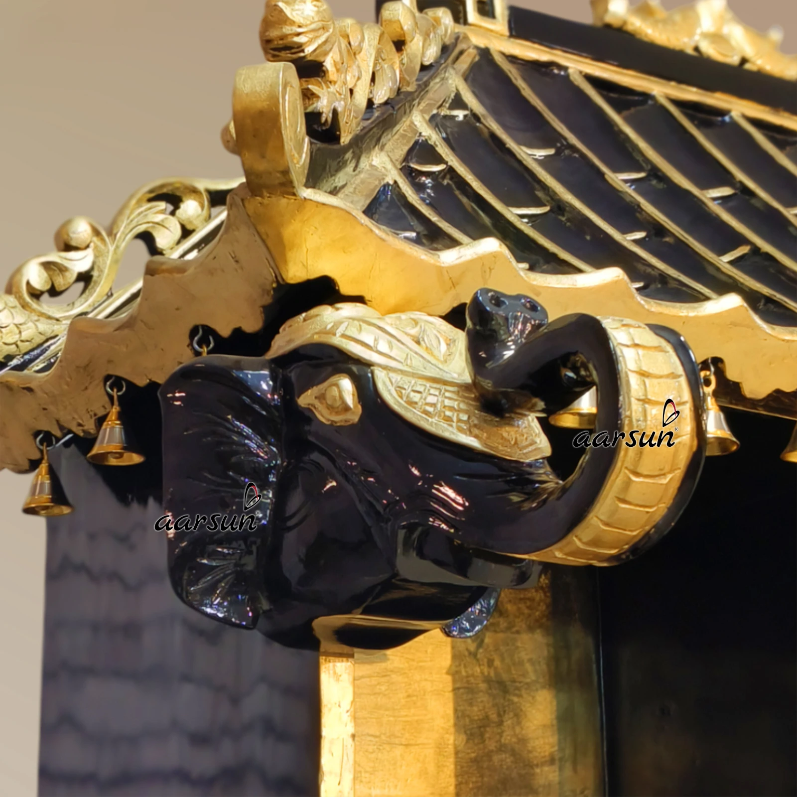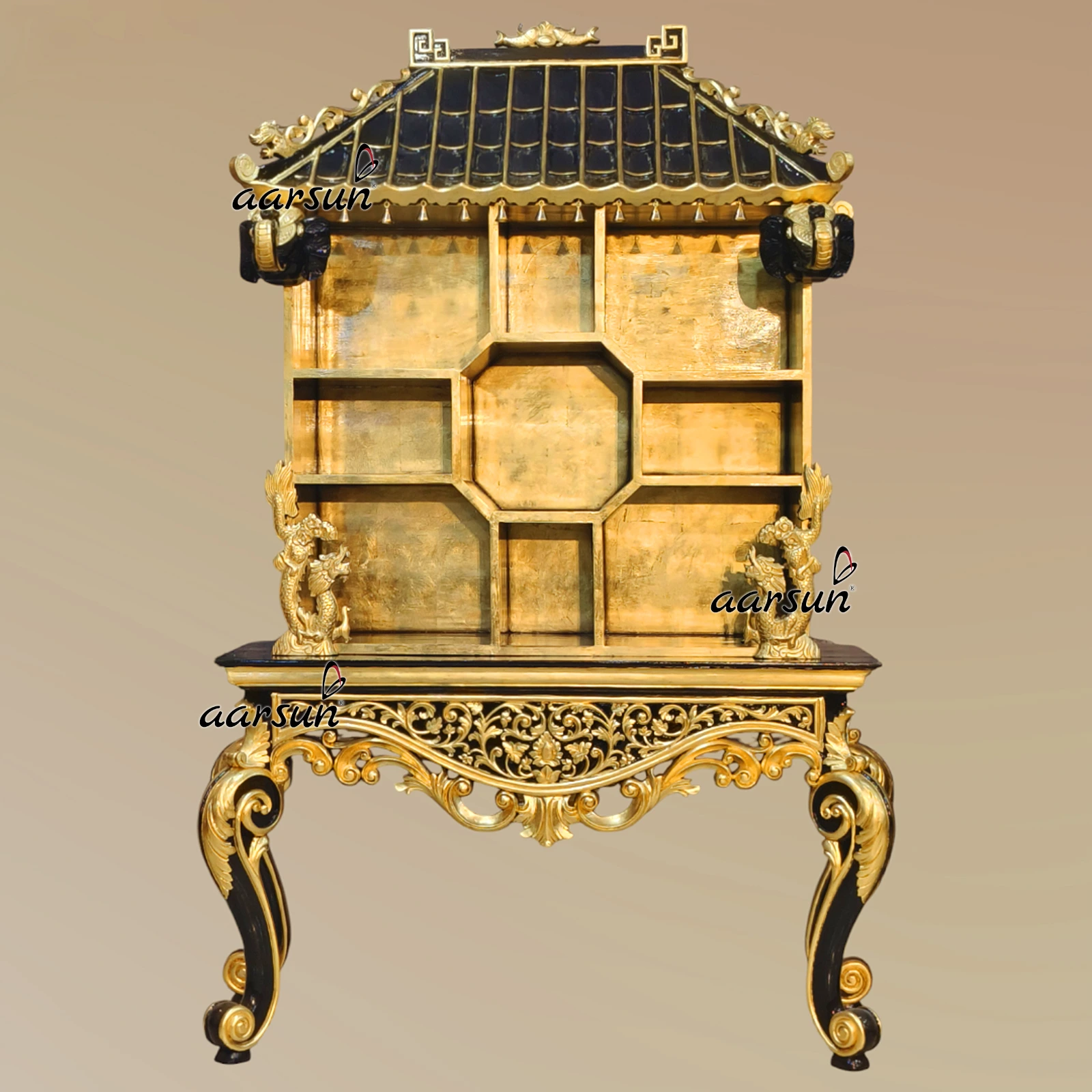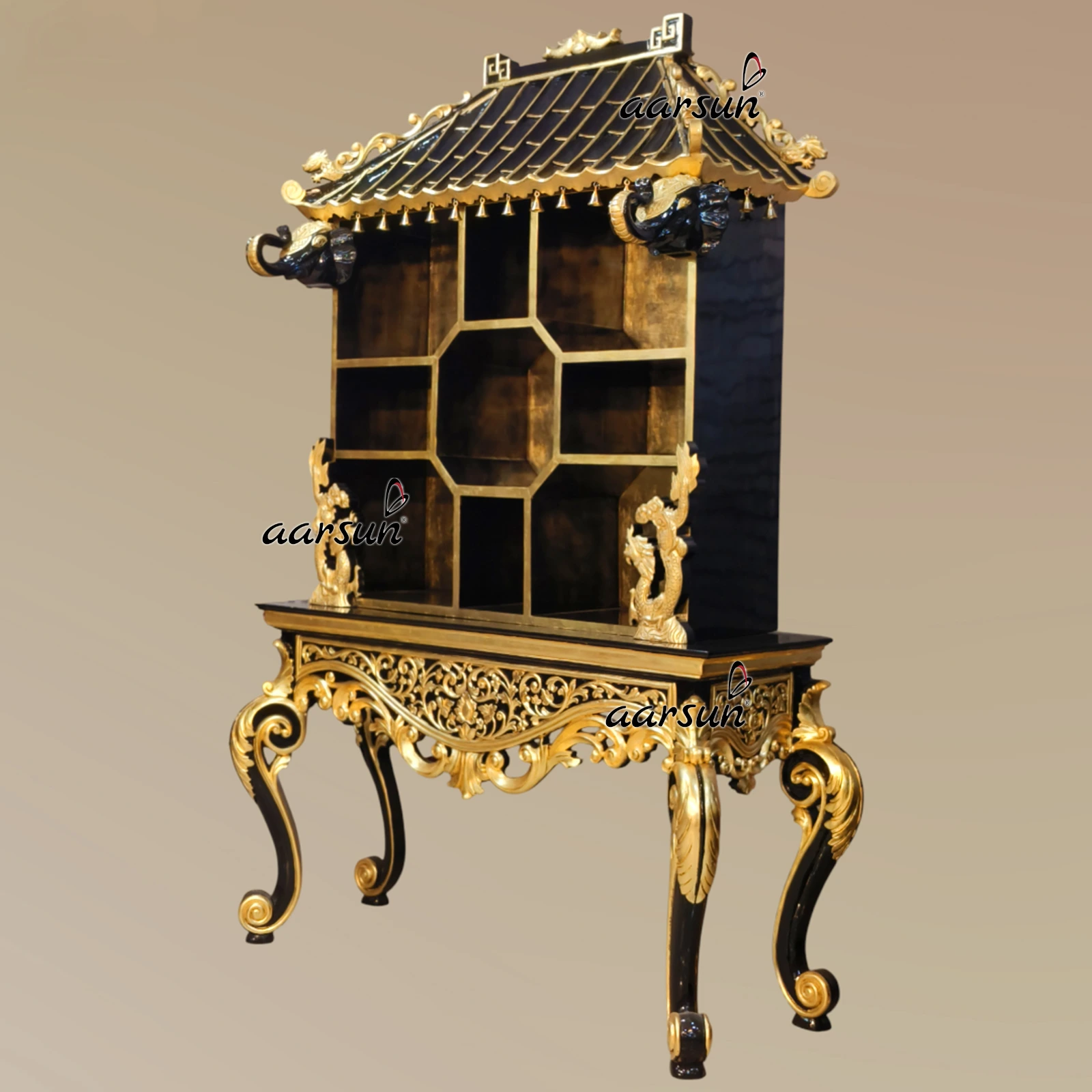 Aarsun presents a unique designer decorative cabinet unit for the home with a top part in the Pagoda temple design. This furniture unit is durable because it is made with solid teak wood. We have made this beautiful designer cabinet as per the design given by the client, who is from Hungary. Our clients are happy with our services because we make what our clients want and require. This furniture unit is made for decorative purposes/showcase purposes. This pagoda is black in gold color with an amazing design. The Gold leafing work looks royal and adds a unique charm. This furniture unit can be used as a decorative piece where the top is in the form of a pagoda with a wooden dragon and elephant head design. This unit is adorned with a beautiful design at the console. With the middle area for the showcase and a top part with a pagoda slanted roof with a dragon carved on both sides, this is not just a furniture unit but an epitome of true workmanship. This unit is in black lacquer paint with gold-leafing work which adds a royal touch to the entire unit.