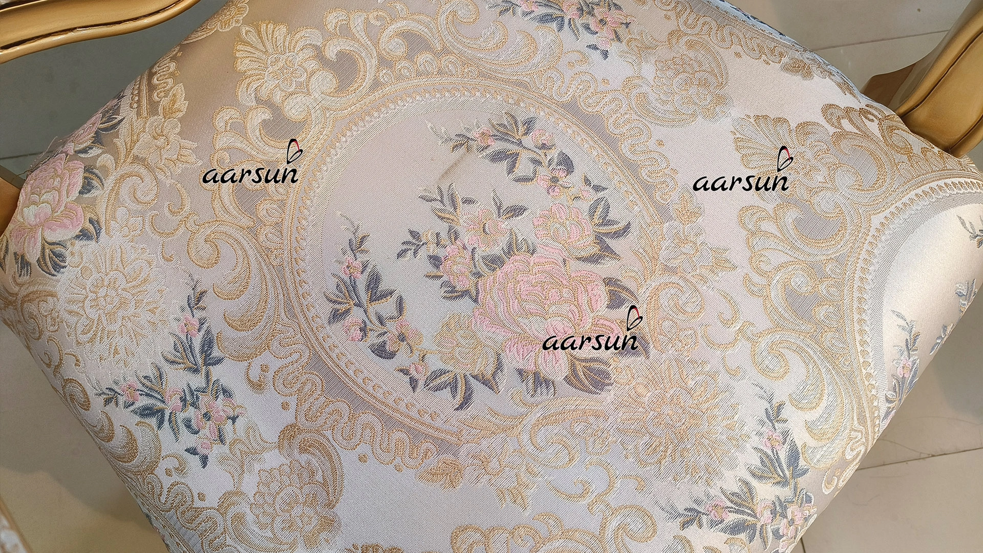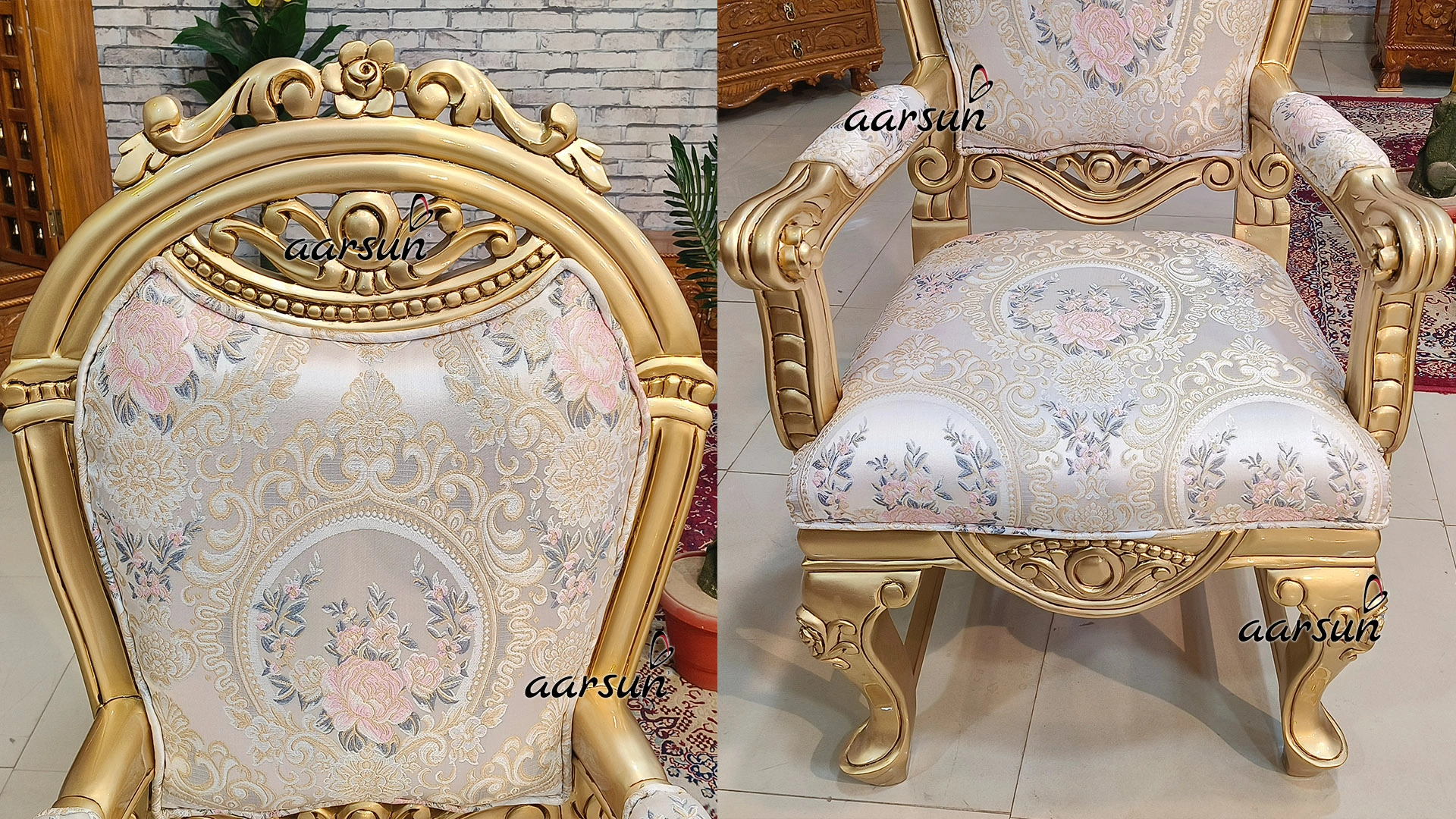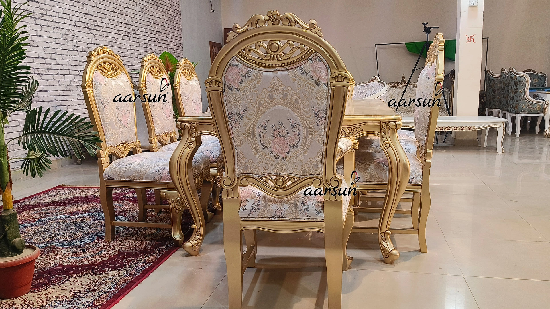 With antique gold paint, the dining set looks royal and adds a luxurious touch to your dining space. The set consists of both king chair (with handles) and queen chairs (without handles).