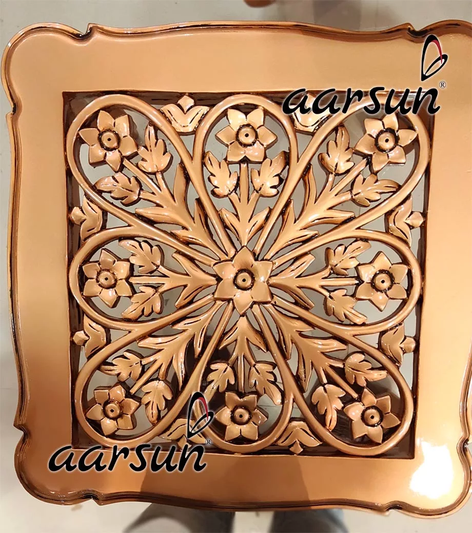 The 5 seaters victorian Royal Sofa Set in Copper Paint with the center and TV unit is made of premium quality Teak Wood with floral carving. It has an elegant design that enhances the interior decor of your living room. The upholstery of this sofa makes it very comfortable to sit while the floral carving back gives the traditional look to the set. The front base consists of floral wood carving similar to the upper back. The unit is supported by beautifully carved legs.