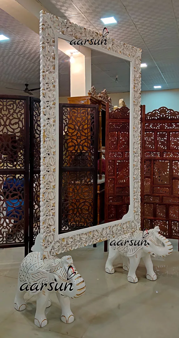 We present you with an incredibly unique Mirror Frame in White with Golden Highlighting. Just a look at this amazing unit and you can make out yourself the craftsmanship that Aarsun artisans offer. The designs are carved out in Solid Teak wood by hand and no CNC router is utilized in making these art pieces.