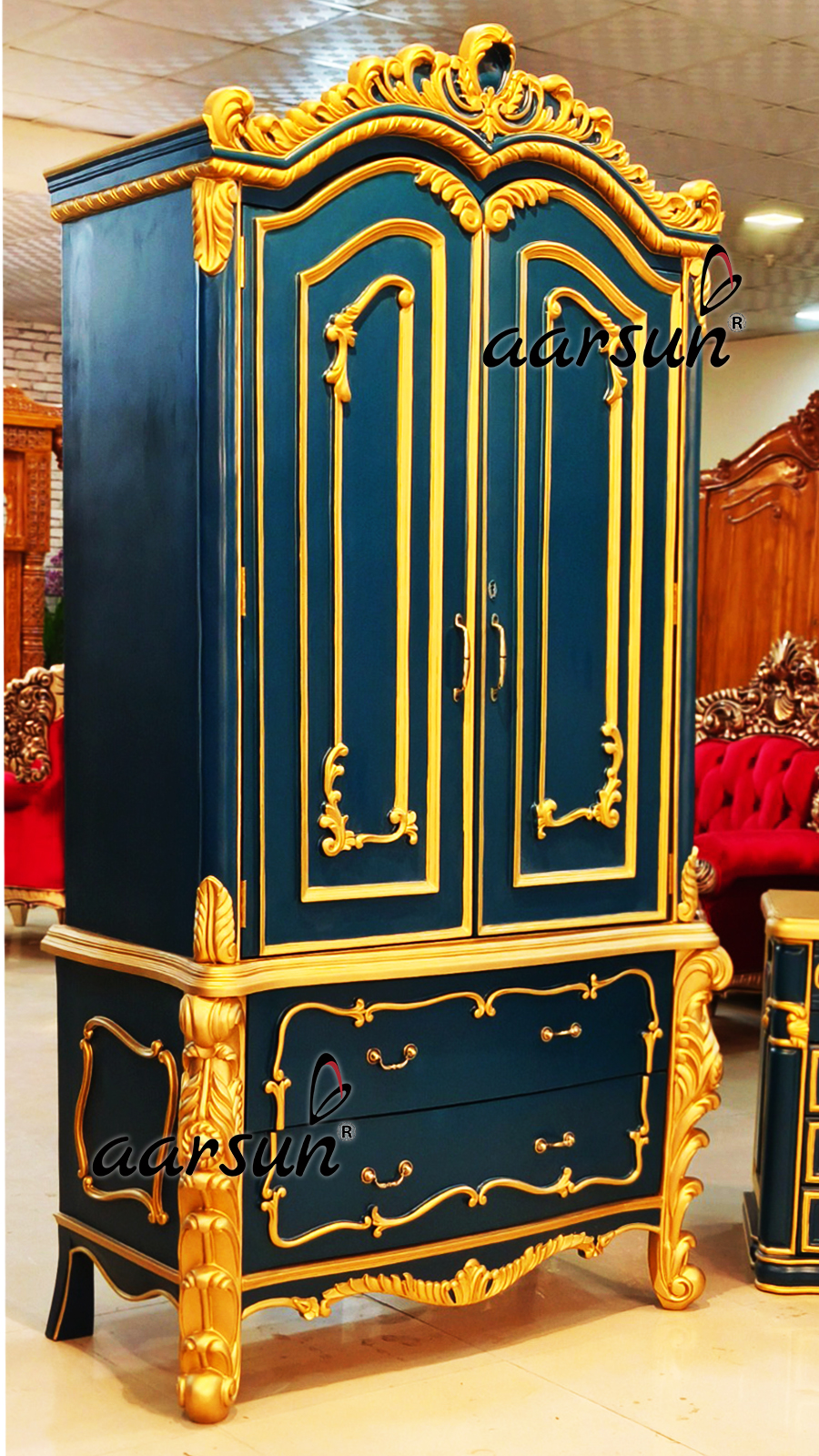 The wardrobe is crafted from teak wood and polished in Persian teal, with a design selected by the buyer from furniture catalog. Golden highlights have been added to enhance its elegance. It offers ample storage space, including drawers with a smooth, soft open and close mechanism. The wardrobe inner area is fully finished in gold and includes a cloth hanging rod. This almirah features a classical Italian design, showcasing impressive leg work and a crown shaped top.