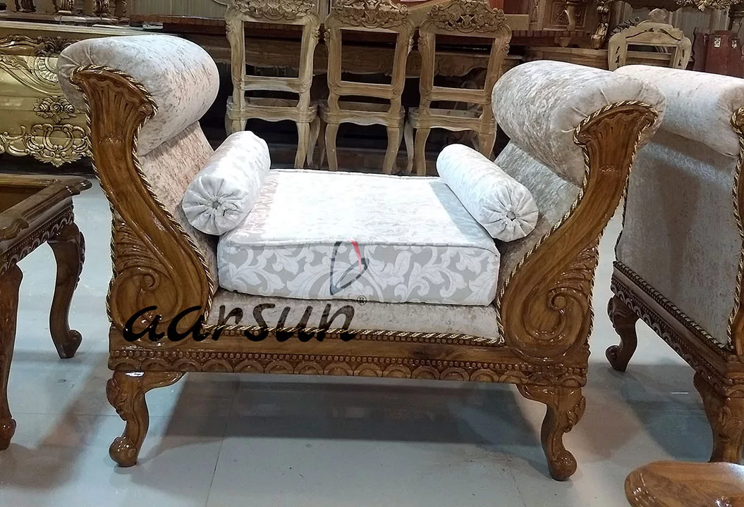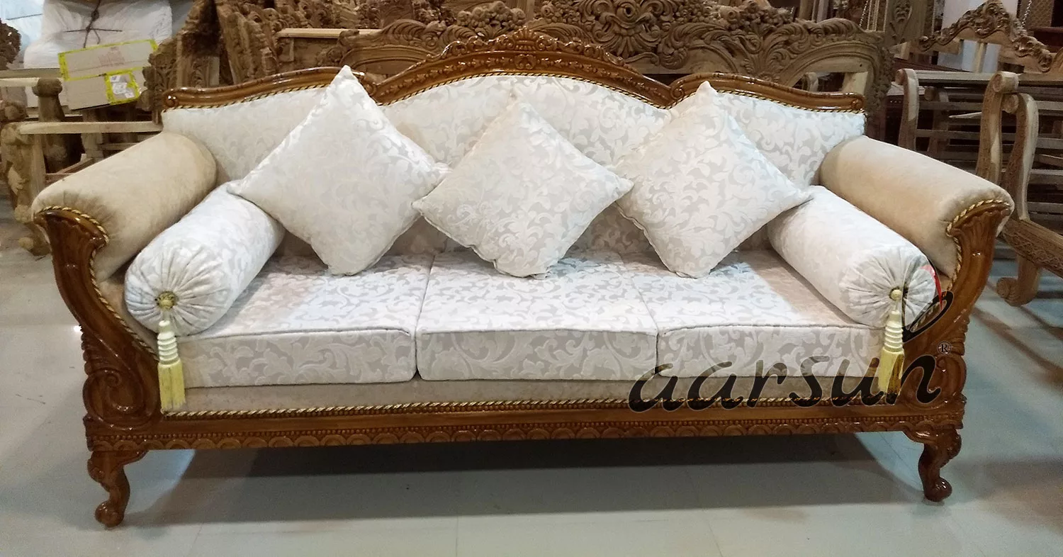 Aarsun Give your home a complete look with this traditional yet Royal Design Wooden Sofa Set. It is designed with handmade by skilled artisans which adds to its beauty. The set includes a (3+2)sofa, (1 +1) settee, and (1) diwan crafted from premium quality teak wood.