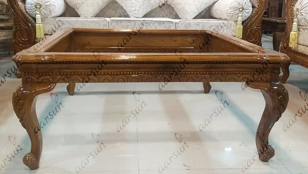 - Aarsun Teak Wooden Sofa Set 3 + 2 +deewan + 2 open back settee, center table, and 2 side tables