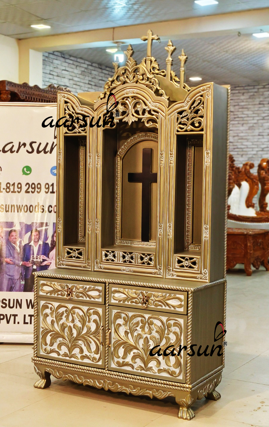 Aarsun presents a delightful wooden altar. Designed with two pull out drawers and two cabinets for storage. Whether placed in a home, chapel, or sacred space, its timeless design complements various settings.