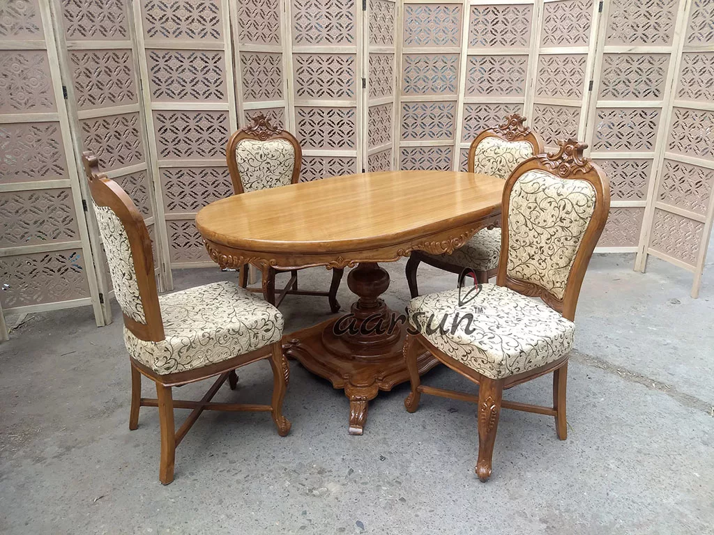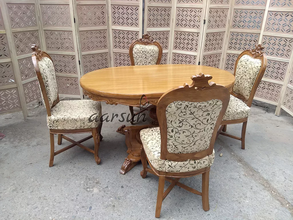Aarsun offers to you handcrafted Wooden Classic Dining Set made from premium quality Teak wood by skilled artisans. A transitional style dining set that features a dining table, and 4 side chairs with Beautiful fabric. It is finished in Brown Color for a dazzling appeal. The dining chairs look beautiful and make this dining set unique. The dining room set features a really attractive design. it’s a beautiful addition to the dining room area.