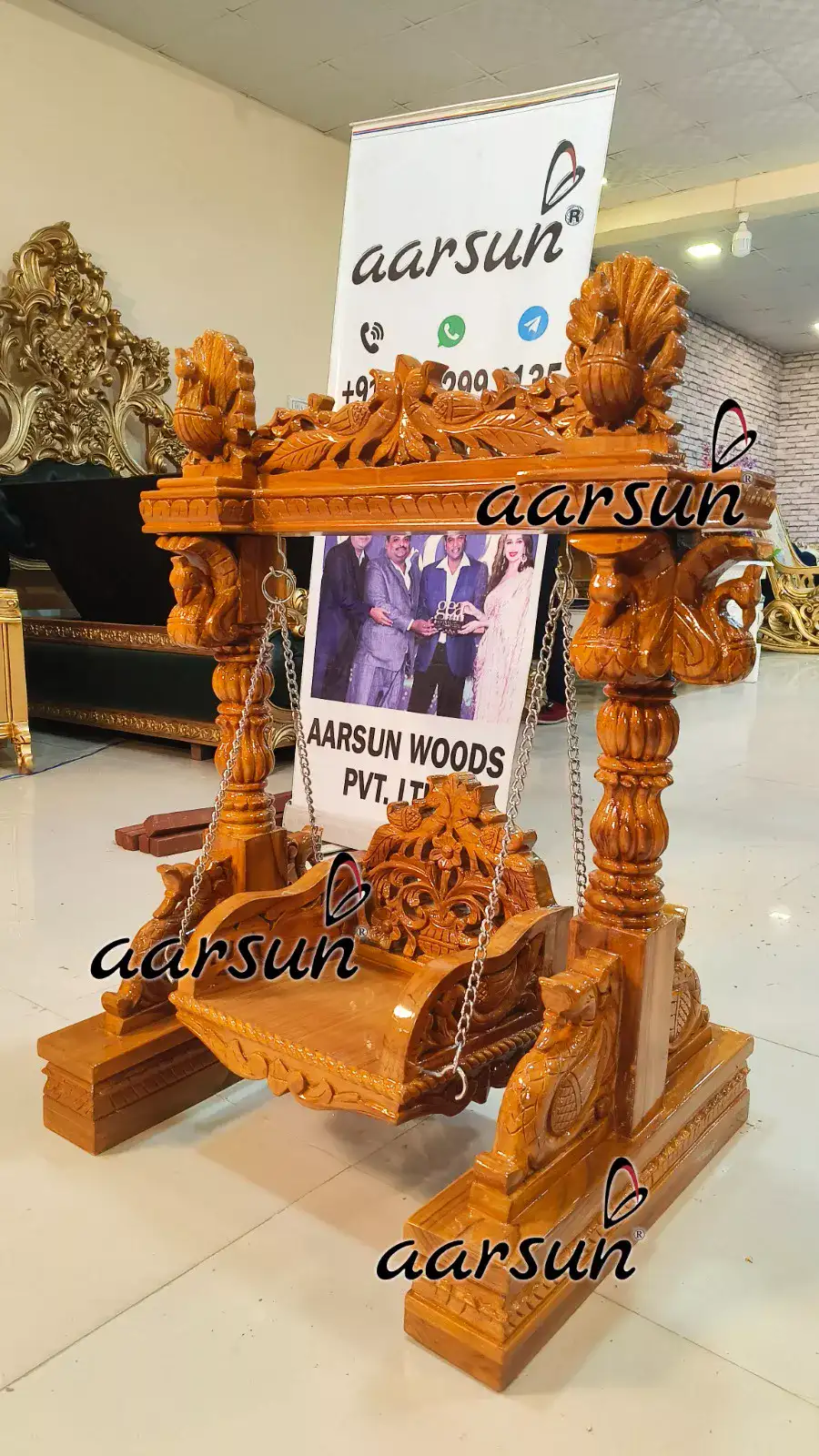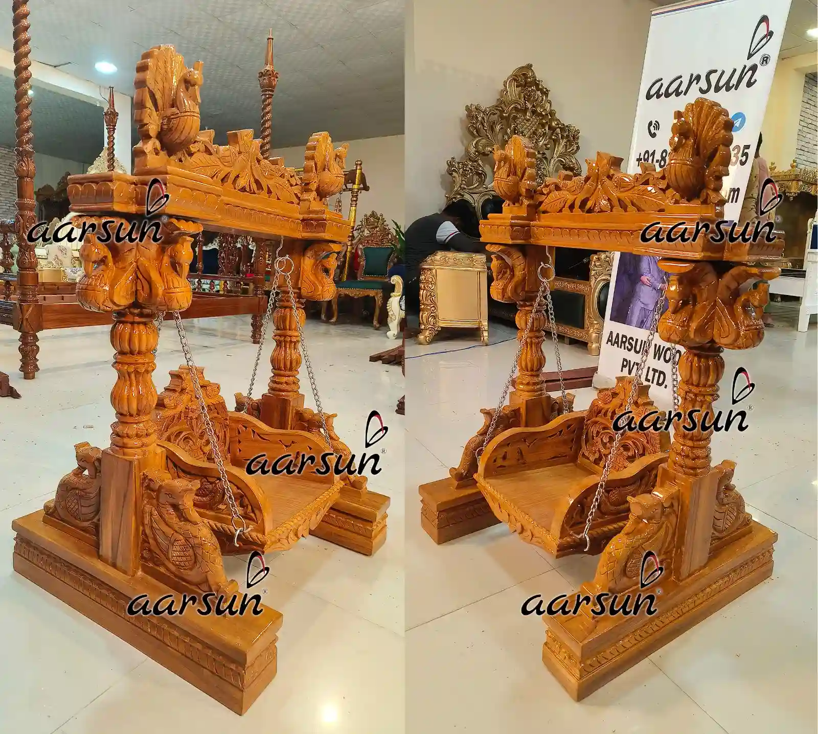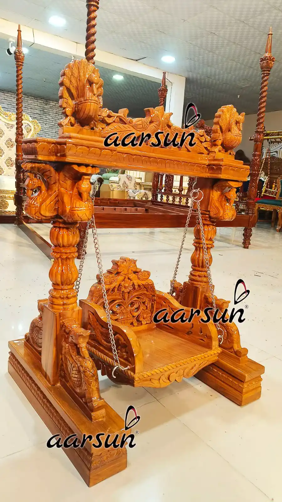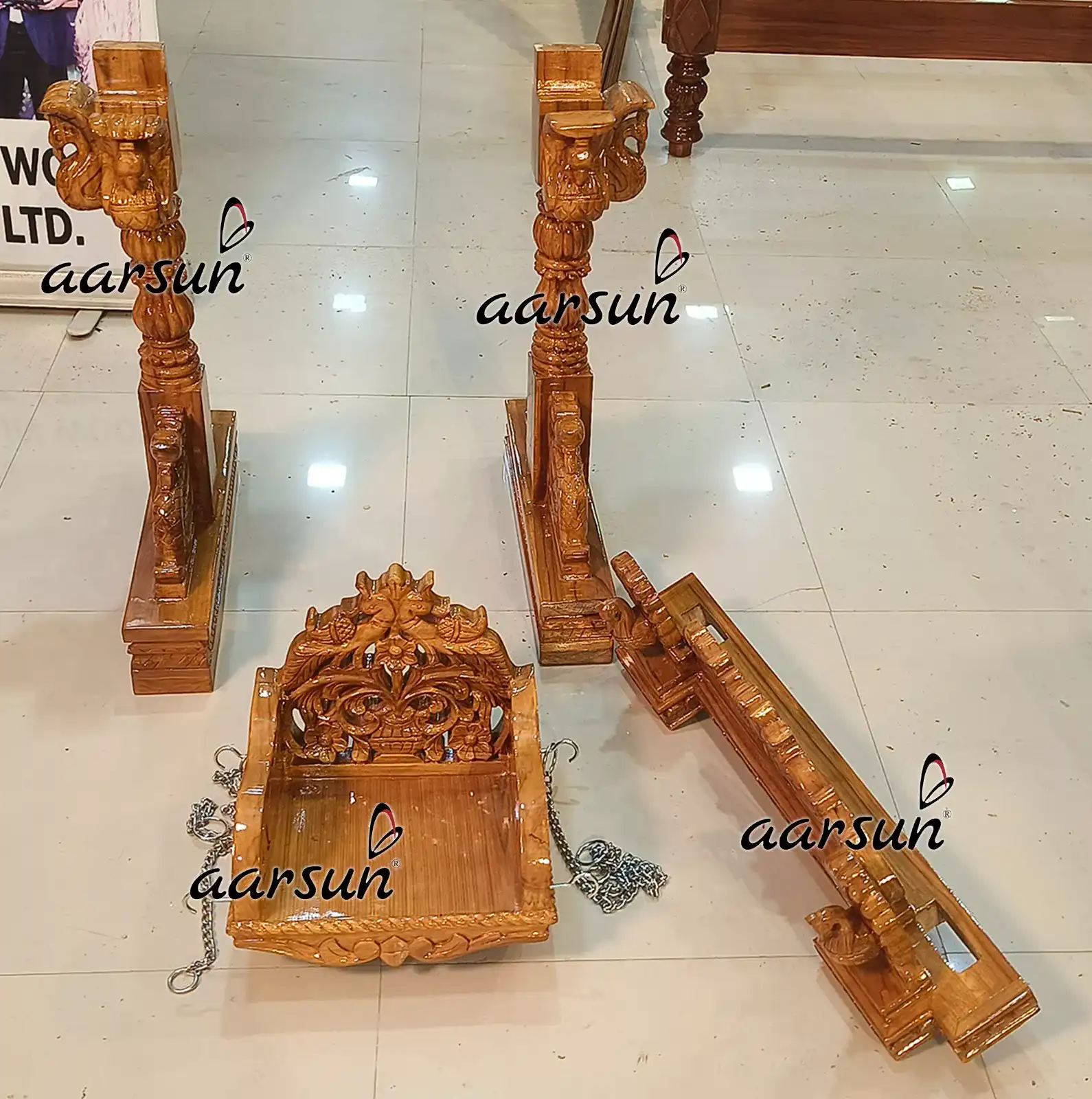 Aarsun Woods presents a stunning Teak Wood Laddu Gopal Jhula, handcrafted with intricate carvings and fine finishing. The jhula consists a full frame swing, a swing seat, and steel chain connecting the swing seat from the top frame.