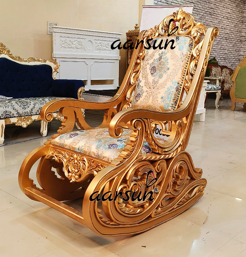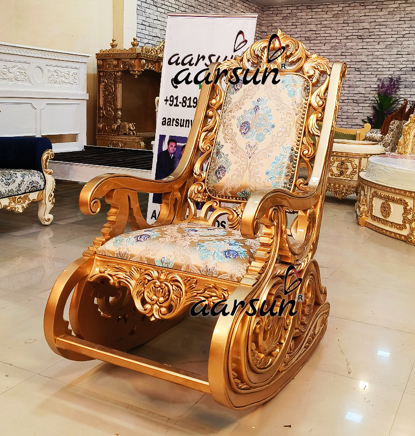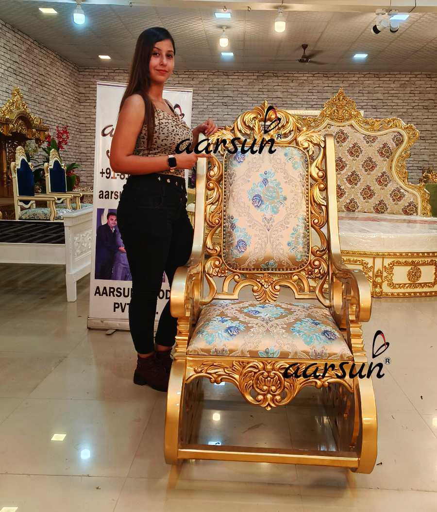 Aarsun presents a wooden rocking chair in gold polish. The unit is designed by our skilled artisans using premium quality teak wood. The chair’s support features heavy carving in a bail floral pattern. The front and the top of the chair have similar carvings, which complement the entire unit. The chair also boasts curvy armrests and comes with a cushion upholstered in floral pattern fabric. Wooden rocking chair in gold polish not only adds a touch of elegance to your space but also offers comfortable seating. The rich combination of premium wood and intricate craftsmanship make it a timeless addition to your decor. For more rocking chair designs click here.