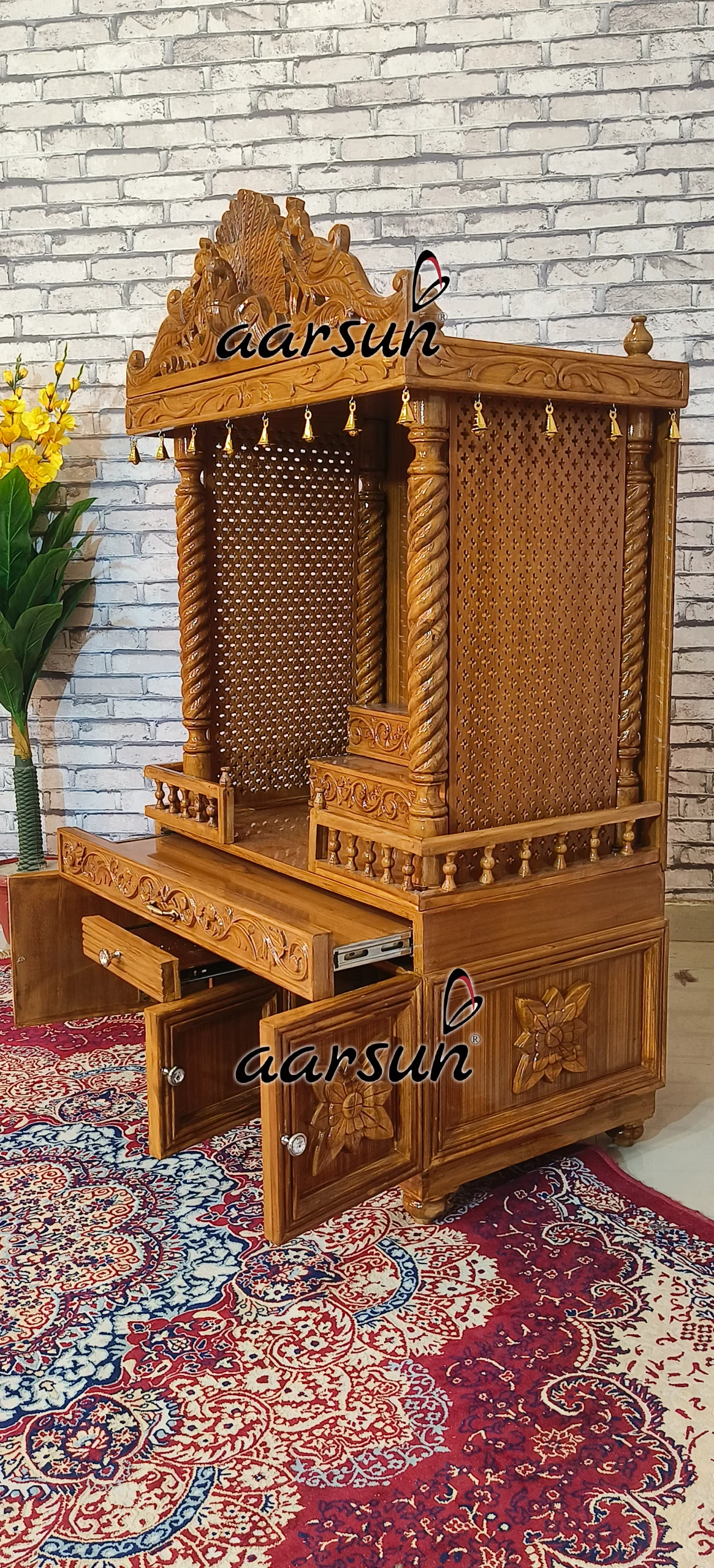 This beautiful wooden temple made on solid teak wood is just perfect to be placed in your home as all the elements are perfectly beautified by our artisans. This temple comes with steps so that it becomes easy for you to place your idols there. The drawers are also there so that you can keep the utilities there. The whole unit is hand carved , the intricate carving is perfectly visible on the temple. On the top of the temple there’s a peacock design which is adding an extra charm to the temple and the brass bells are also there on the top to maintain that auspiciousness. We provide customization on all our units so that you can enjoy the beauty of your furniture. You only need to share the required changes and we will curate a Masterpiece just made for you.  In addition to this we provide doorstep delivery. Whether you are in India or not we can ship your product to your location.