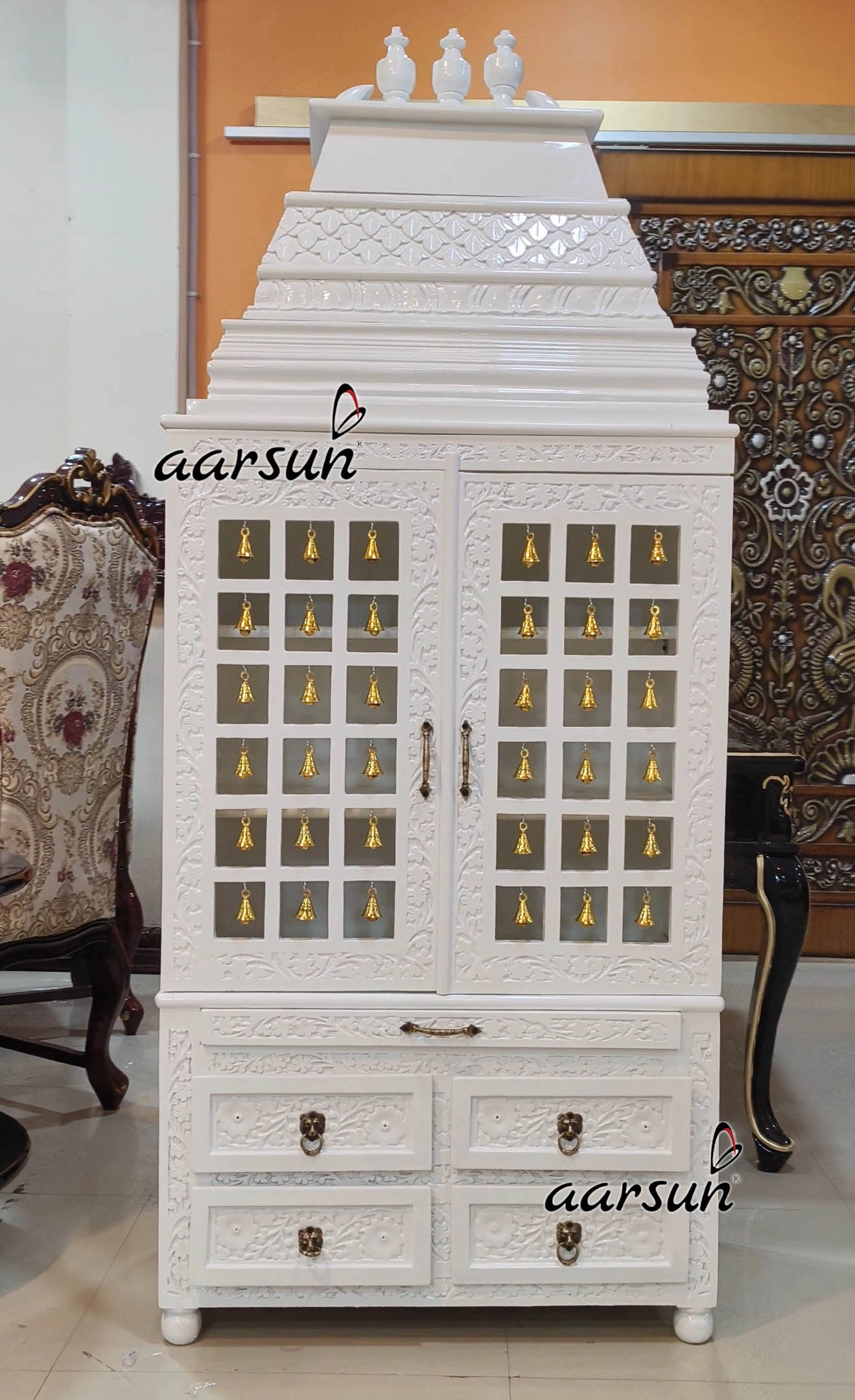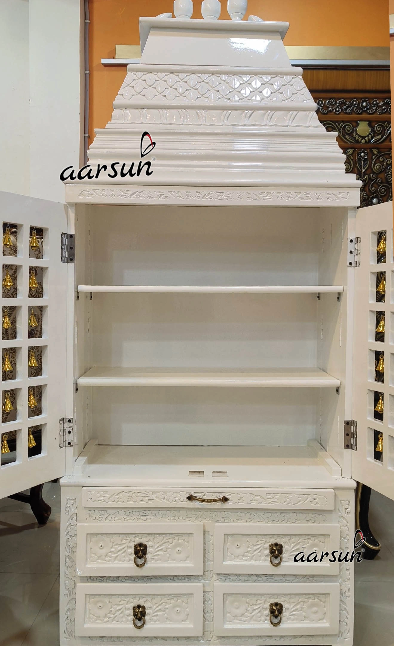 Introducing a Wooden temple with gopuram in style similar to Venkateswara temple. This temple is manufactured by incorporating the design that matches with South Indian temple architecture. The Lord Venkateswara is associated with spiritual wealth and enlightenment. This temple has five steps gopuram or gopura, the most liked design in South India. This temple is strong and durable made with premium quality teak wood. This temple is a unique combination of Gopuram at the top and brass bells in the doors. This wooden temple has a bhog tray and four pull-out drawers for keeping pooja essentials. The temple is white in color which is a spiritual color, adds a sense of calmess and serenity to the temple. The temple is easy to install and assemble. Overall temple is beautifully adorned with floral leafing hand carvings done by our skilled master artisans who are experts in this. The sound produced by brass bells is considered auspicious as it is believed to ward off the negative energies from the surroundings. Lord Venkateswara holds significance as it reminds devotees his commitment to prosperity, protection and devotion.